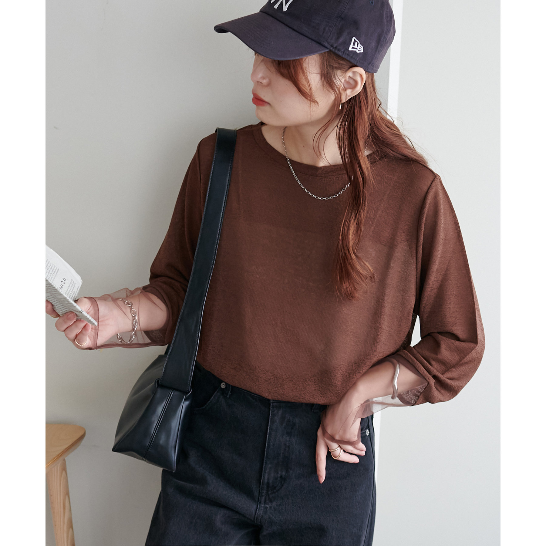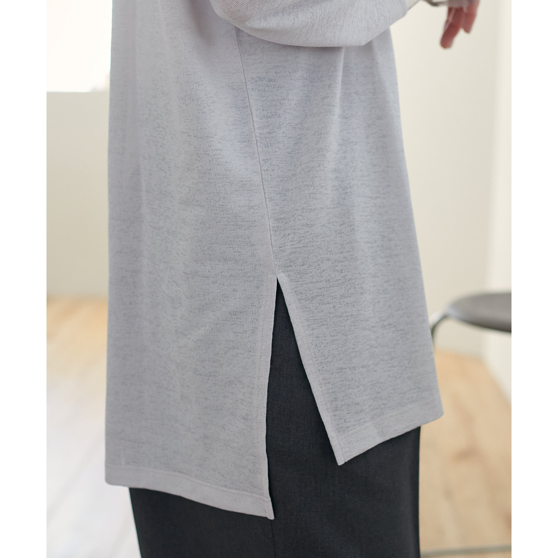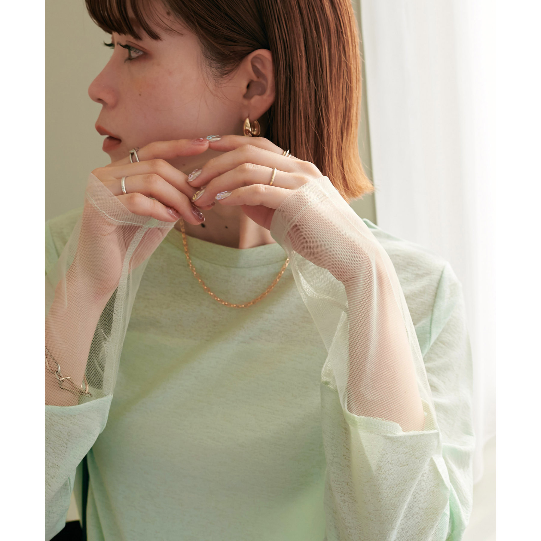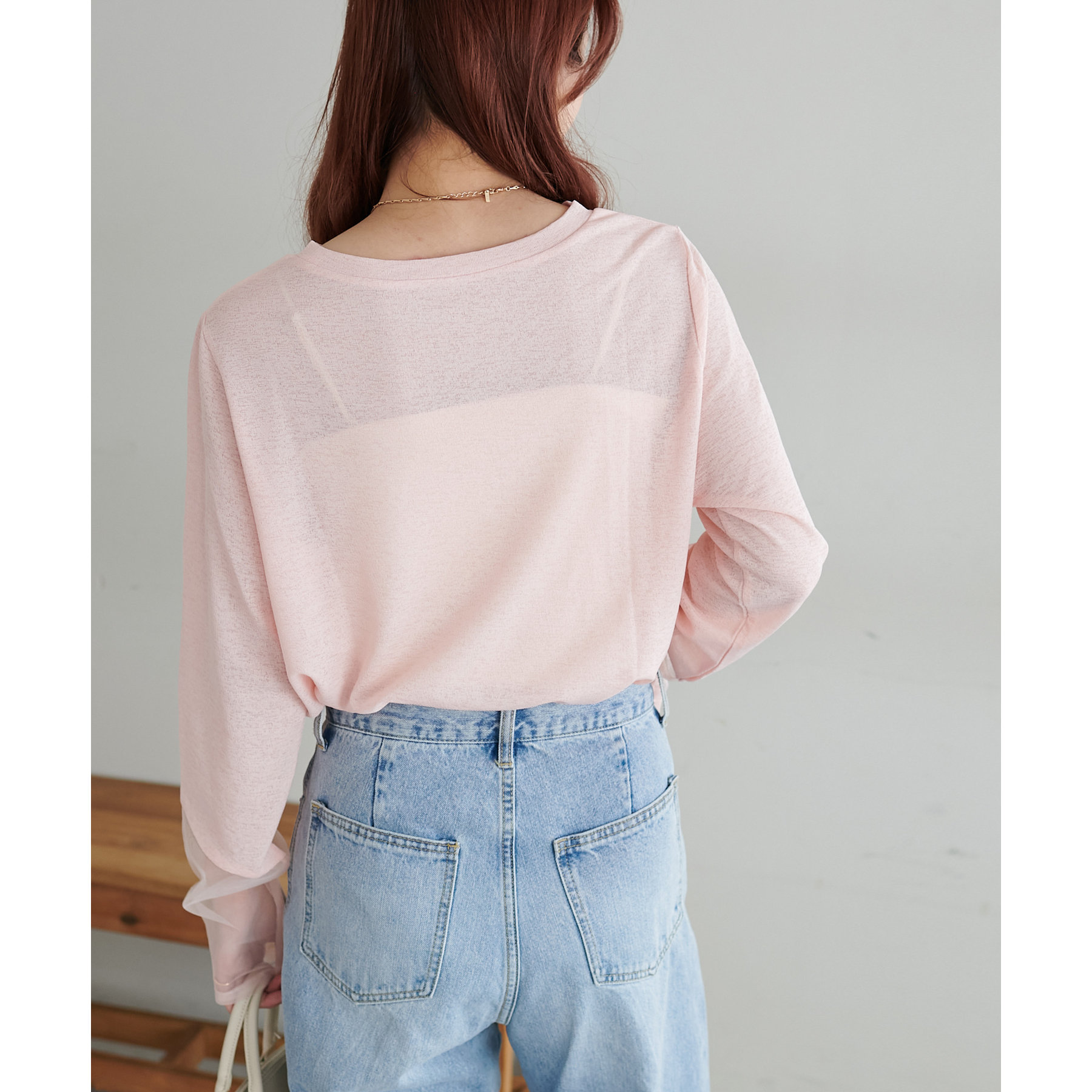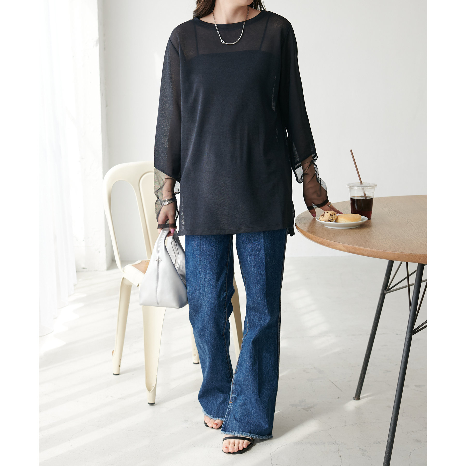 透け感が涼やかな印象を与え、シーズンスタイルにぴったりなプルオーバー。袖口の切り替えがアクセントになり、シンプルなコーディネートに抜け感を演出します。長めの着丈にはサイドスリットを入れ、タックアウトしても様になるデザインに。一枚ではもちろん、ジャケットやワンピースなどのインナーとしても活躍するアイテムです♪