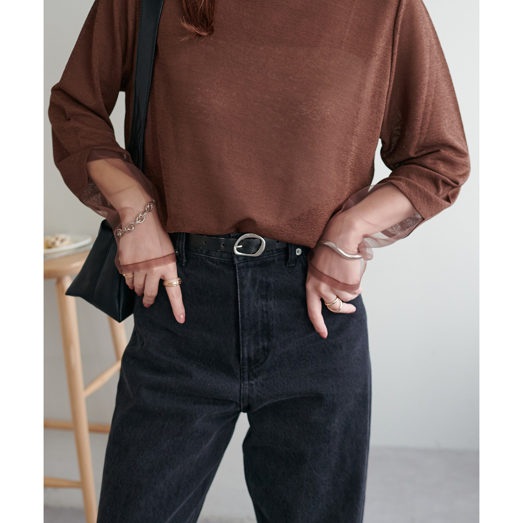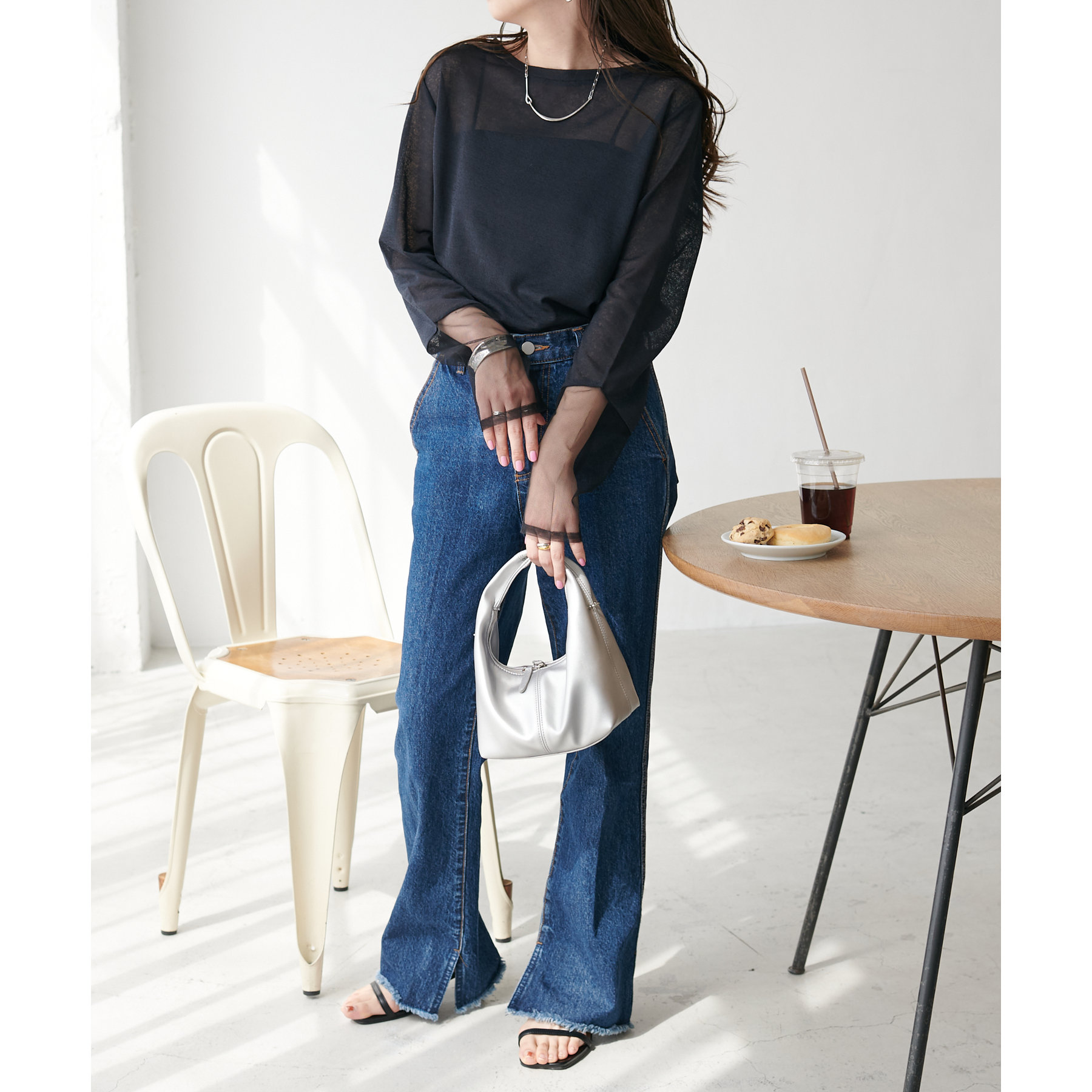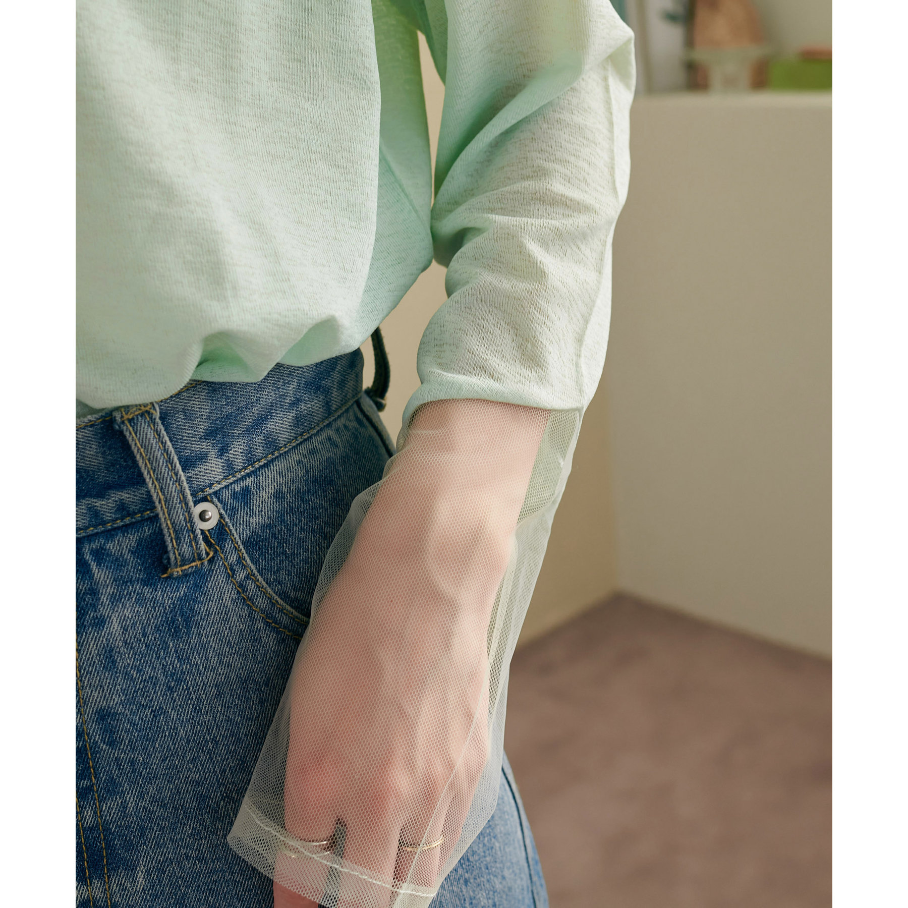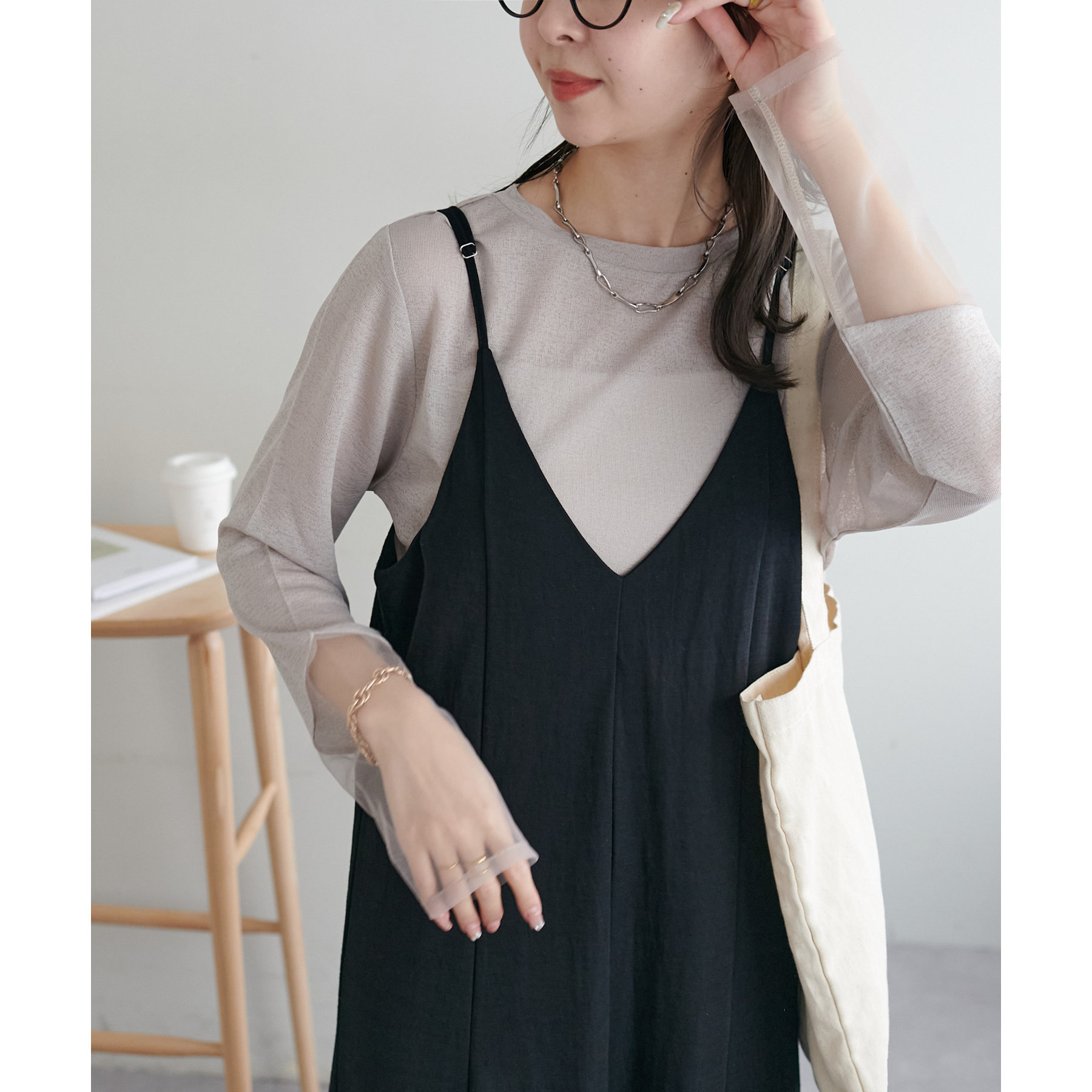 透け感が涼やかな印象を与え、シーズンスタイルにぴったりなプルオーバー。袖口の切り替えがアクセントになり、シンプルなコーディネートに抜け感を演出します。長めの着丈にはサイドスリットを入れ、タックアウトしても様になるデザインに。一枚ではもちろん、ジャケットやワンピースなどのインナーとしても活躍するアイテムです♪