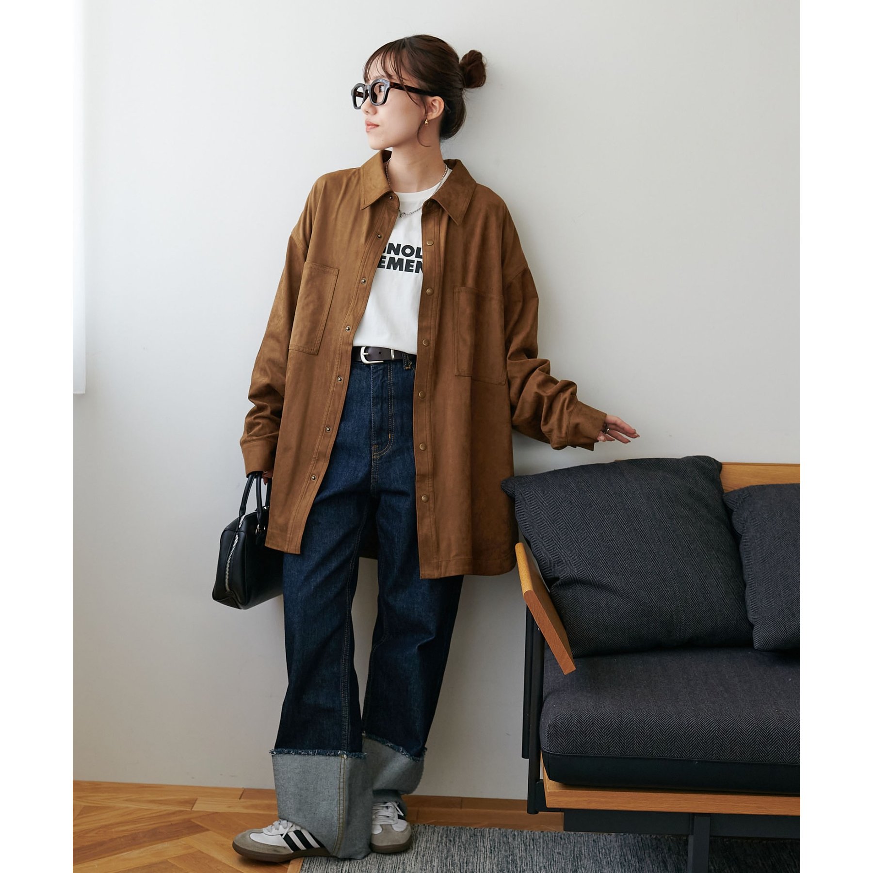 ロゴT×デニムの定番スタイルも、フェイクスエードの柔らかな質感でこなれた印象に◎