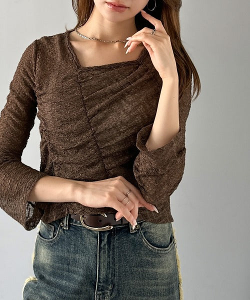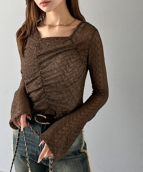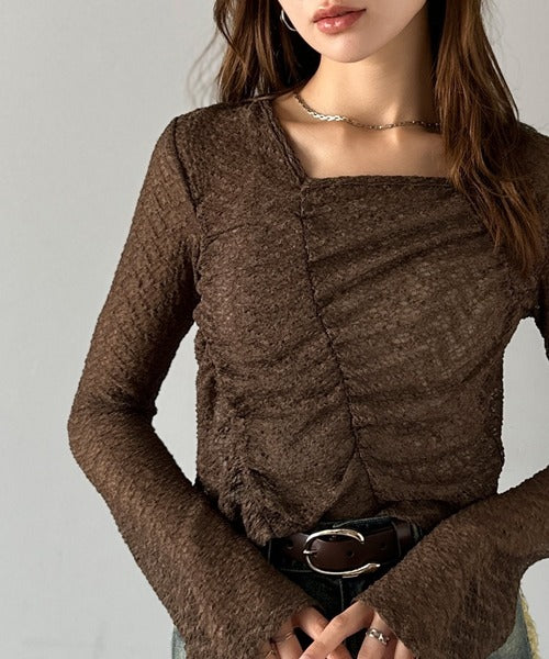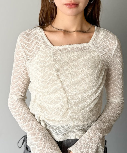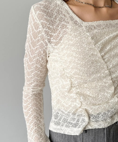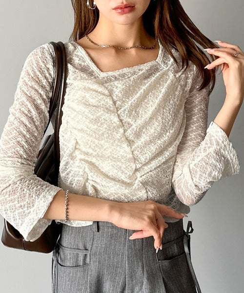 トレンドのギャザーが華やかなシアーレースアイテム。