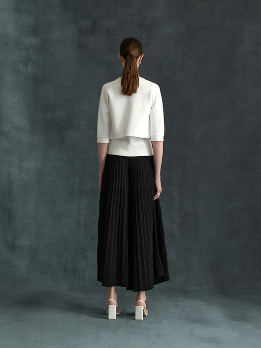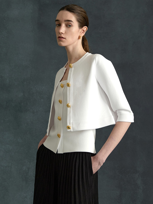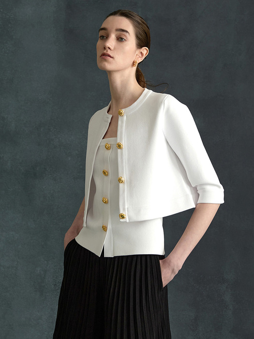 세련된 크롭 기장과 7부소매 디자인이 현대적인 감각을 더하며, 골드 버튼 디테일이 고급스러운 포인트를 선사합니다.