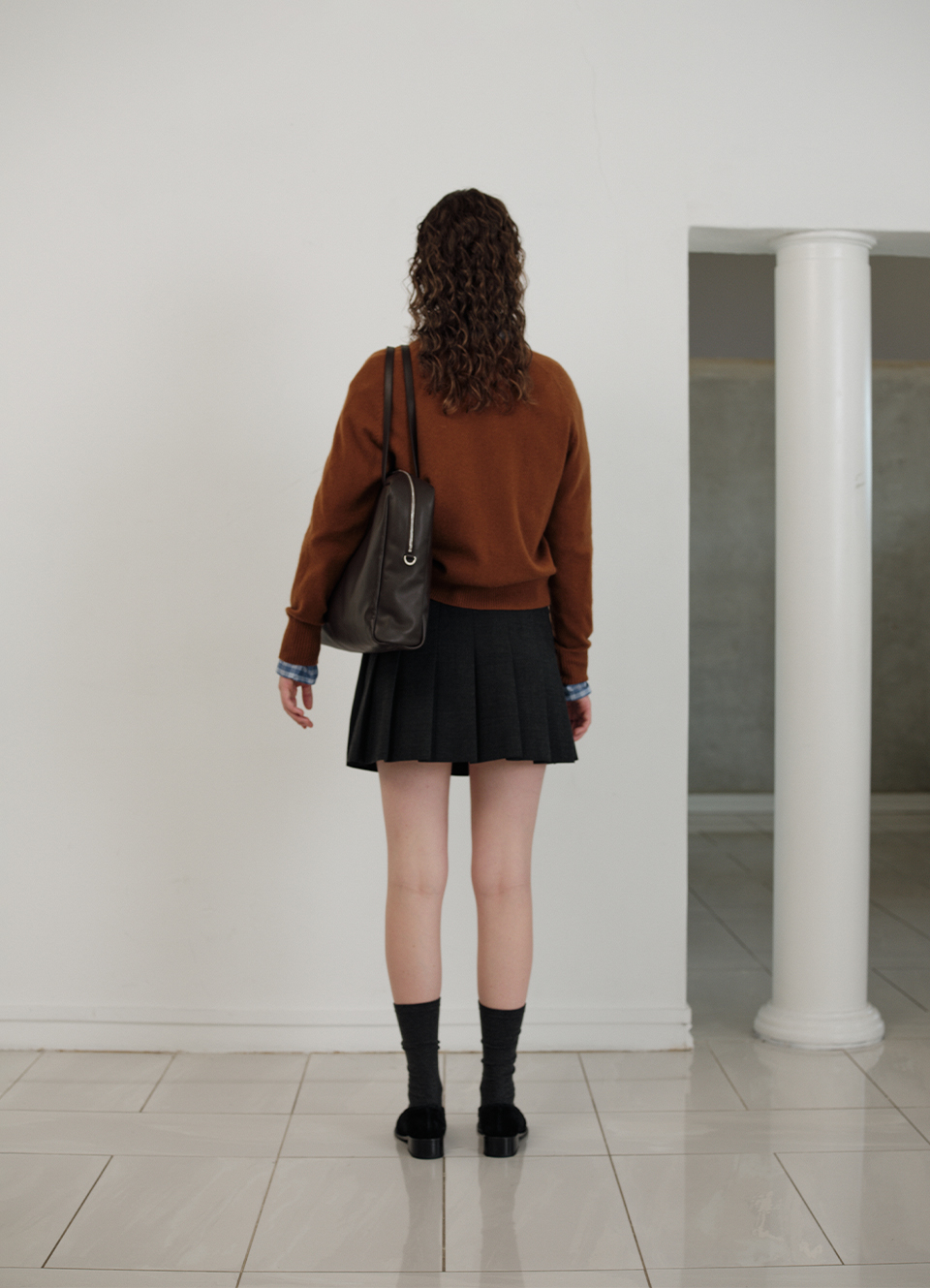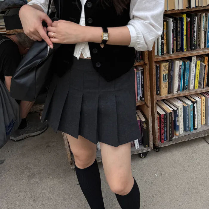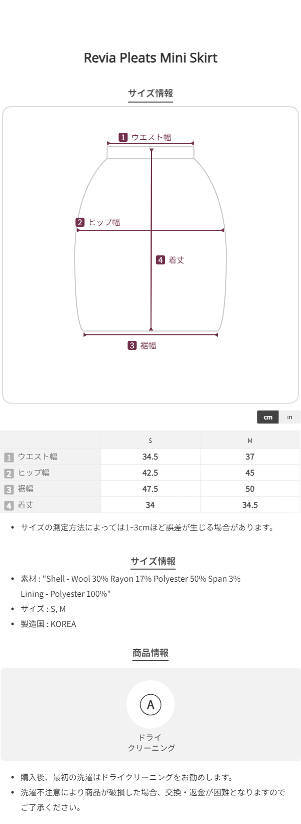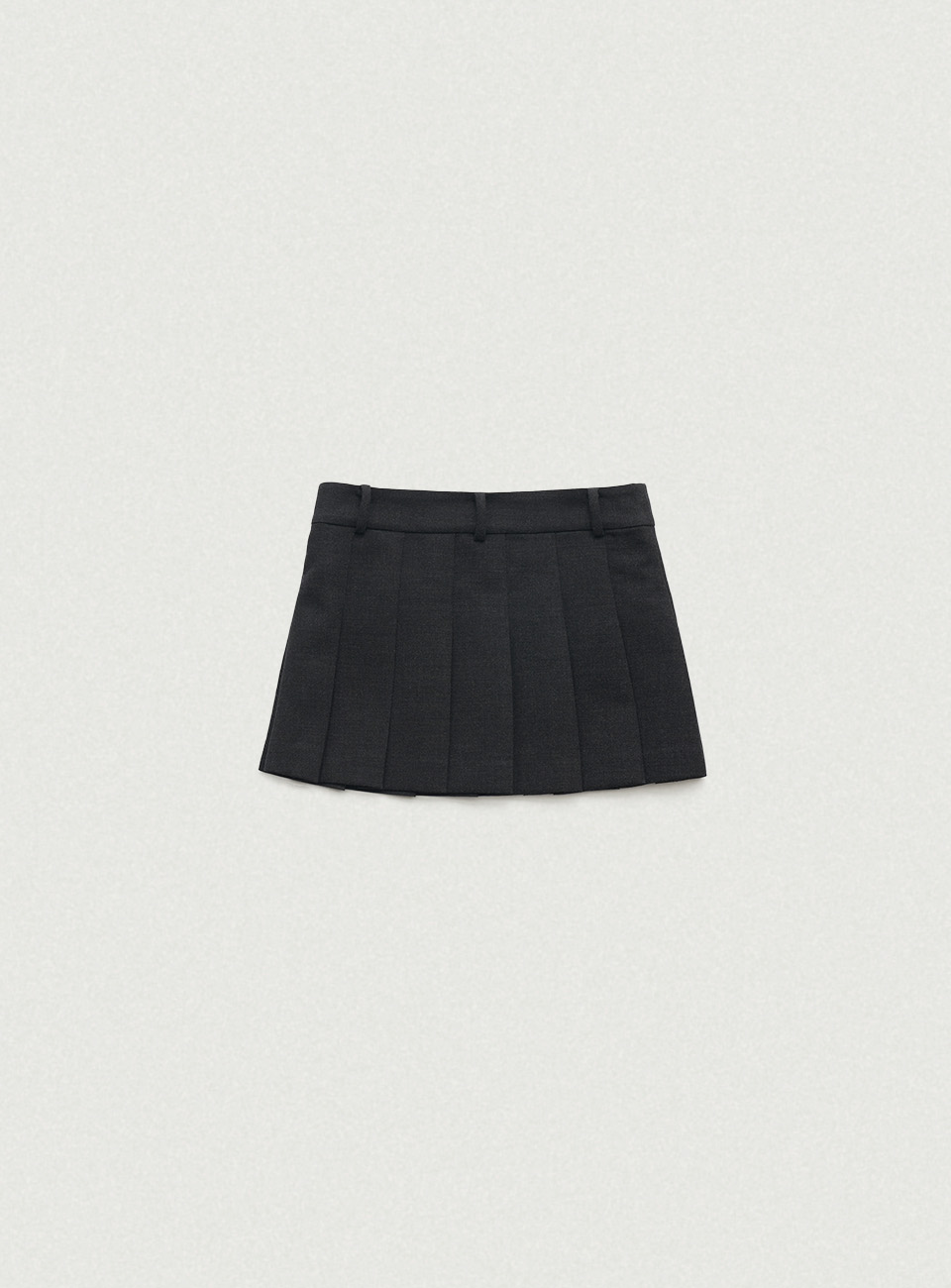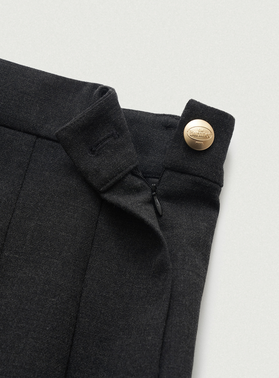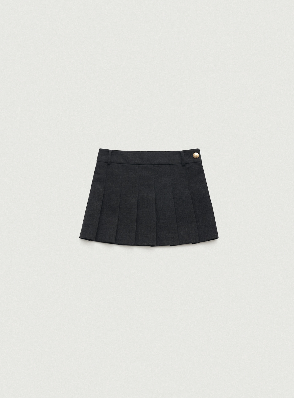 チャコールカラーの柔らかくしっかりとしたテクスチャーが特徴のウール混織布 太ももくらいの長さとファスナーとボタンロック方式仕様のミニスカートタイプ 金属ボタンやプリーツ、エイラインフィットなどのディテール 内部全体を包み込む柔らかな質感の裏地仕上げ Shell - Polyester 65% Rayon 30% Wool 3% Spandex 2% Lining - Polyester 100% Charcoal Wool Blend Zip & button fastening Pleated フルライニング Thigh length Aラインフィット