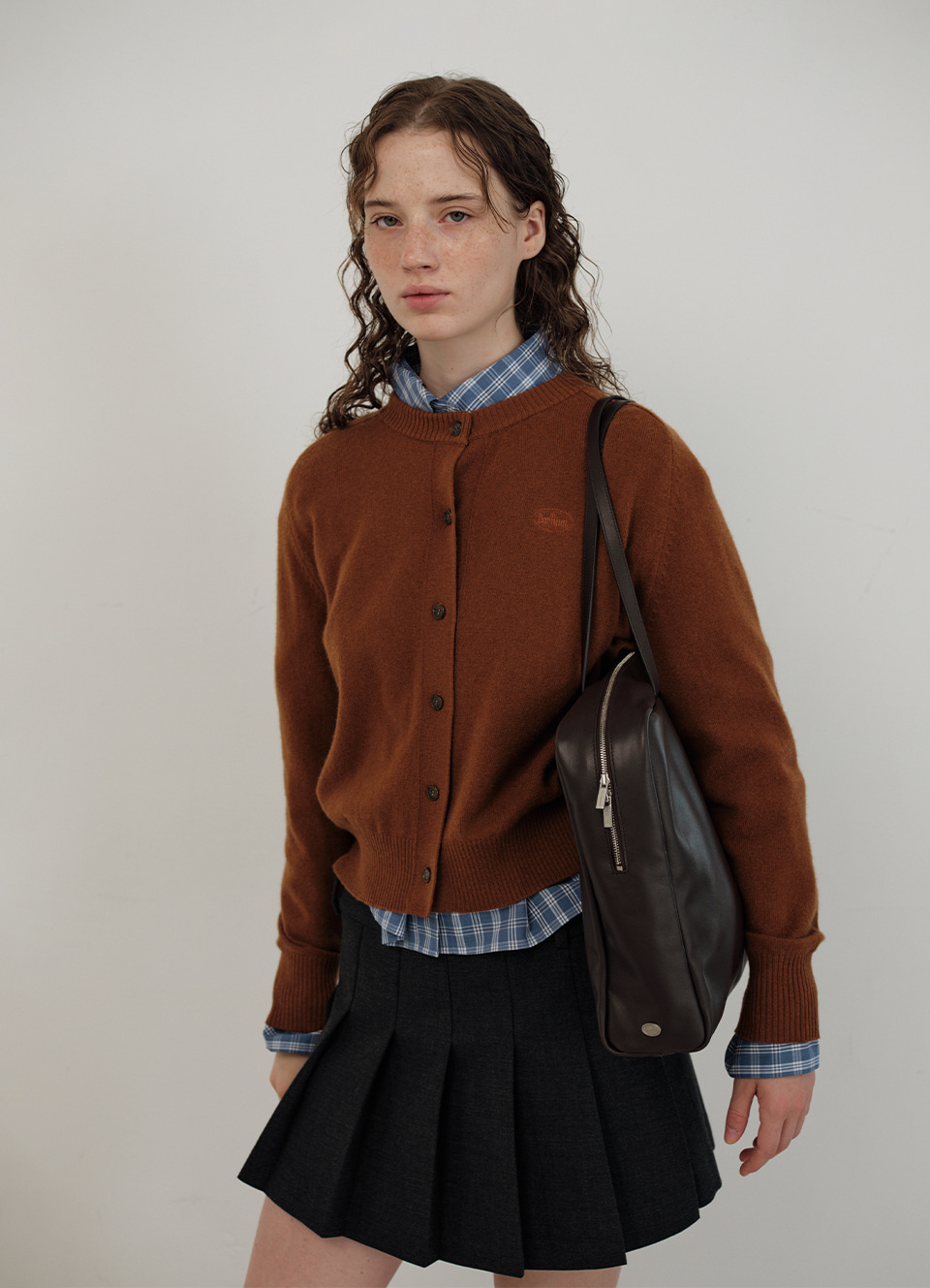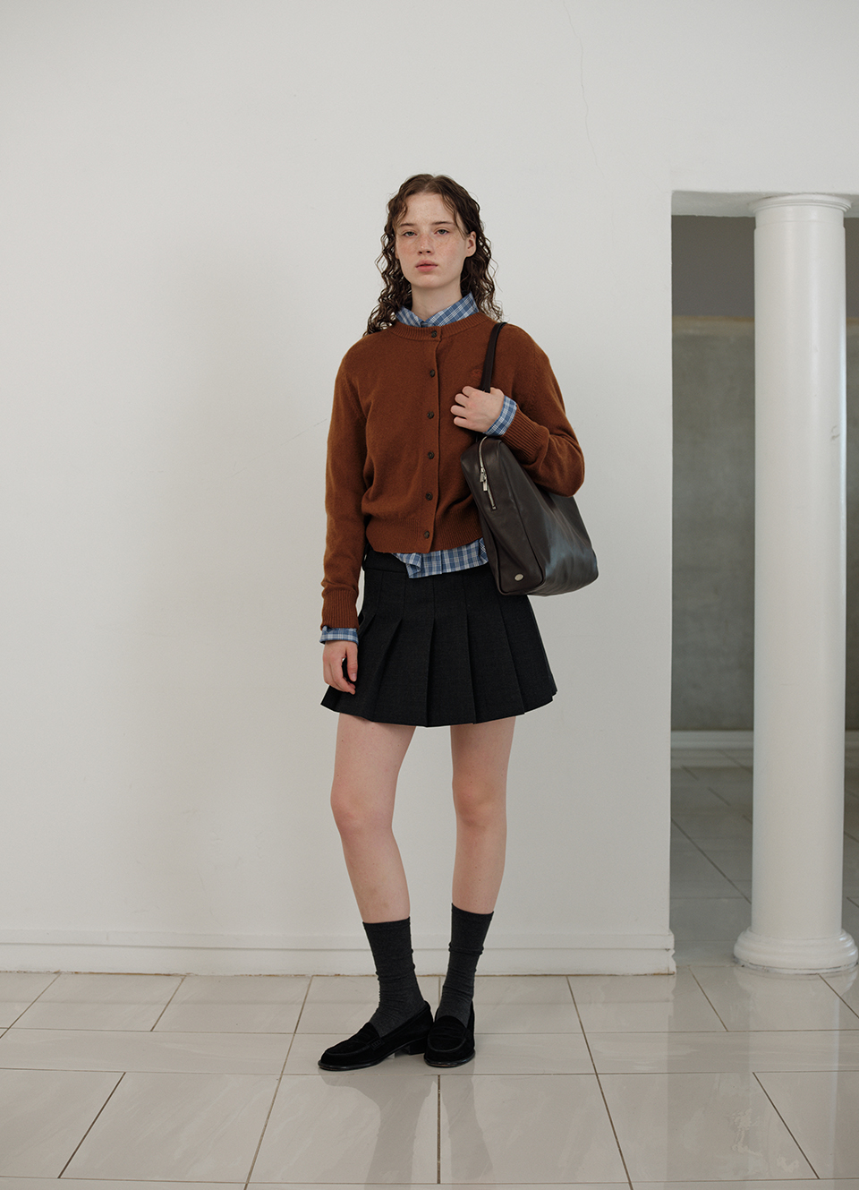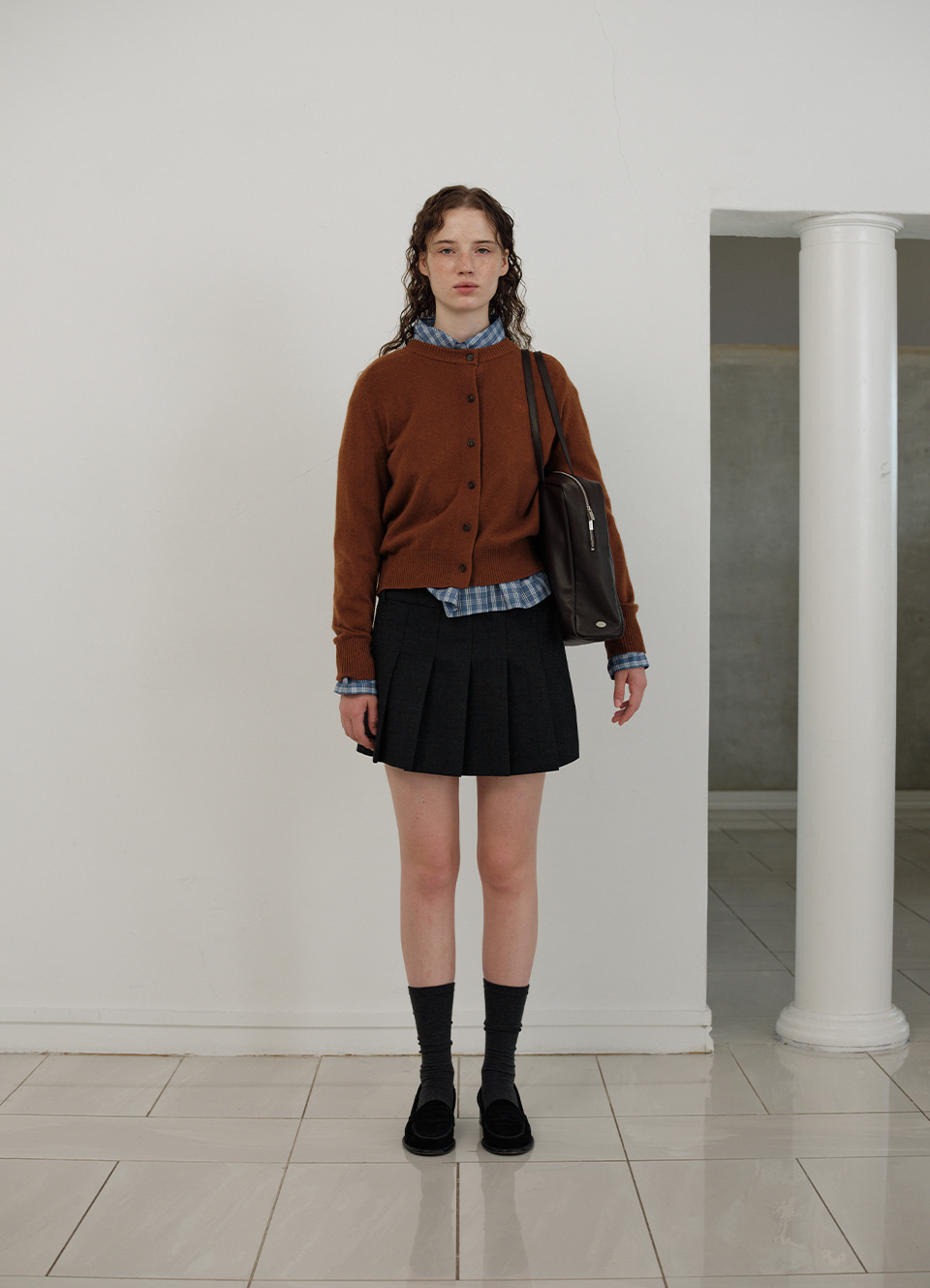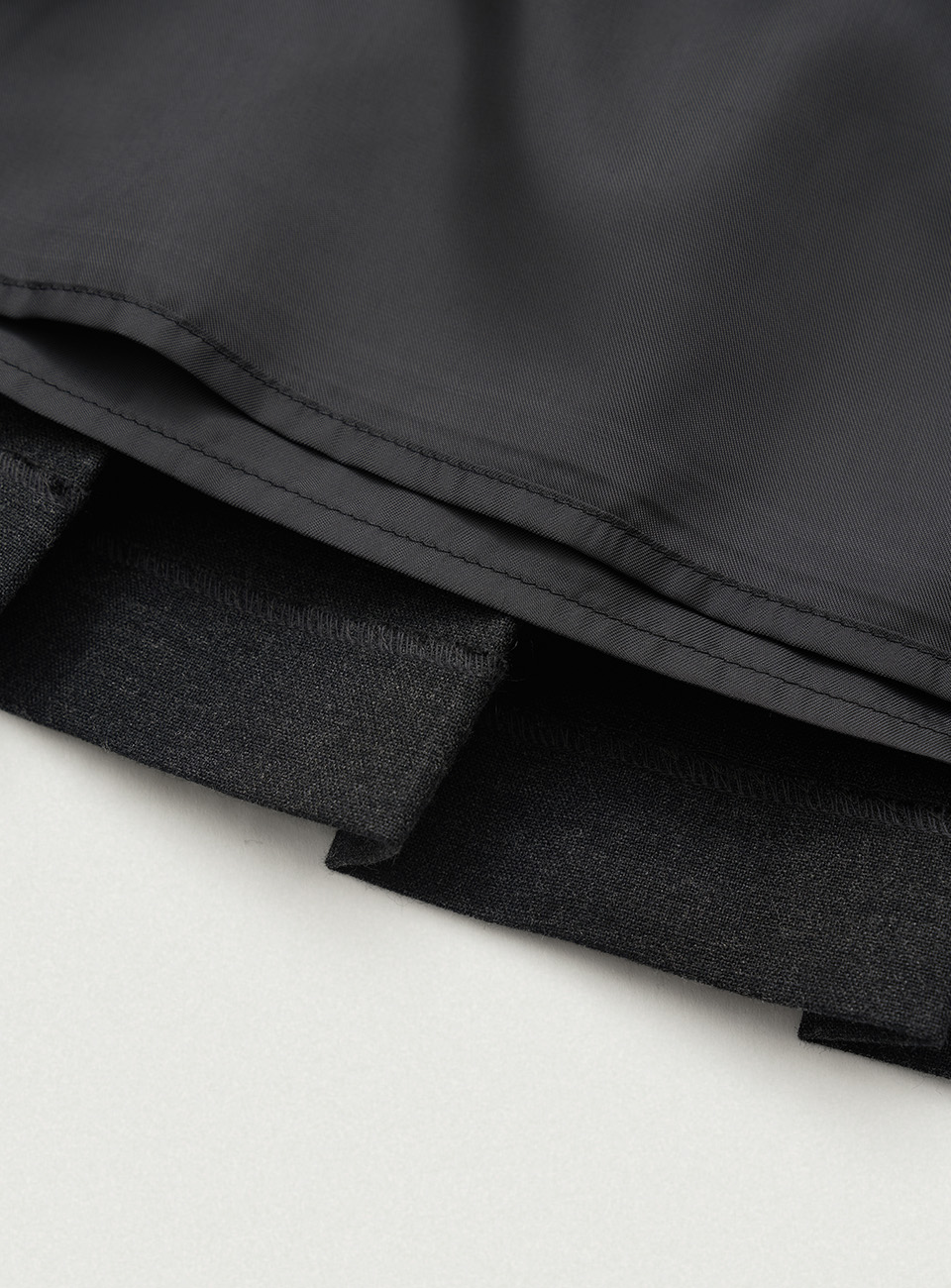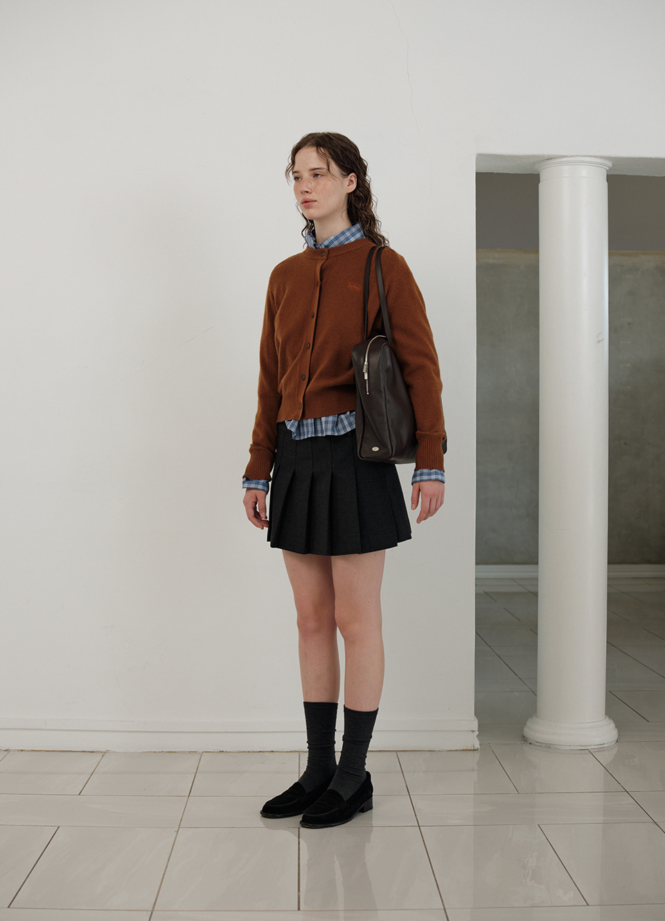 チャコールカラーの柔らかくしっかりとしたテクスチャーが特徴のウール混織布 太ももくらいの長さとファスナーとボタンロック方式仕様のミニスカートタイプ 金属ボタンやプリーツ、エイラインフィットなどのディテール 内部全体を包み込む柔らかな質感の裏地仕上げ Shell - Polyester 65% Rayon 30% Wool 3% Spandex 2% Lining - Polyester 100% Charcoal Wool Blend Zip & button fastening Pleated フルライニング Thigh length Aラインフィット