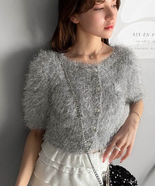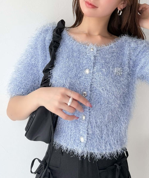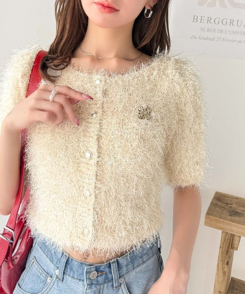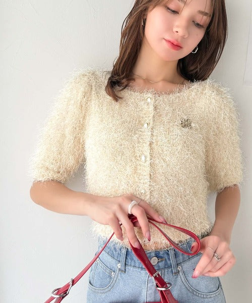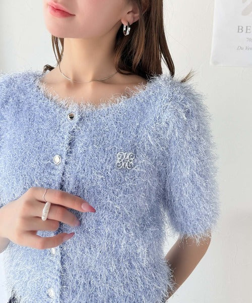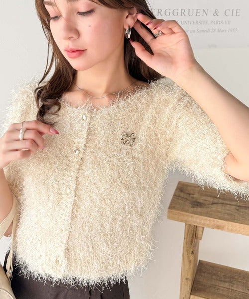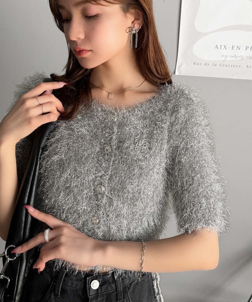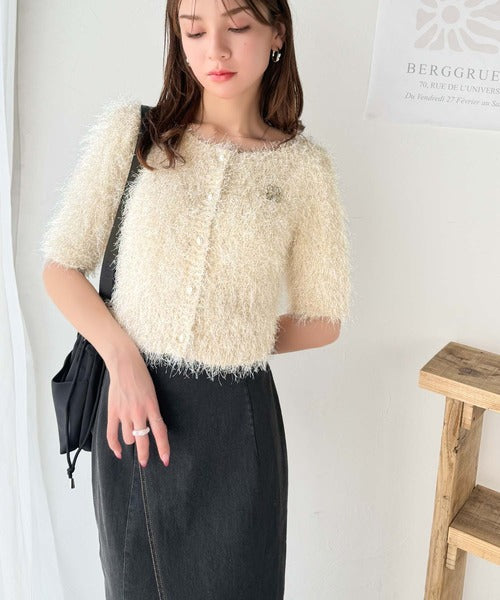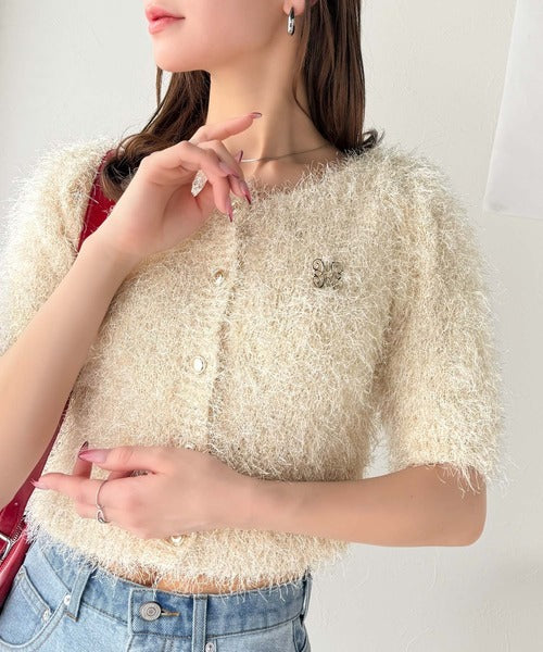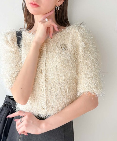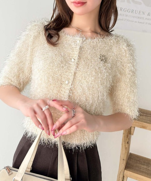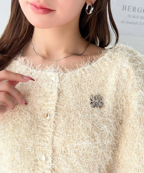 上品なラメ入りシャギー素材とブローチが目を惹くカーディガン。
