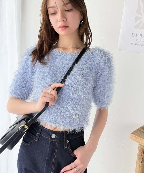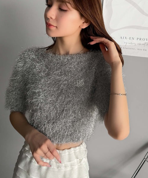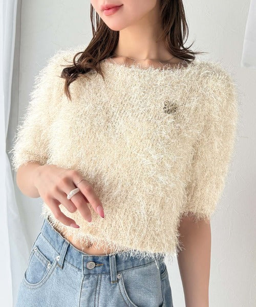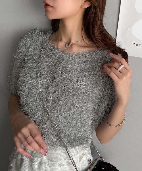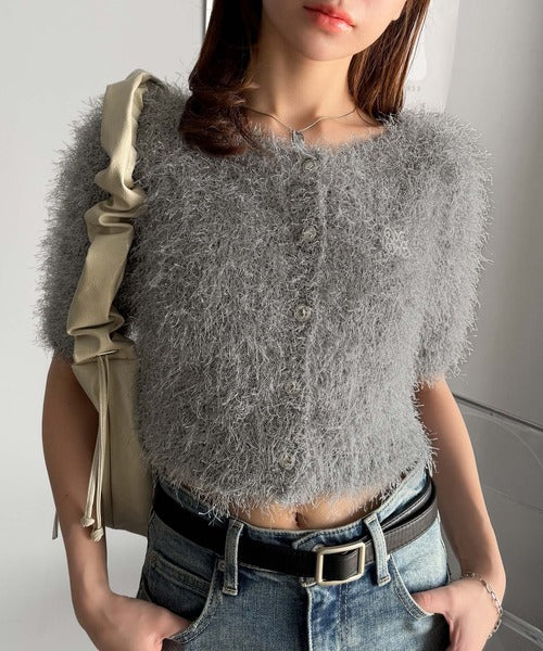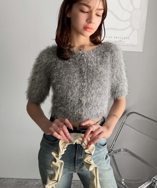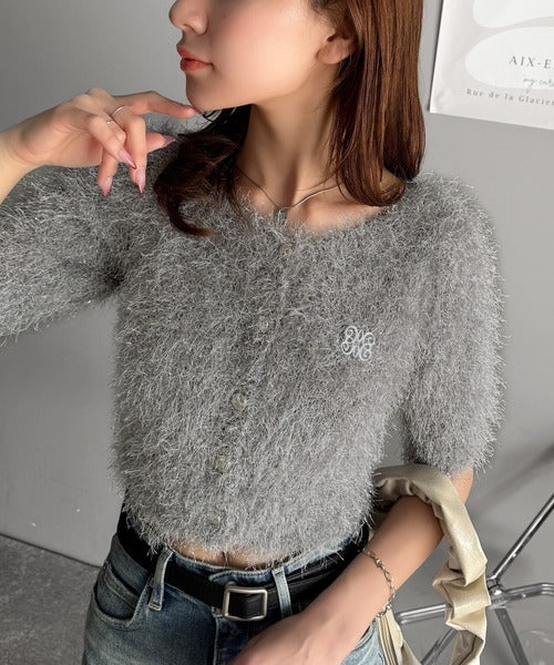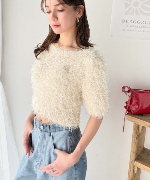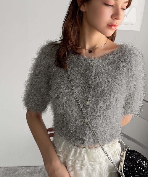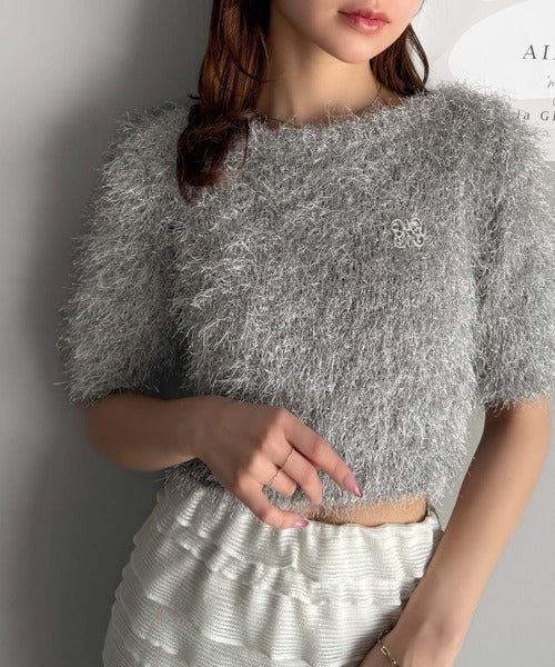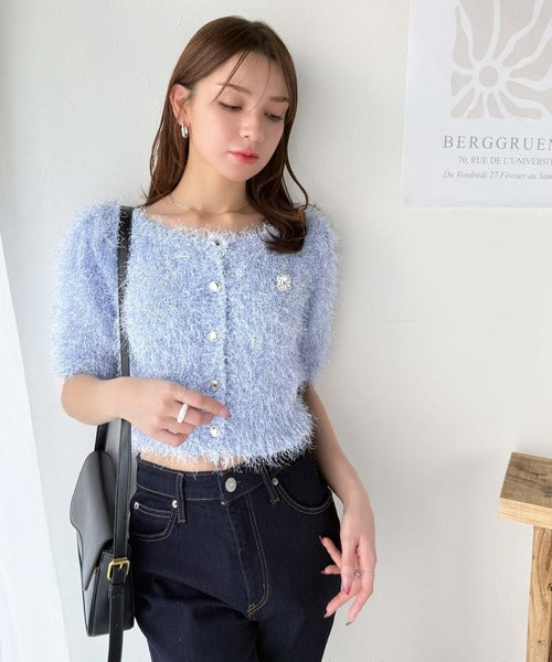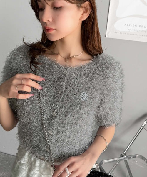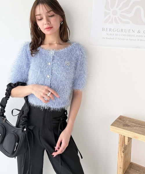 上品なラメ入りシャギー素材とブローチが目を惹くカーディガン。