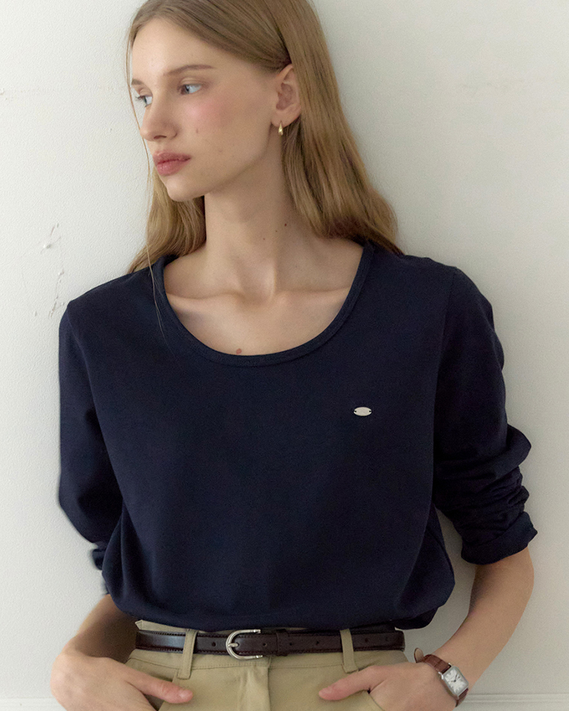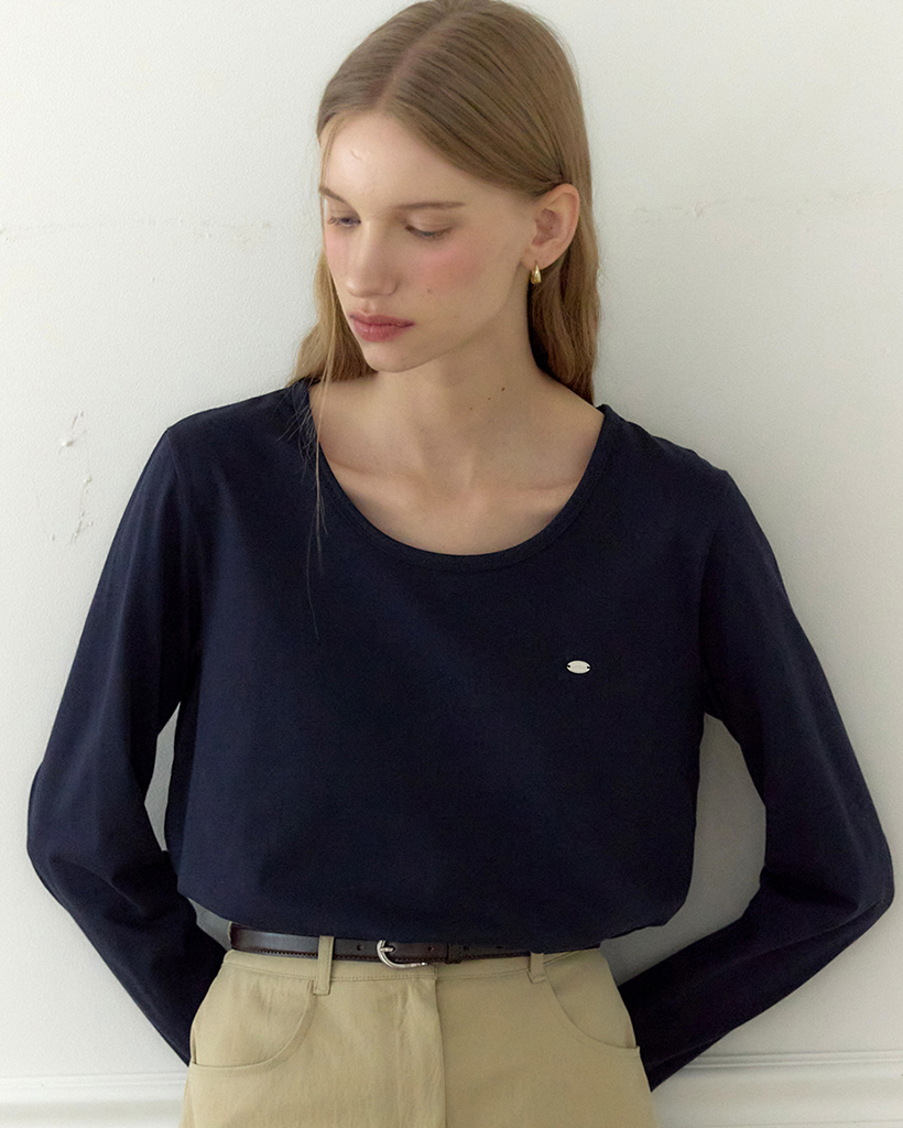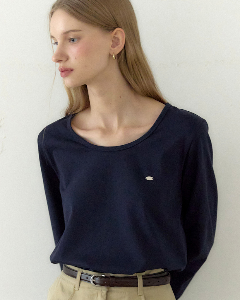 Logo Silky U-neck Sleeve T-shirt - Navy