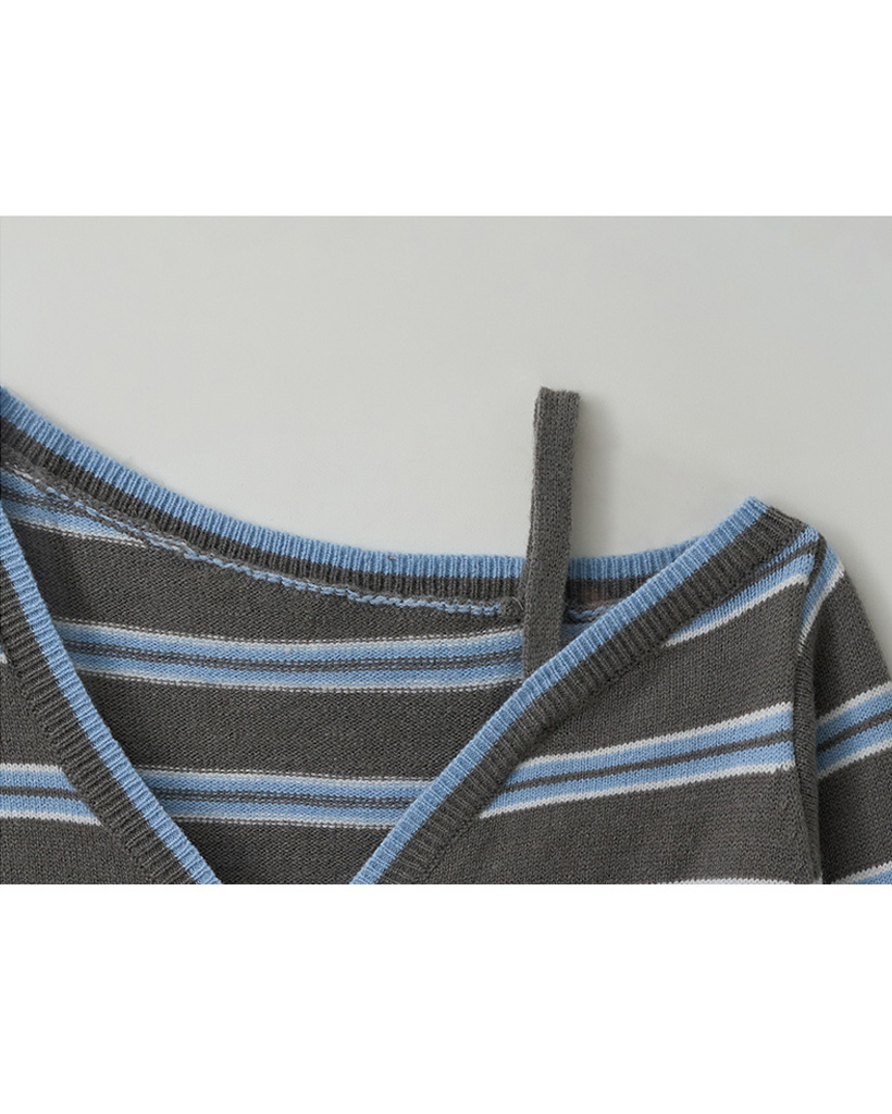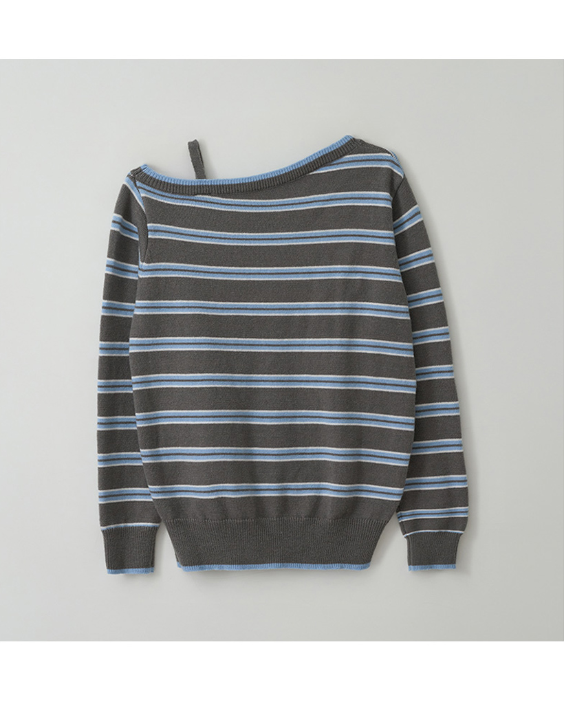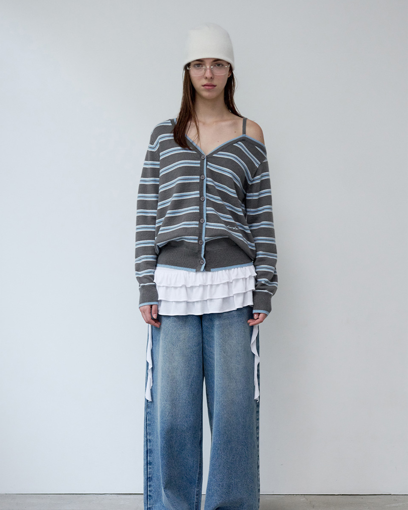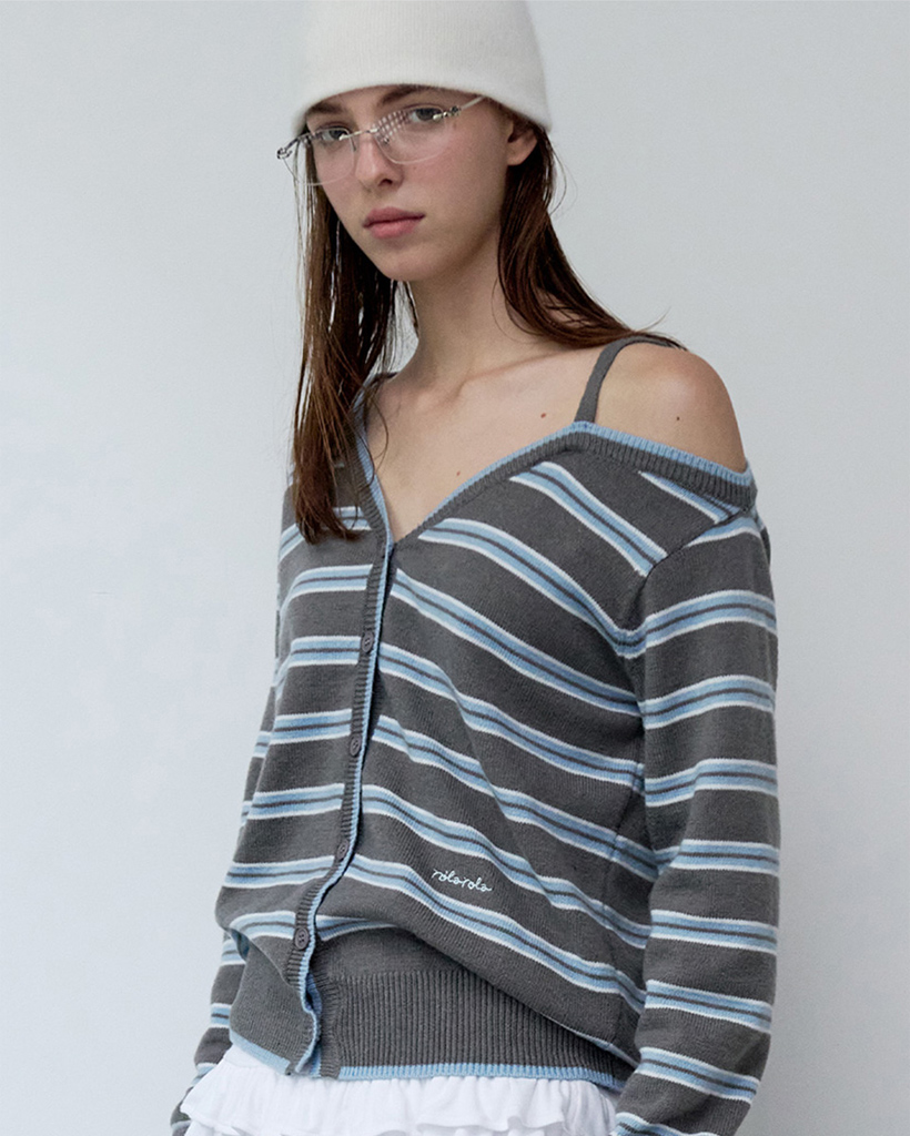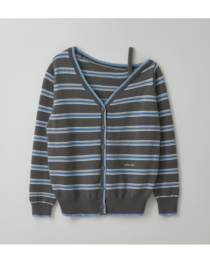 ONE OFF SHOULDER STRIPE WOOL BLENDED CARDIGAN GRAY