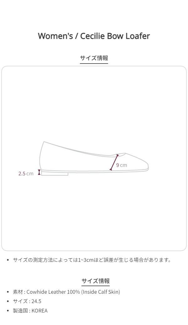 つま先の愛らしいボウディテールが感覚的な、セシリー ボウ ローファーです。スムードなシェイプのソフトスクエアトゥデザインに、つま先に加えた繊細なボウディテールで、淡白でクラシックな魅力が感じられます。足をやさしく包み込む上質なナパラムスキン(Nappa Lambskin)素材で、柔らかくしなやかな羊革と低めのヒールで作られているため、履き心地がとても軽く快適なデイリーアイテムです。アウトソールにはイタリアの名品Vibram(ビブラム)社のソールを使用し、安定した履き心地と耐久性を加えました。すべてのアウトフィットに快適でクラシックにマッチすることを願って細部まで丁寧に作り、スタイルに洗練された感覚を加えてくれるアイテムです。ほのかにスカイブルートーンを帯びたアイボリーカラーで、高級感のある魅力を感じられるクリームカラーですㆍアッパー Nappa Lambskinㆍライニング Cow Leather, Cottonㆍソフト スクエアトゥㆍボウ ディテールㆍヒール 1cmㆍアウトソール/ヒール Vibram Sole*サイズはジャストサイズをおすすめします。*ラムスキン素材は天然皮革の特性上、シワや斑点、色味の差、シボ(結)の跡、血筋、スクラッチ、カッティング仕上げ部分の粉落ち等がある場合があります。汚れや色移りに弱く、水分を避けた丁寧なお手入れが必要です(雪・雨 注意)。製品の特性上、ヒールやアウトソールに微細なスクラッチや汚れがある場合がありますので、あらかじめご了承ください。*1:1の受注制作商品につき、ご注文後のキャンセル/交換/返品/返金はできません。受注制作期間は営業日基準で10~14日程度かかります
