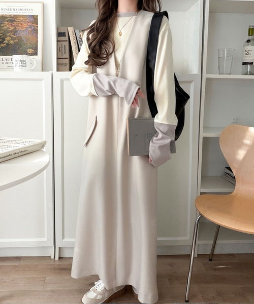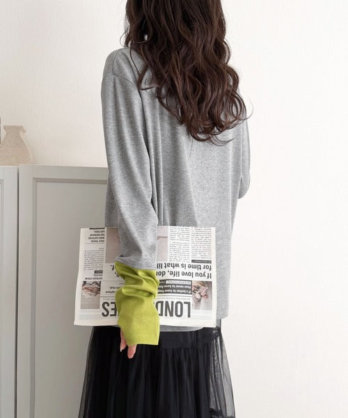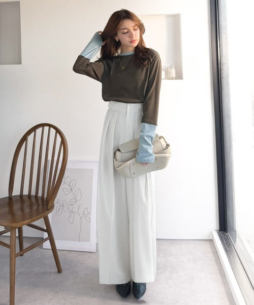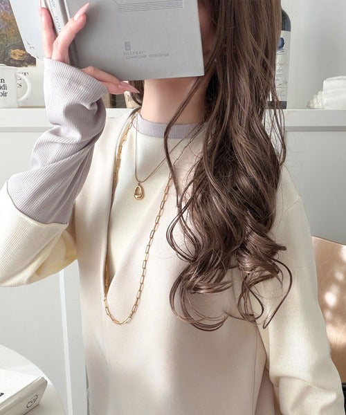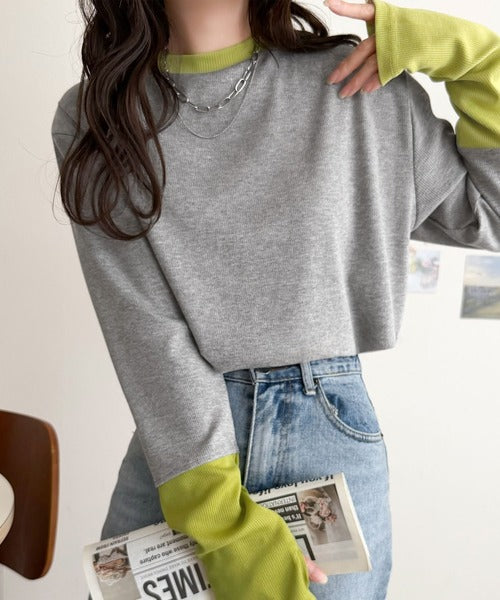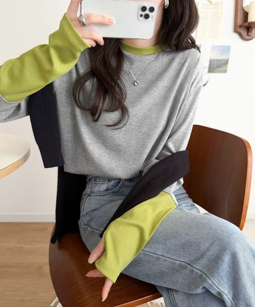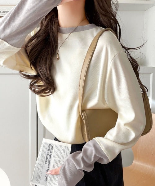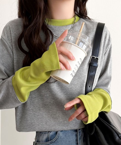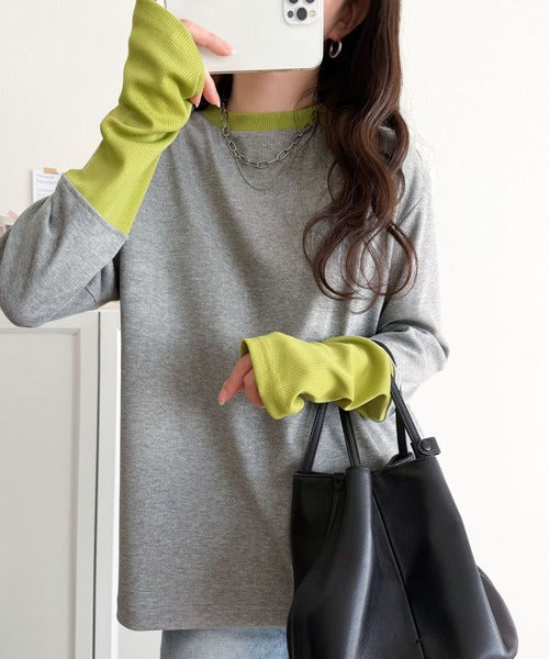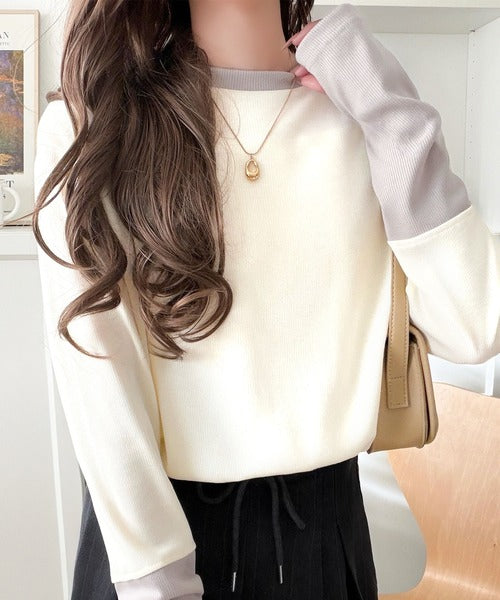 レイヤード見えで仕上げる、きれいめモード。指穴(サムホール)付き袖配色切り替えテレコリブニットプルオーバー(長袖) ce1330082