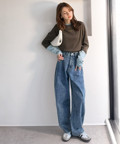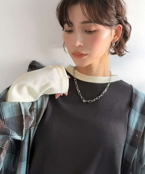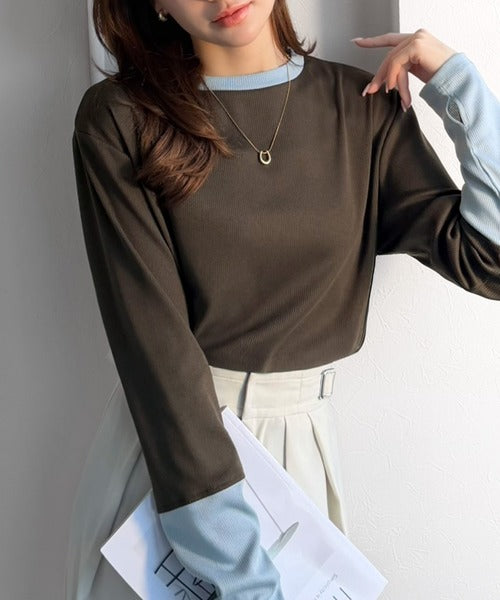 一枚でレイヤード見えが叶う、袖配色切り替えテレコリブニット。