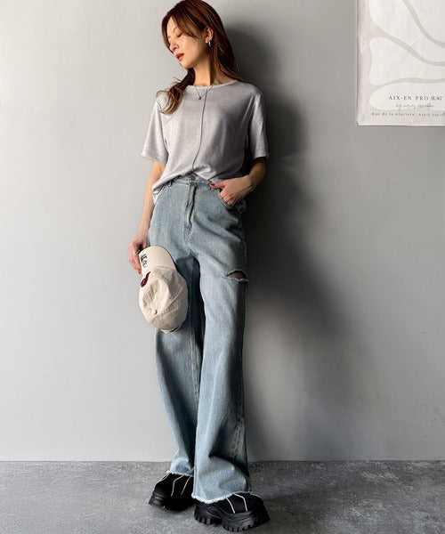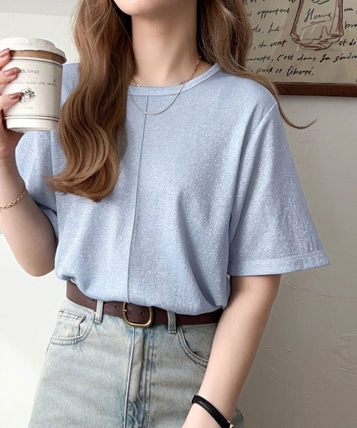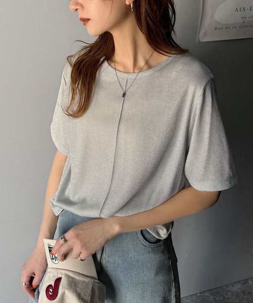 スッキリ見えシルエットが魅力のセンターメロウシアーラメTシャツ。
