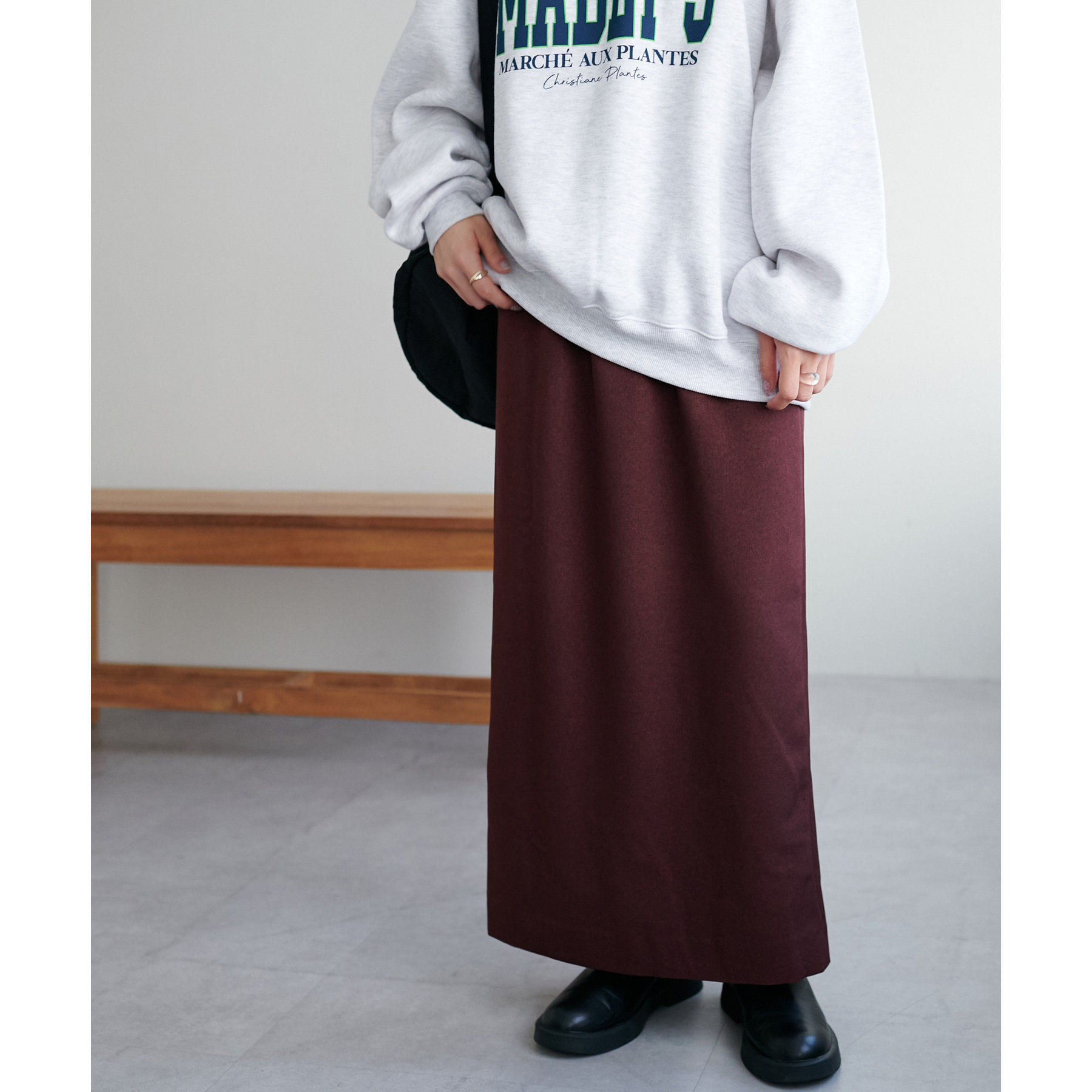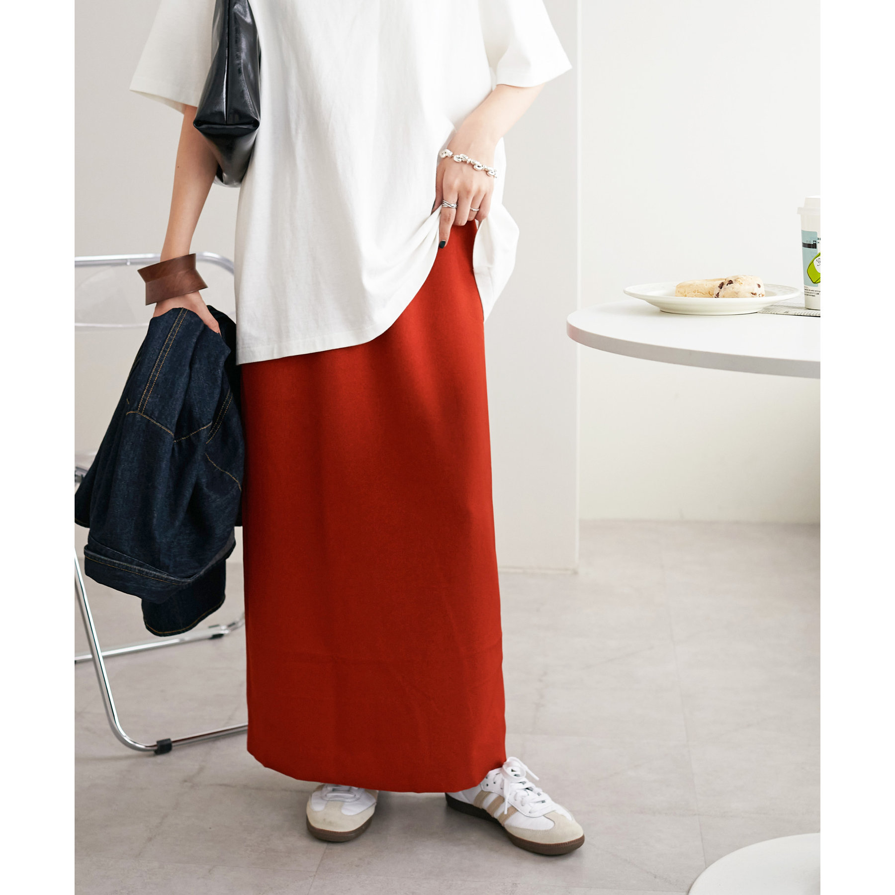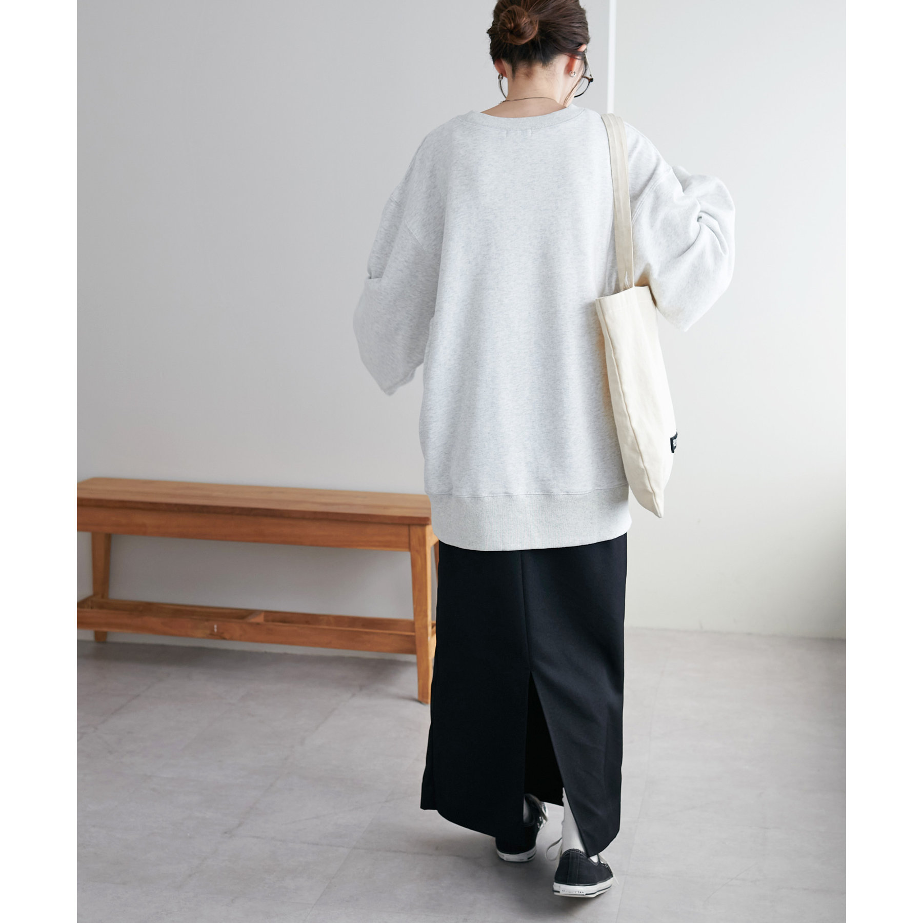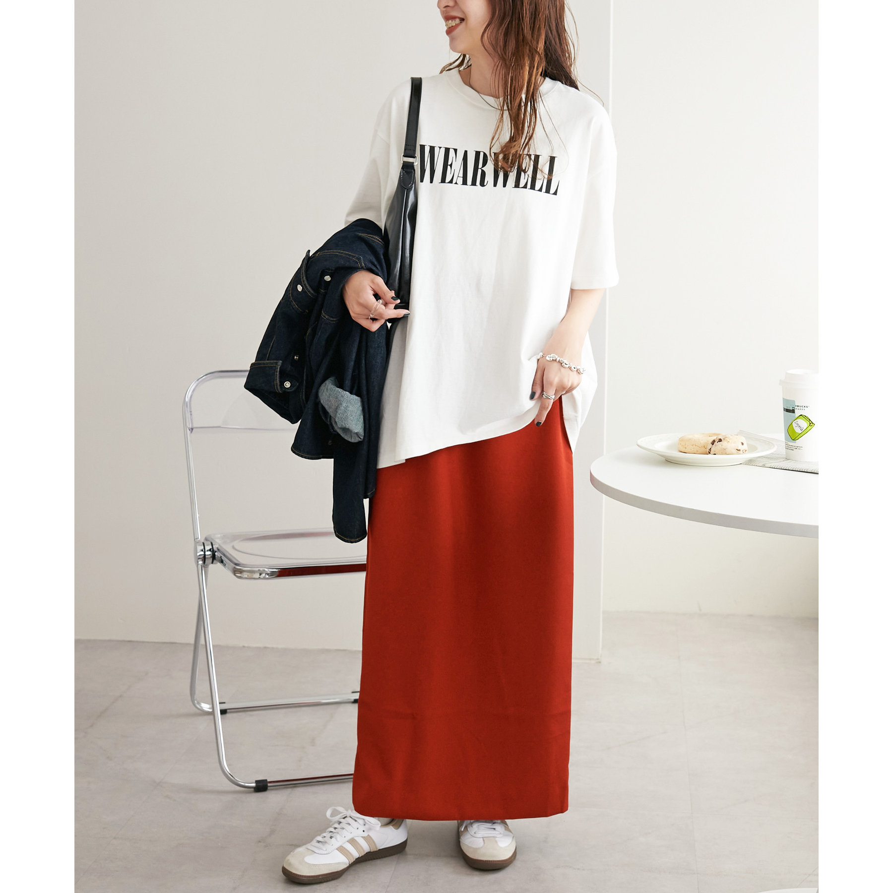 ショート丈のアイテムだけでなく、ルーズなシルエットのアイテムとも相性抜群です。