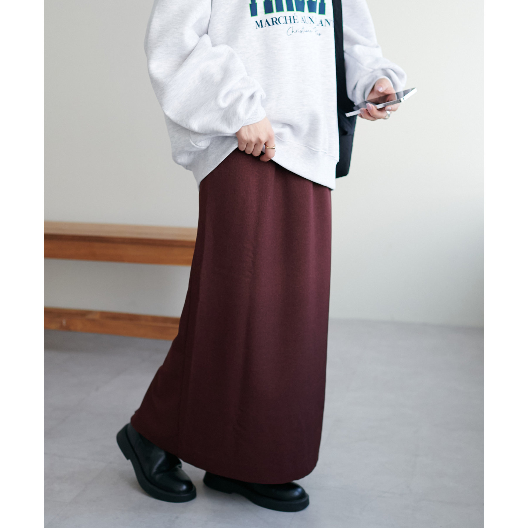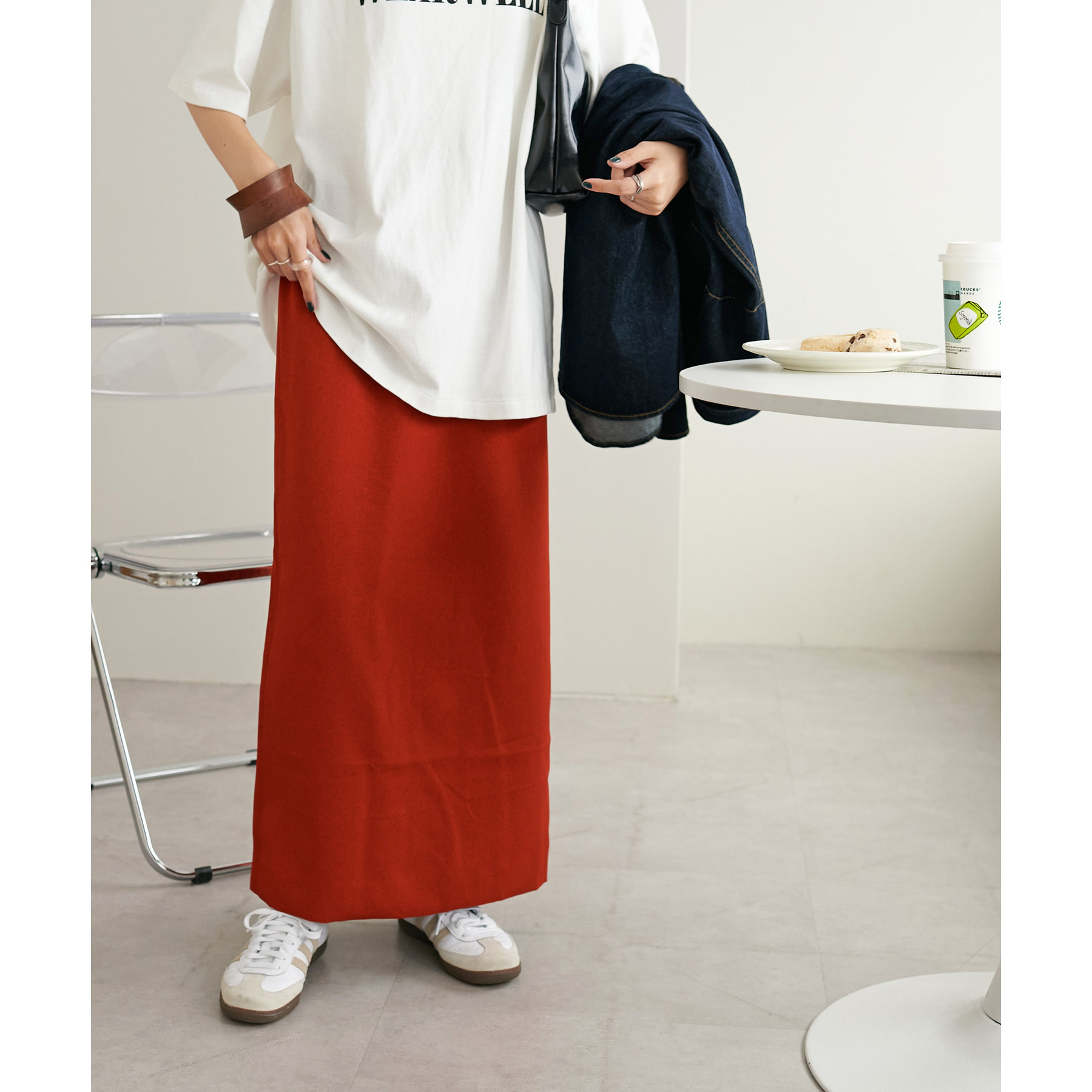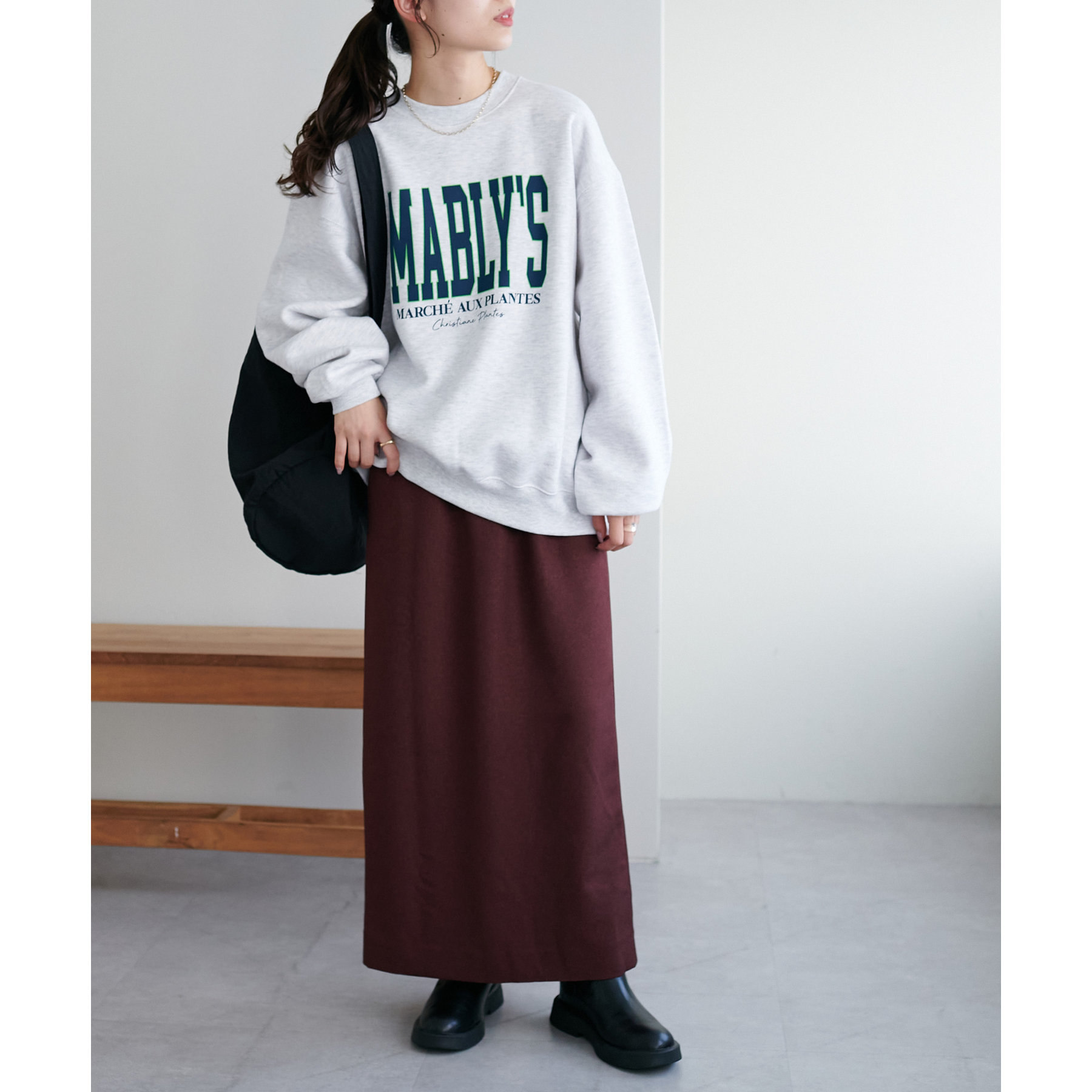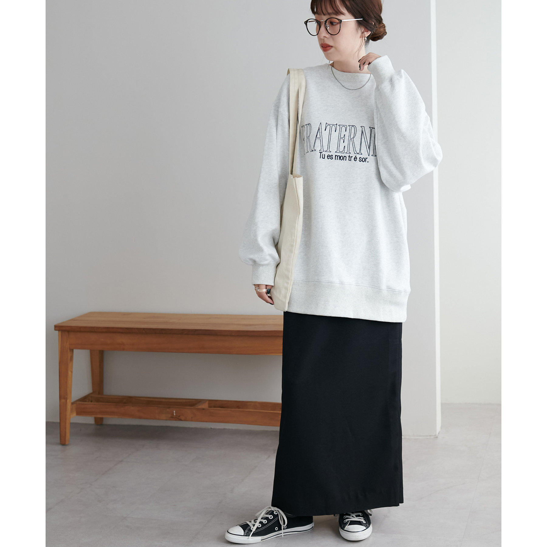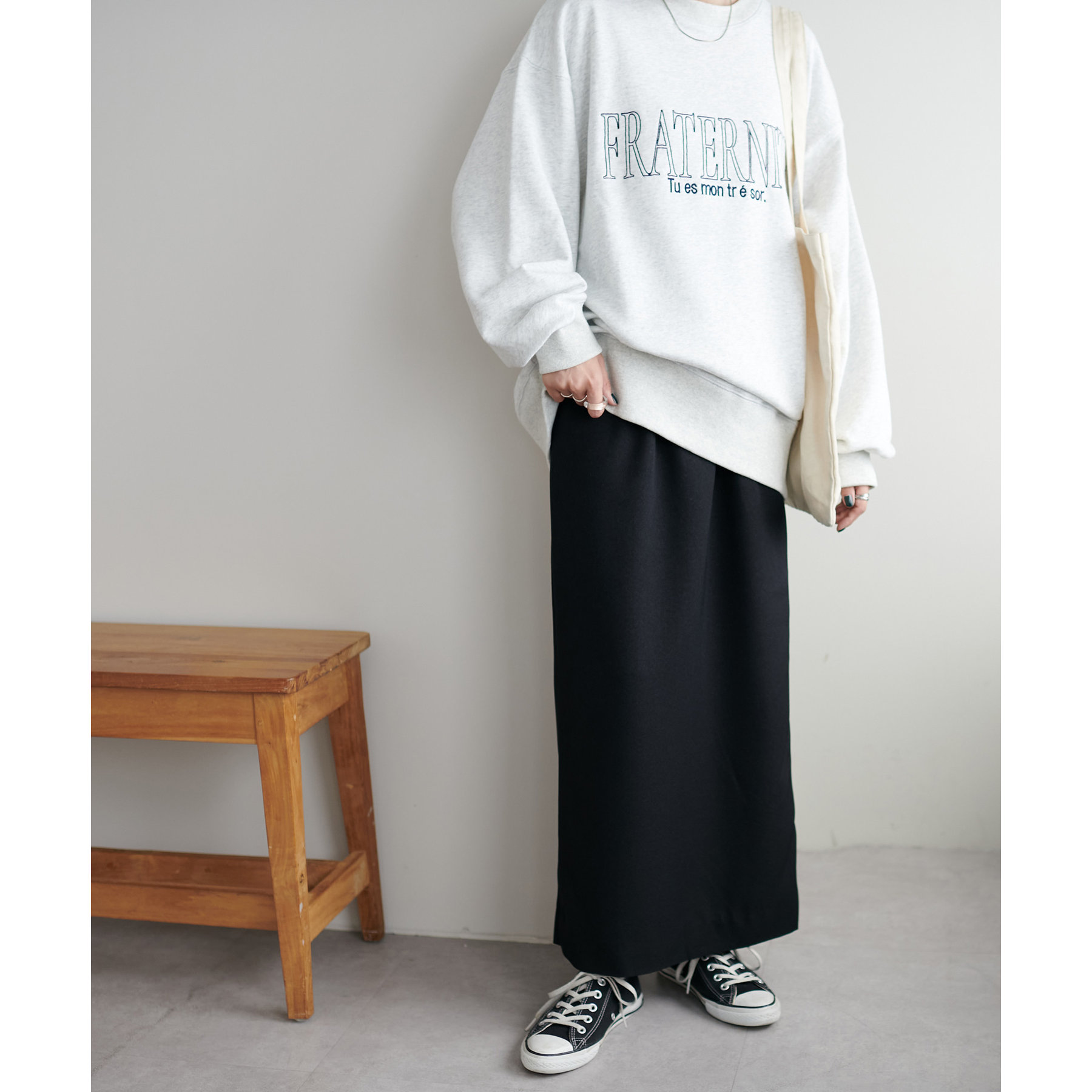 ショート丈のアイテムだけでなく、ルーズなシルエットのアイテムとも相性抜群です。