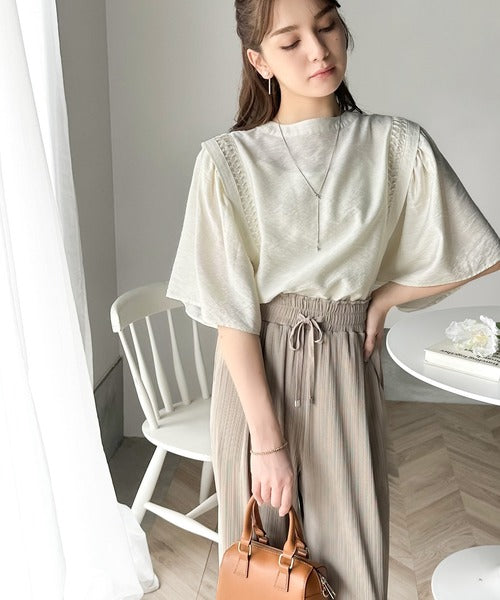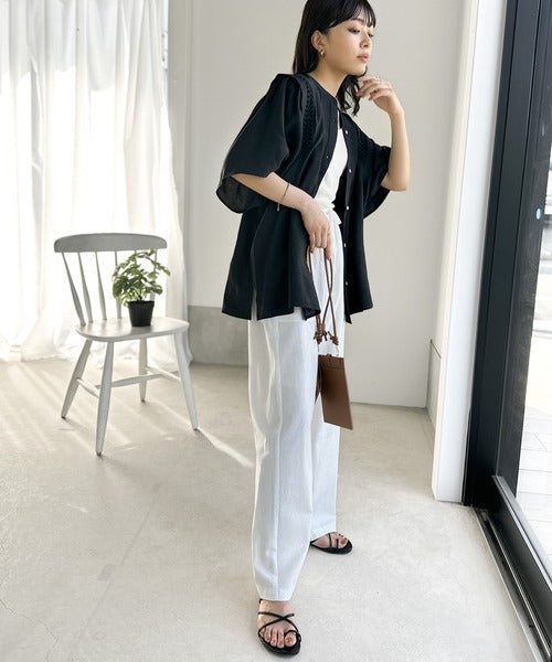 肩にたっぷりタックの入ったワイドなフレア袖は二の腕の華奢見え効果が嬉しいポイント!