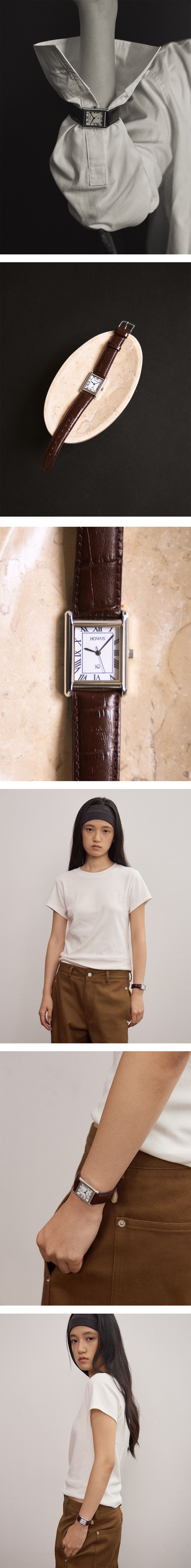 ダイヤル中央に配したローマ数字インデックスは、クラシカルな美しさを強調しつつ、端正で上品な雰囲気を演出します。シンプルなスクエアフレームとの調和により、単なる時刻表示を超えた価値を感じさせてくれます。