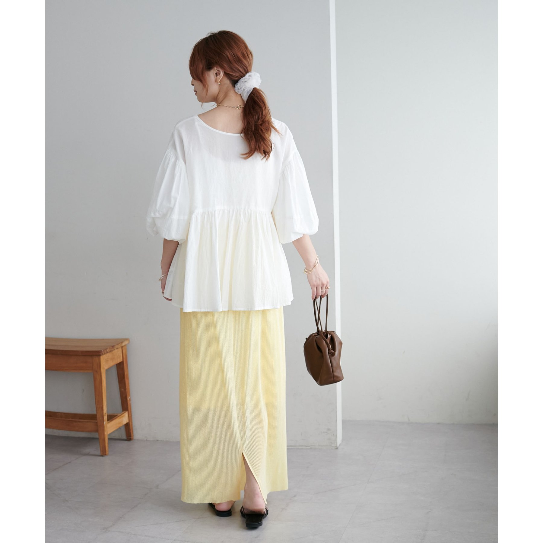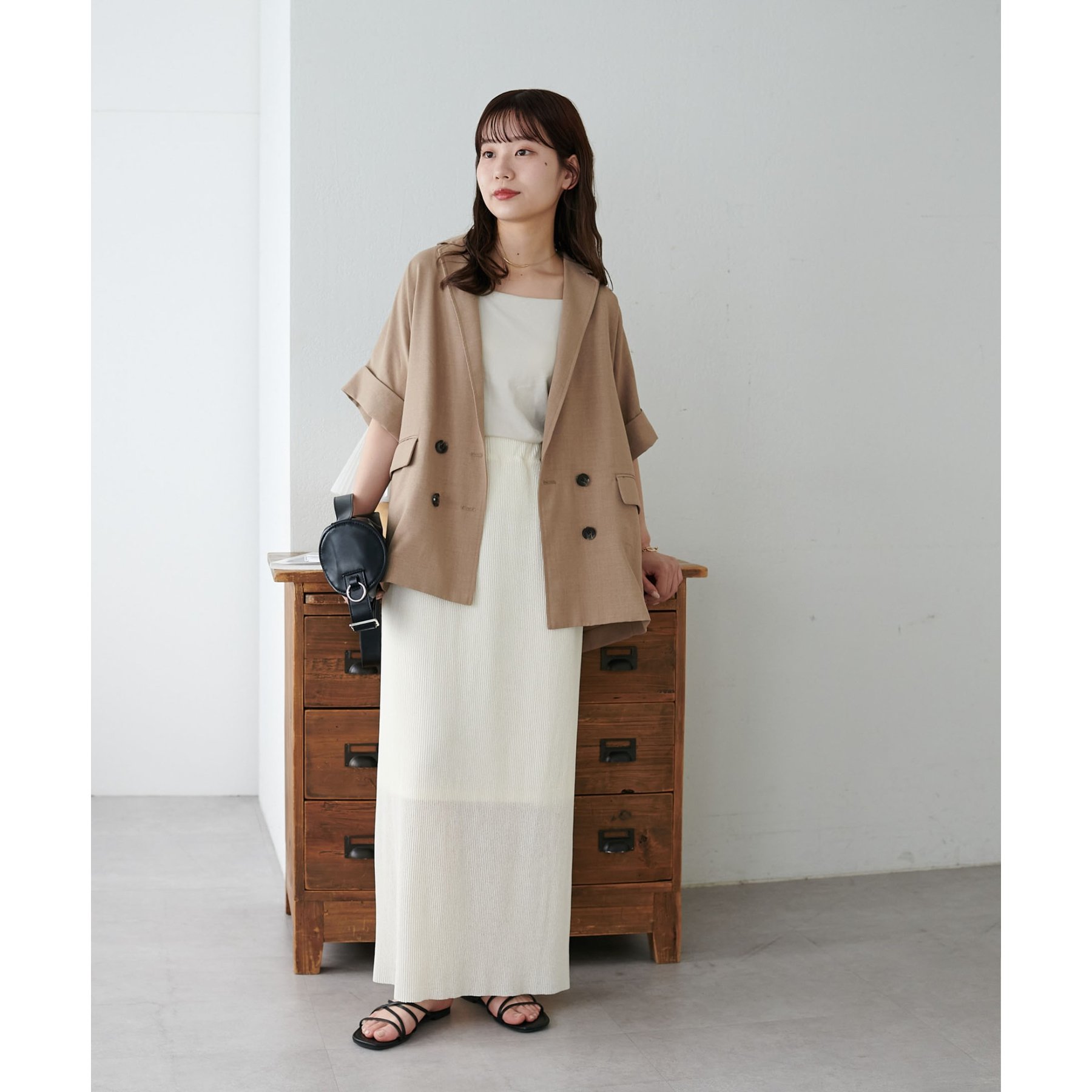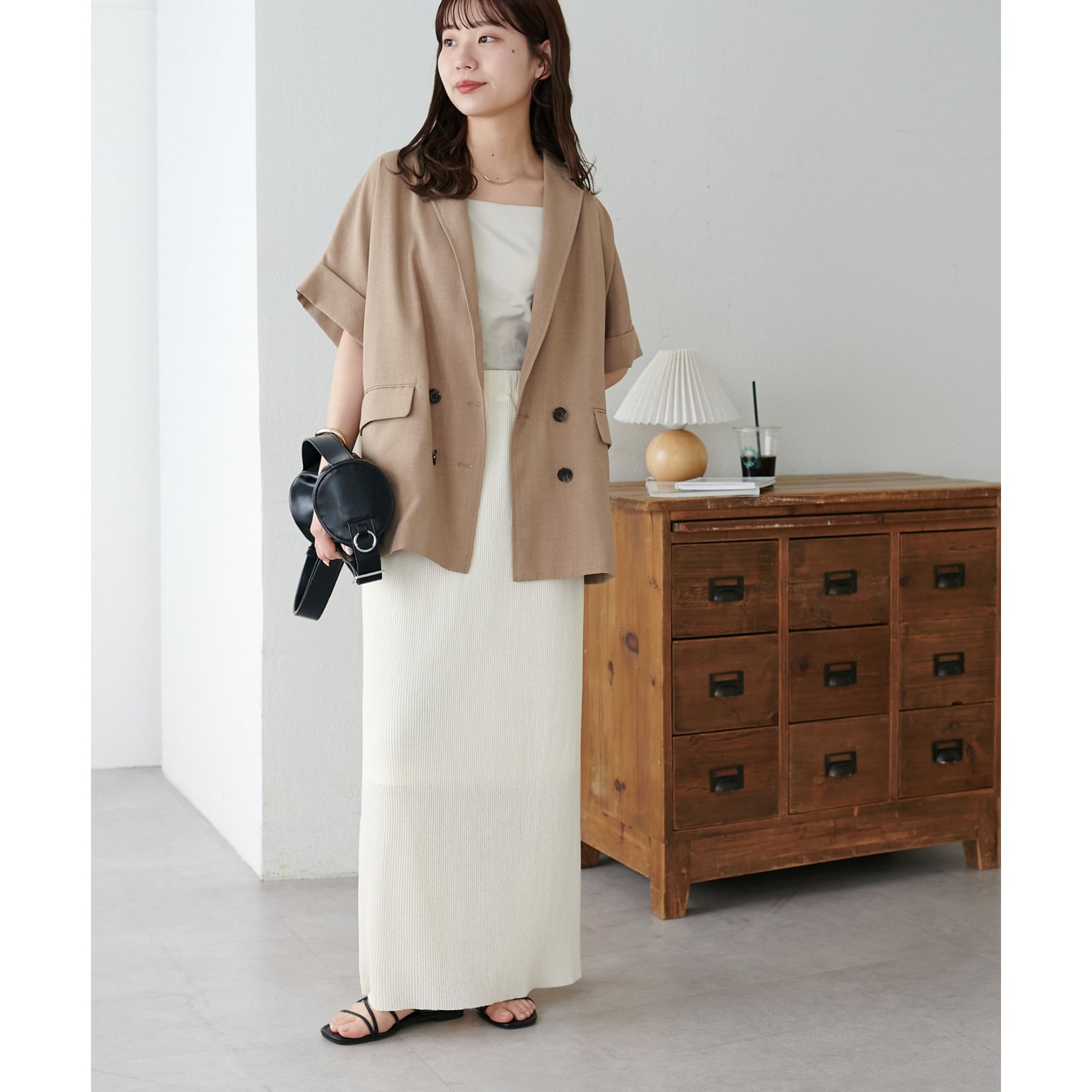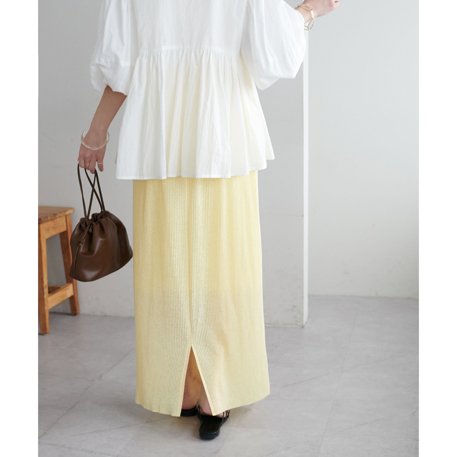 157cmスタッフ:ほんのりシアー感があることで重たく見えず、夏場も爽やかに着られました!長めの着丈なのでヒール合わせがおすすめ。