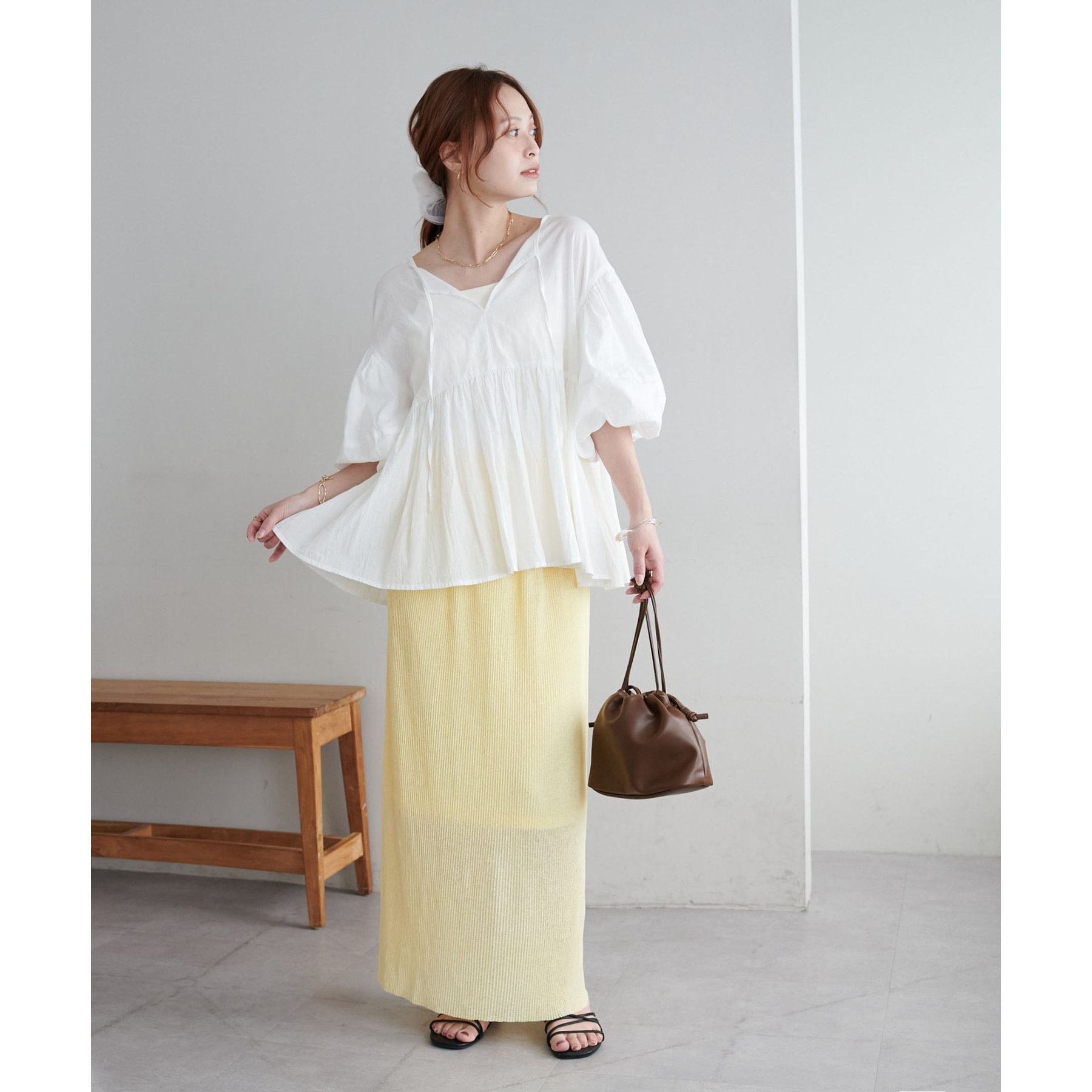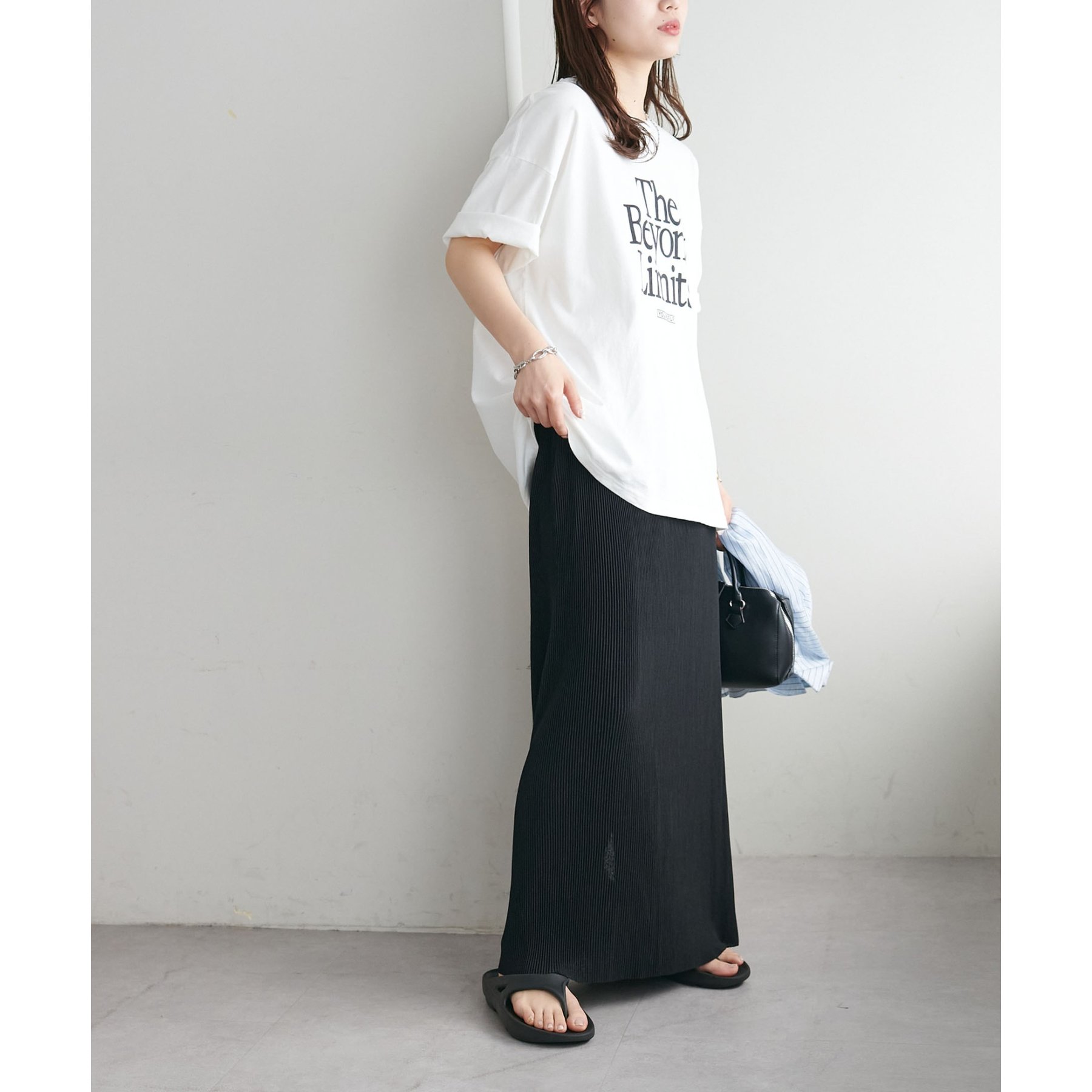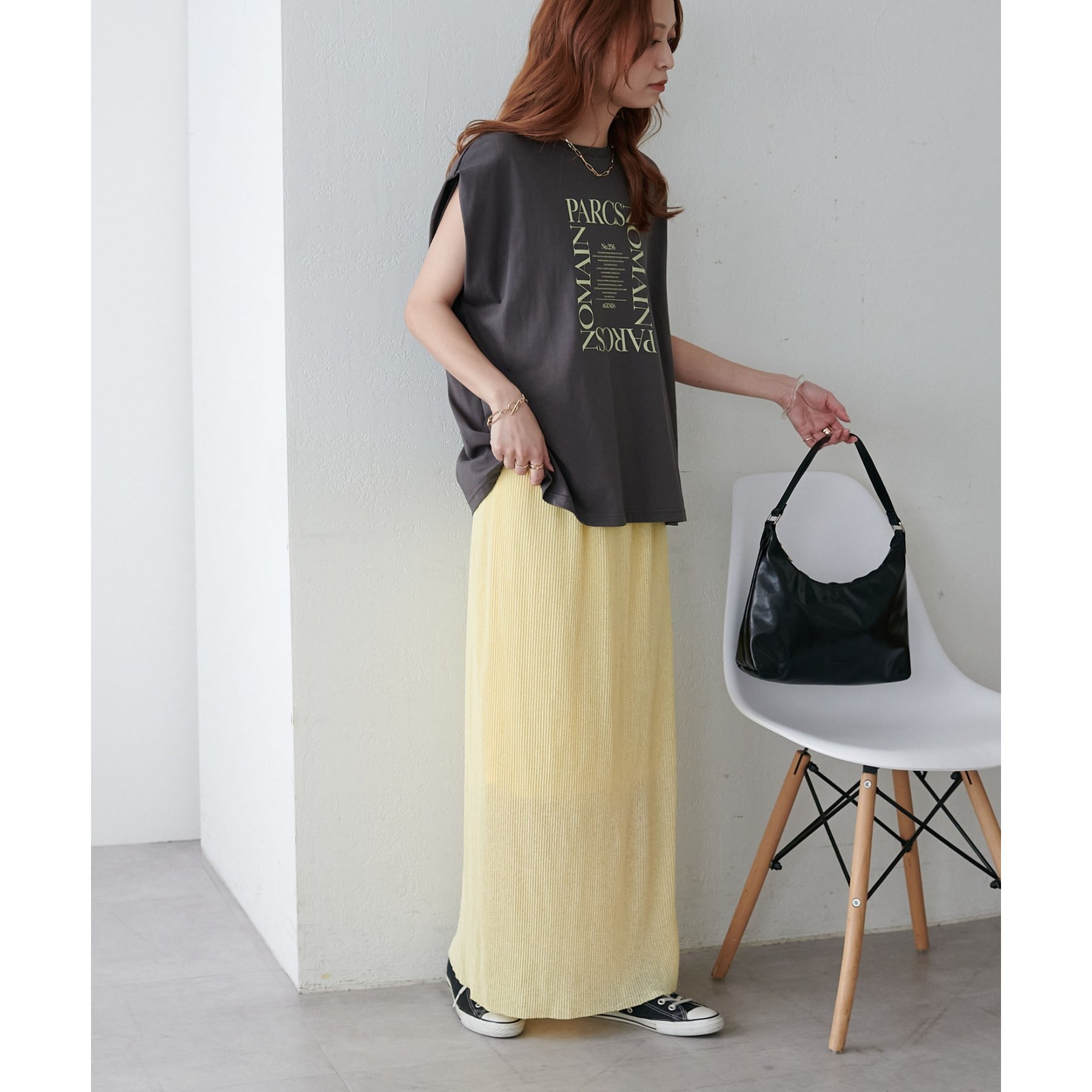157cmスタッフ:ほんのりシアー感があることで重たく見えず、夏場も爽やかに着られました!長めの着丈なのでヒール合わせがおすすめ。