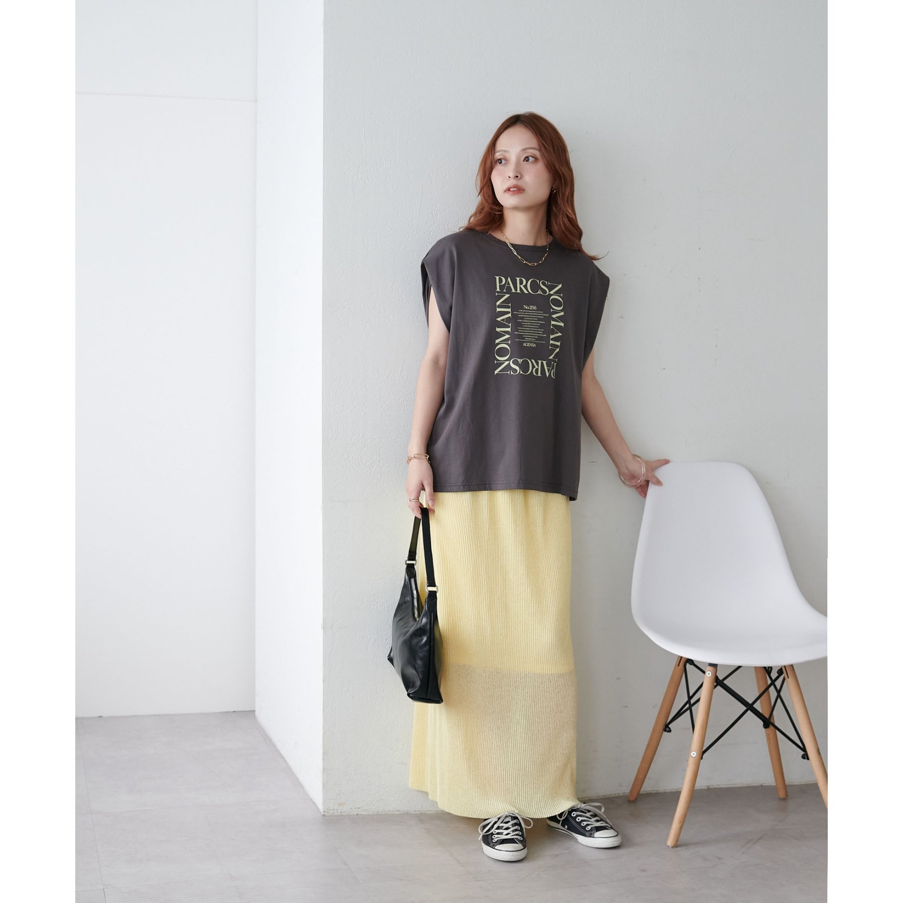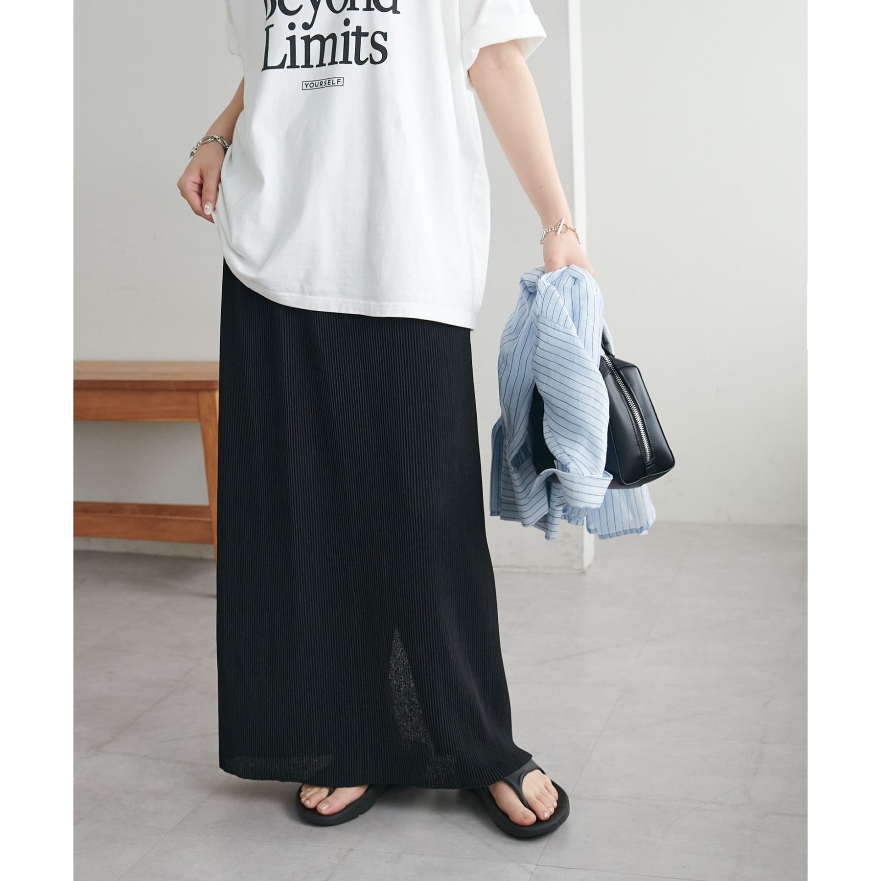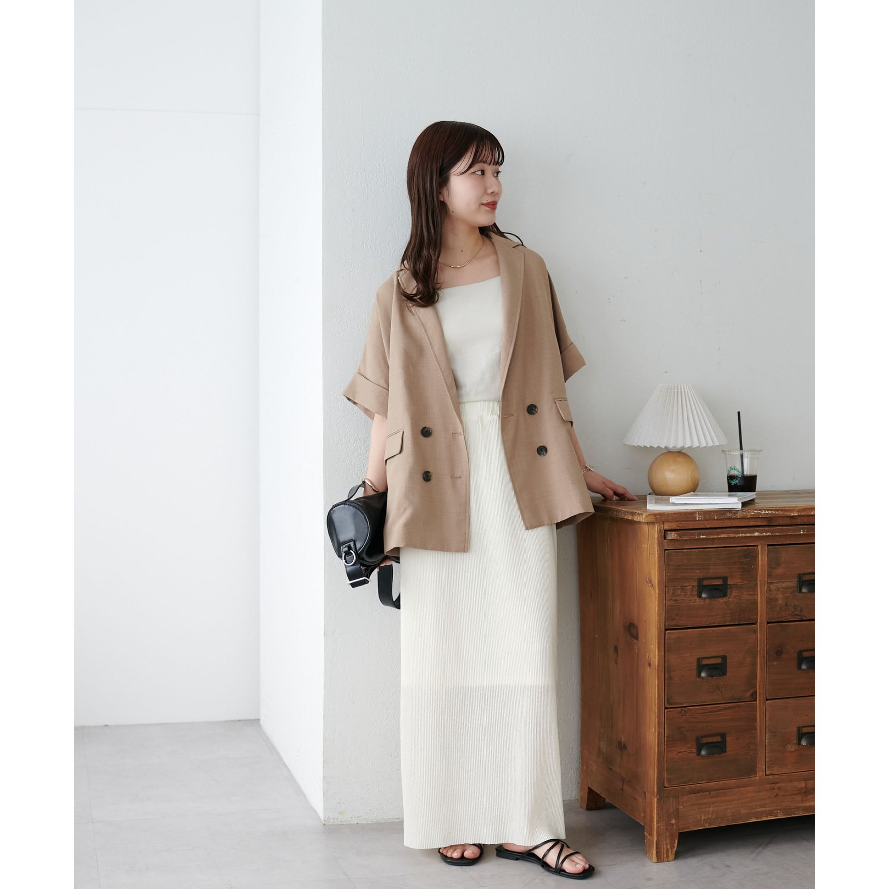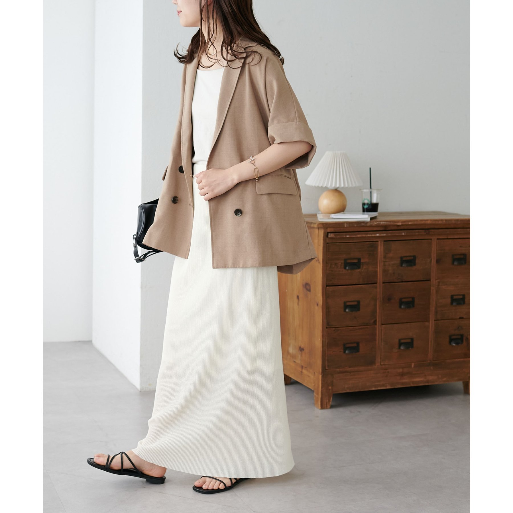 157cmスタッフ:ほんのりシアー感があることで重たく見えず、夏場も爽やかに着られました!長めの着丈なのでヒール合わせがおすすめ。