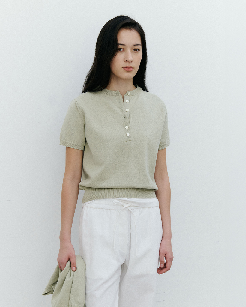 ブークレコットン糸を使用し、さらりとした涼しい肌触りが特徴のヘンリーネック半袖ニットです。