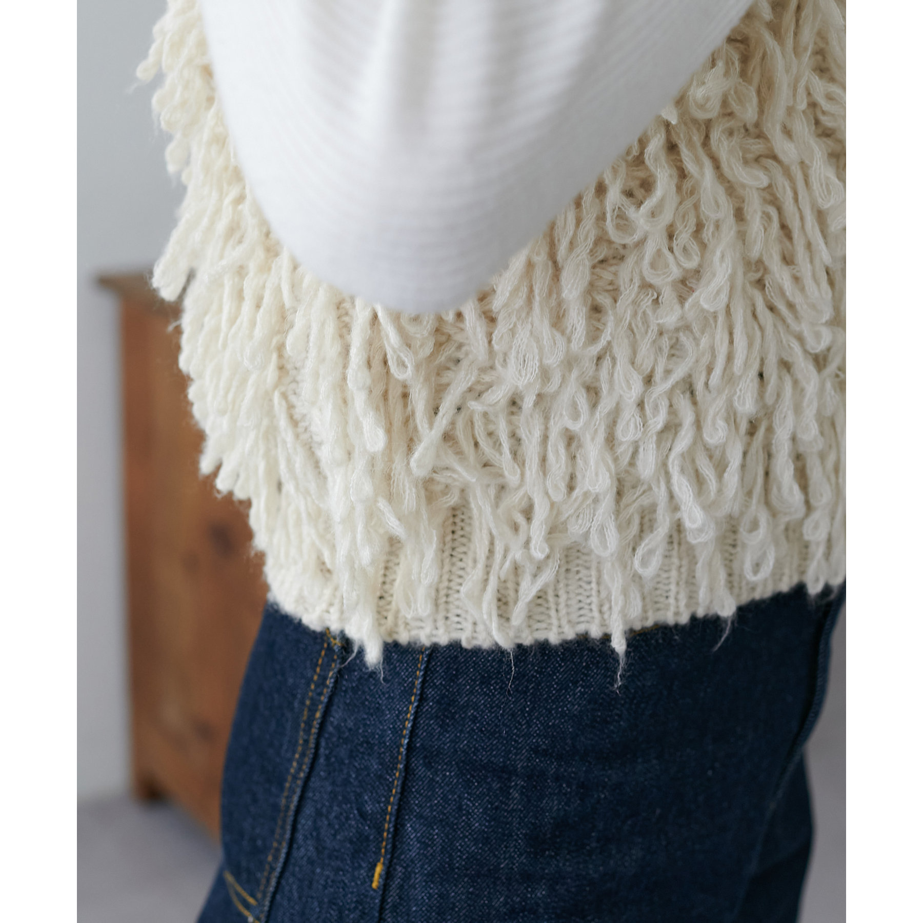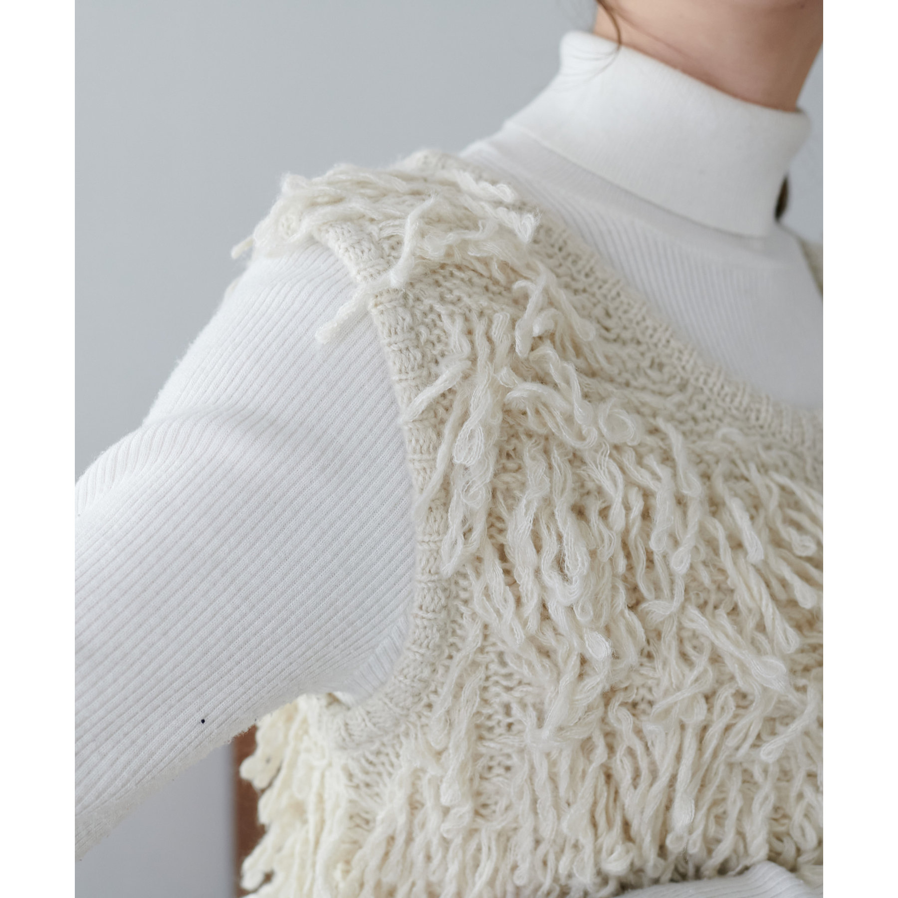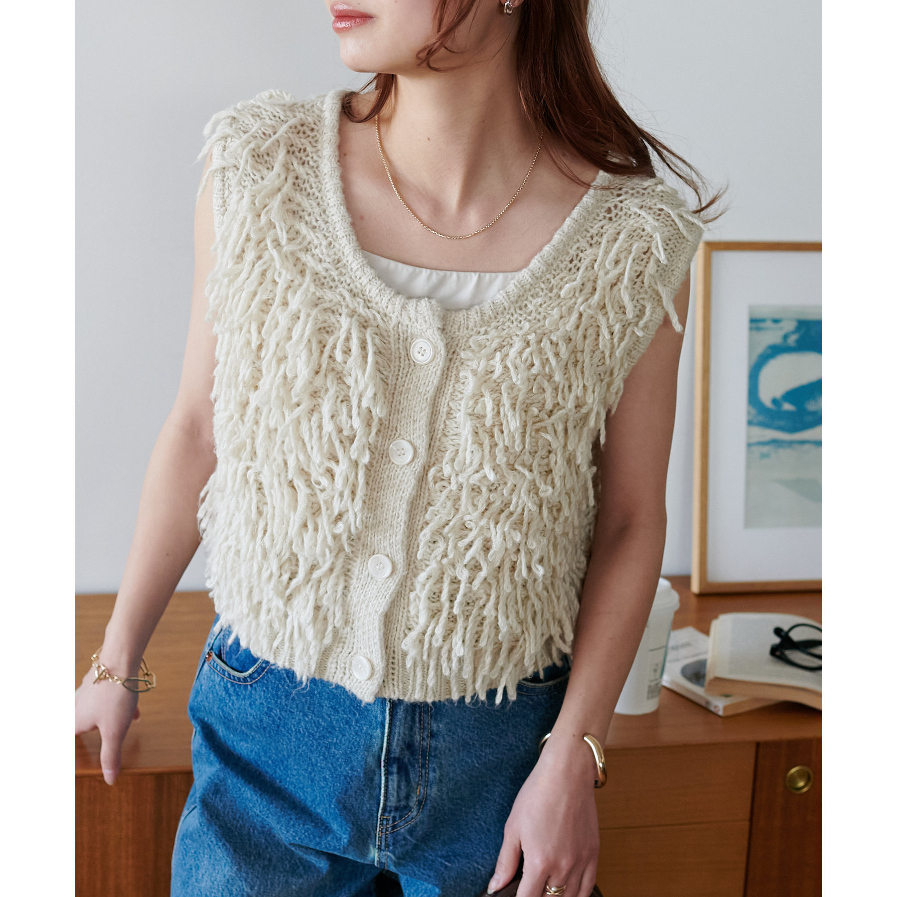 全体にフリンジを施したデザイン性のあるベスト。