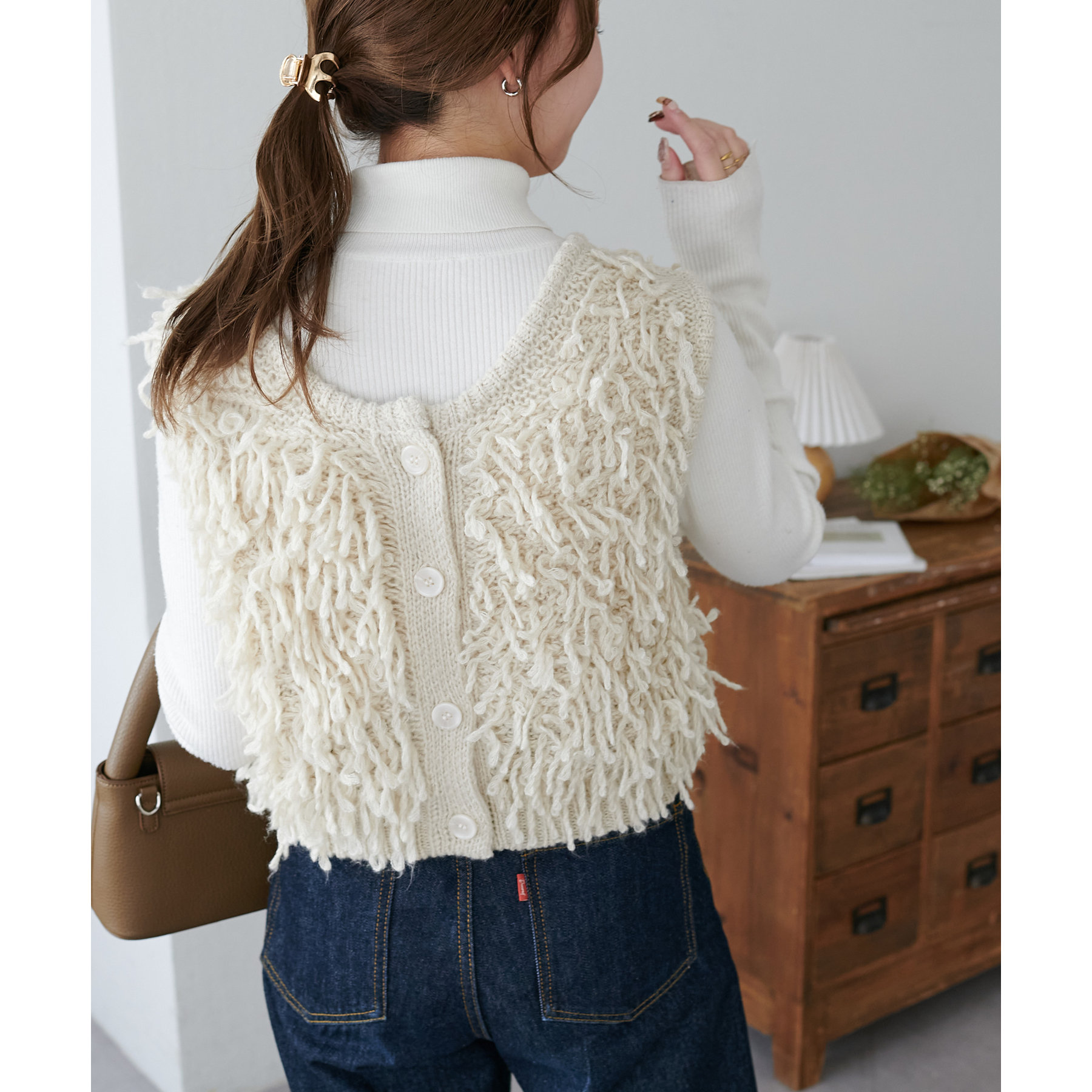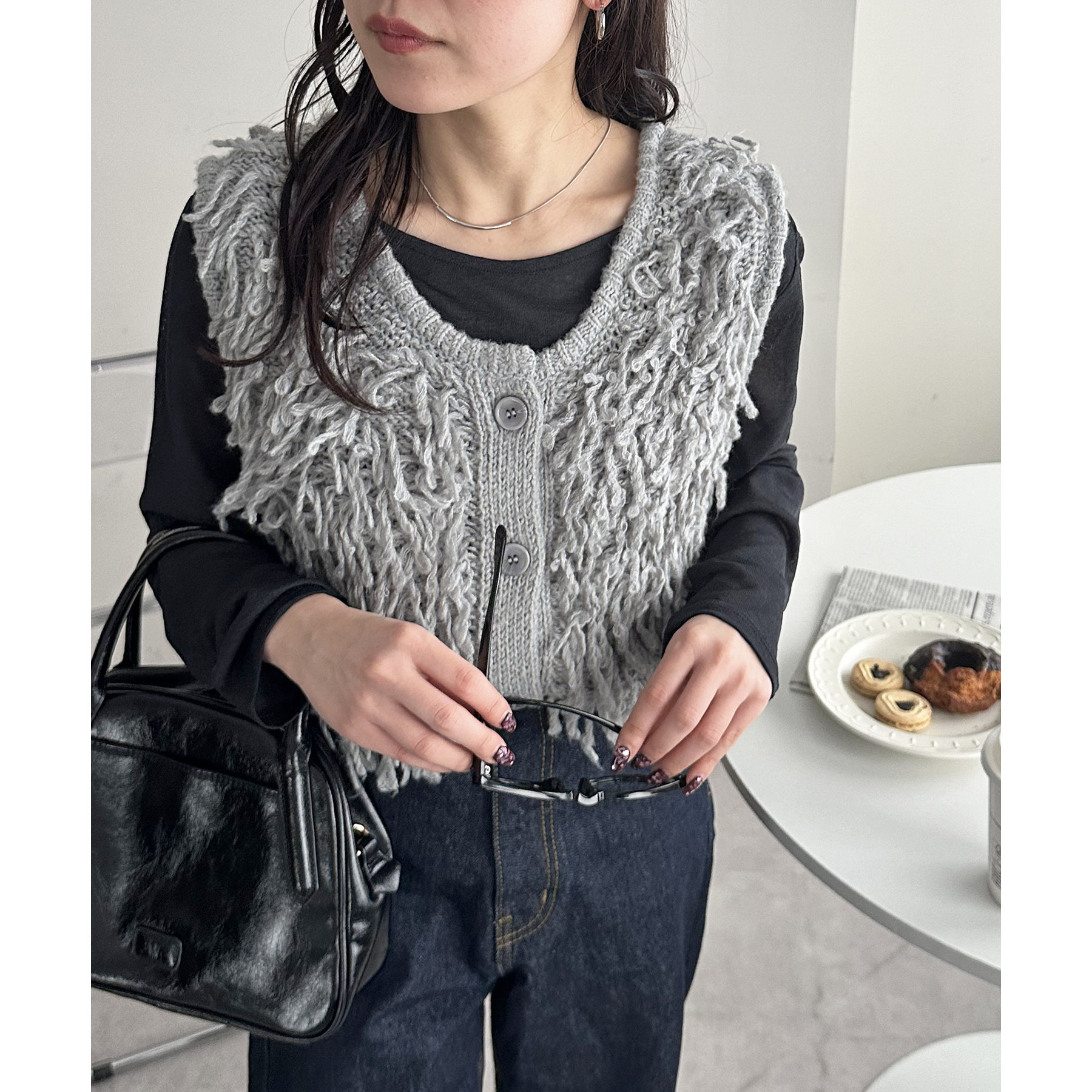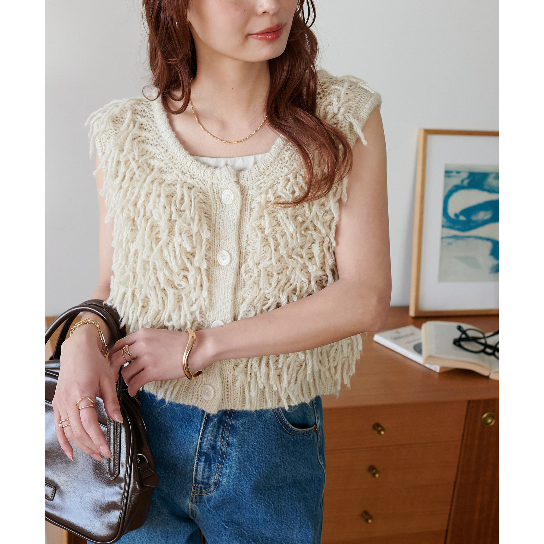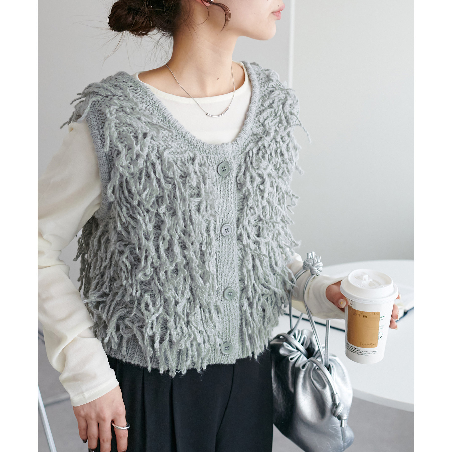 インナー次第でロングシーン楽しんでいただけるフリンジベスト。