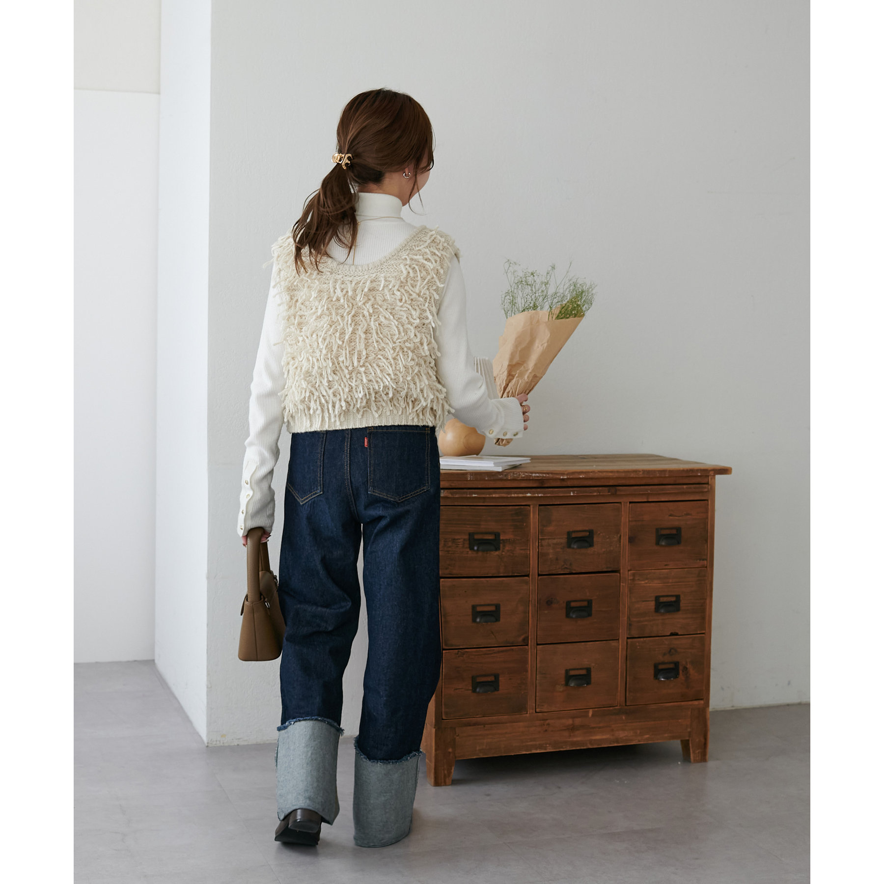 コンパクトな着丈にしたので、幅広いシルエットのボトムスと合わせていただけるアイテムです。