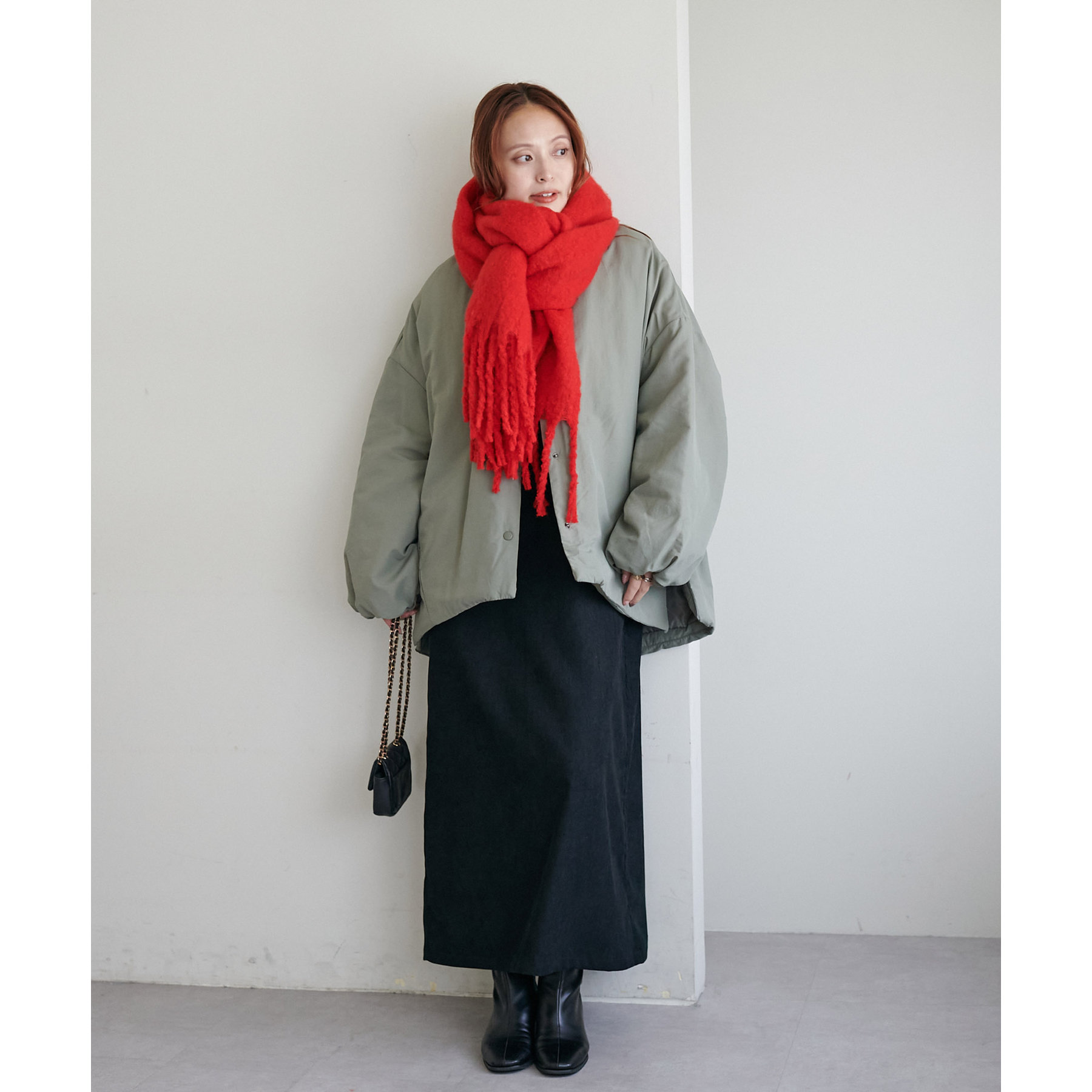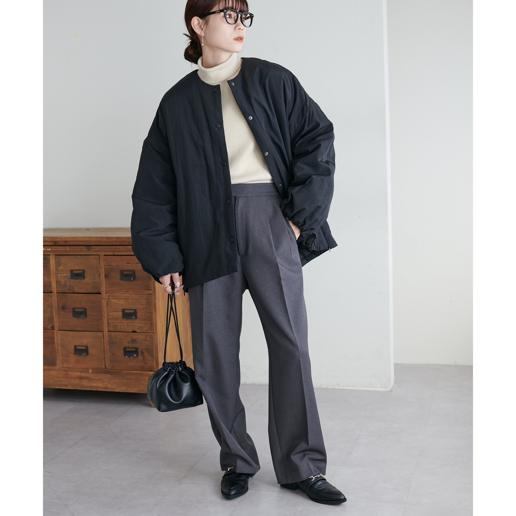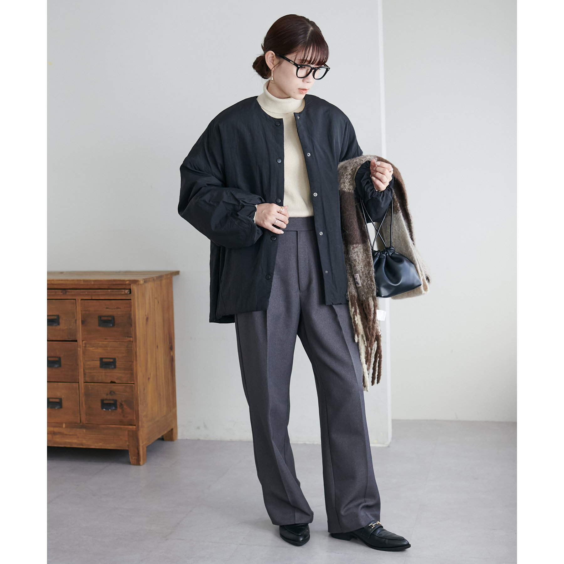 デニムやスラックスを合わせて大人カジュアルなコーデも、スカートやワンピースに合わせてフェミニンなコーデも。ノーカラーデザインなのでハイネックのトップスとの相性も抜群!