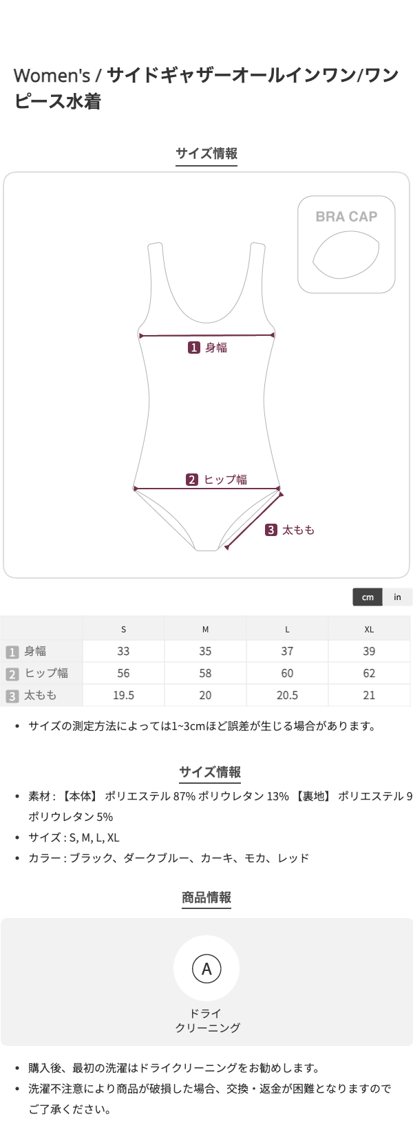 【S】着丈※肩紐下~:63、カップ:A-C推奨、ウエスト:56-92、股上:28