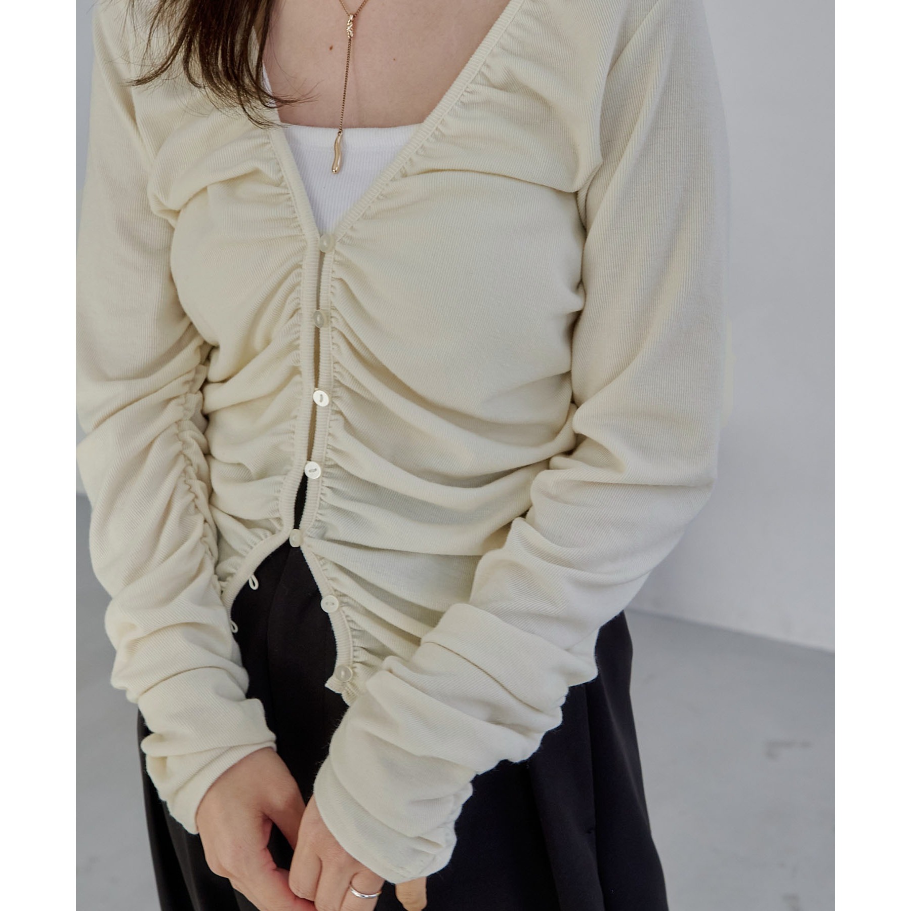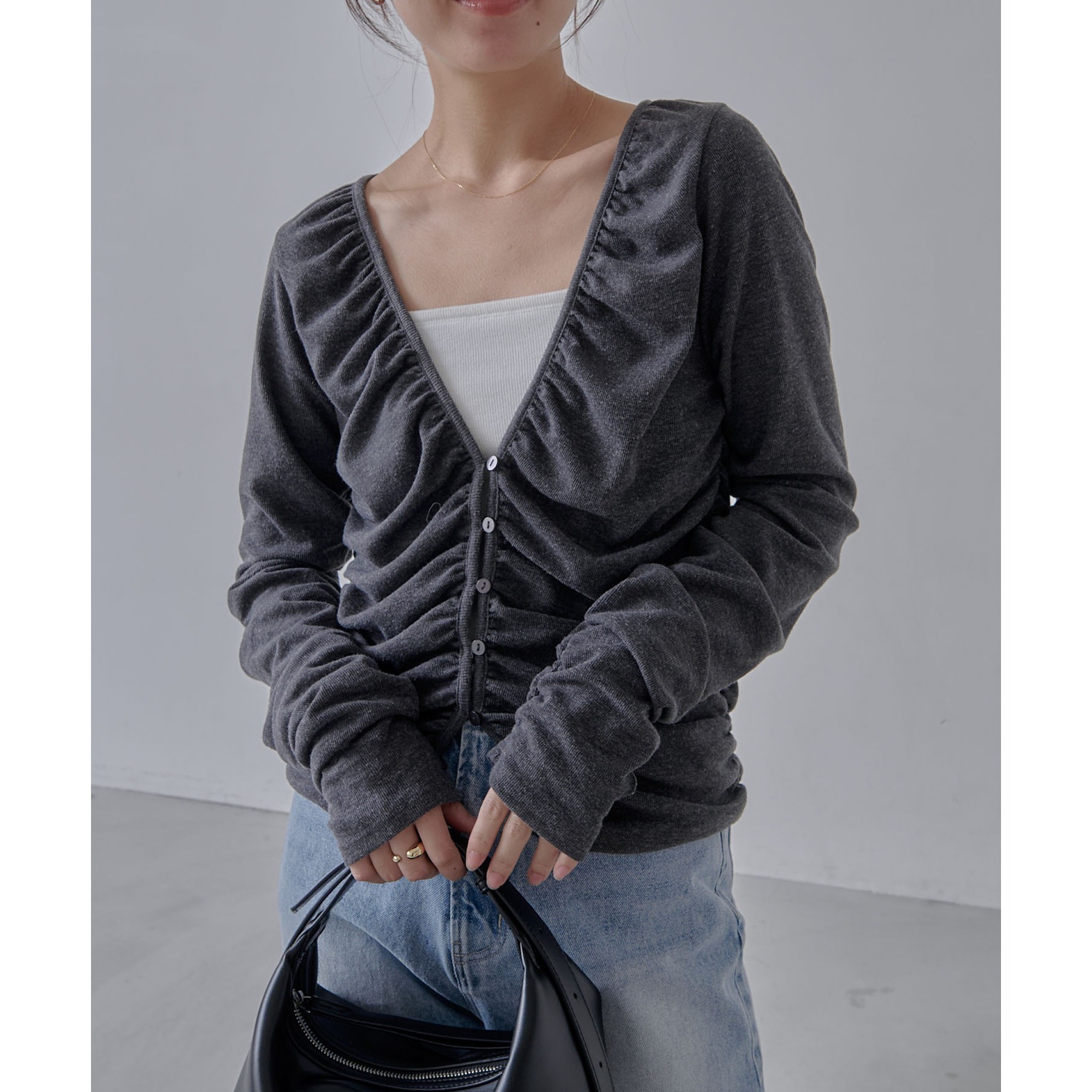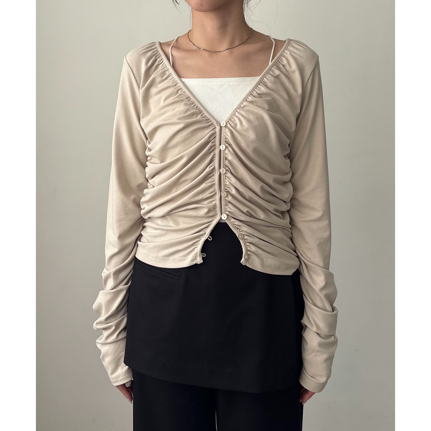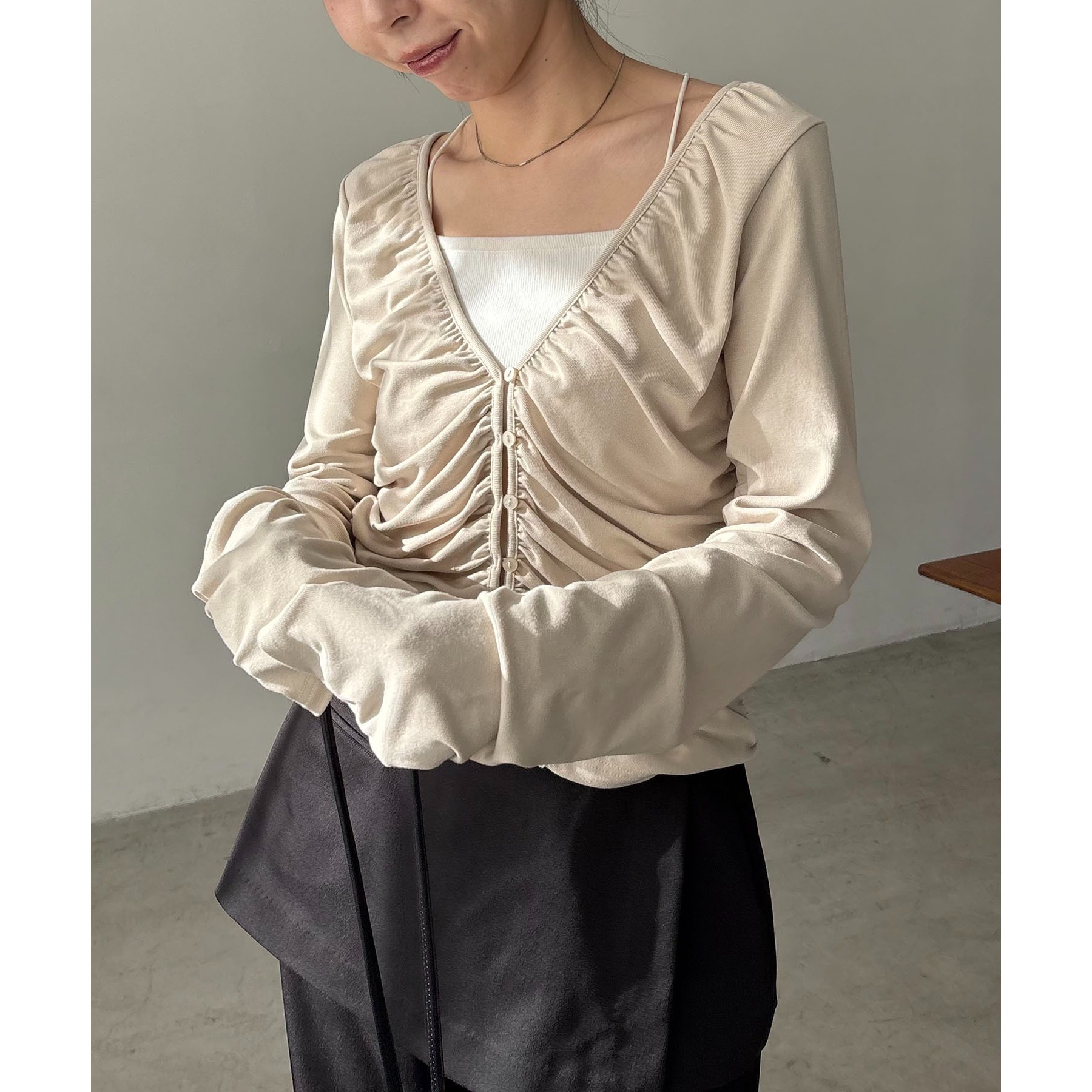 前立てから脇にかけてたっぷりとギャザーを入れた着映えするカーディガン