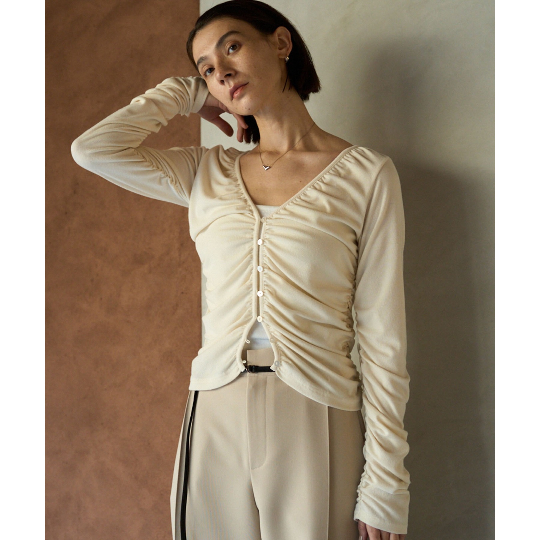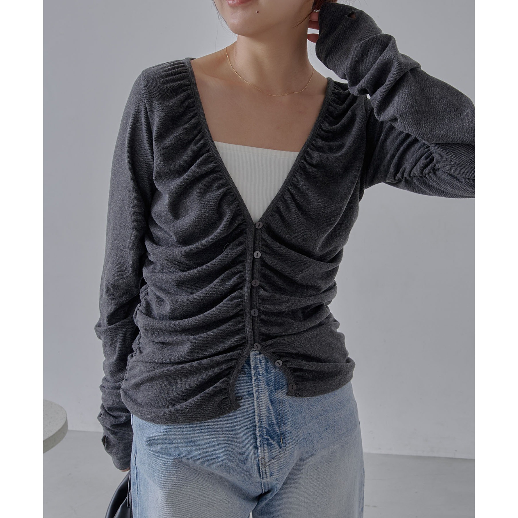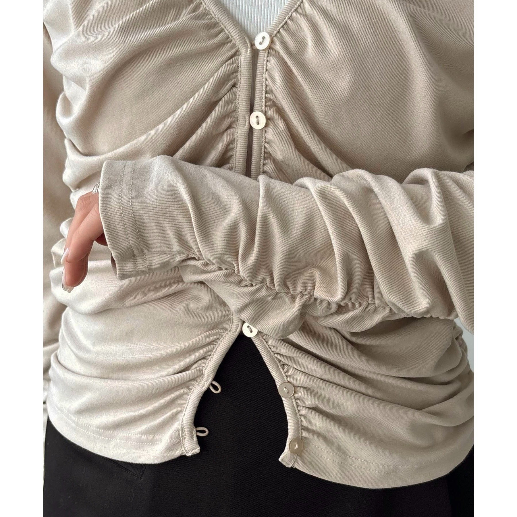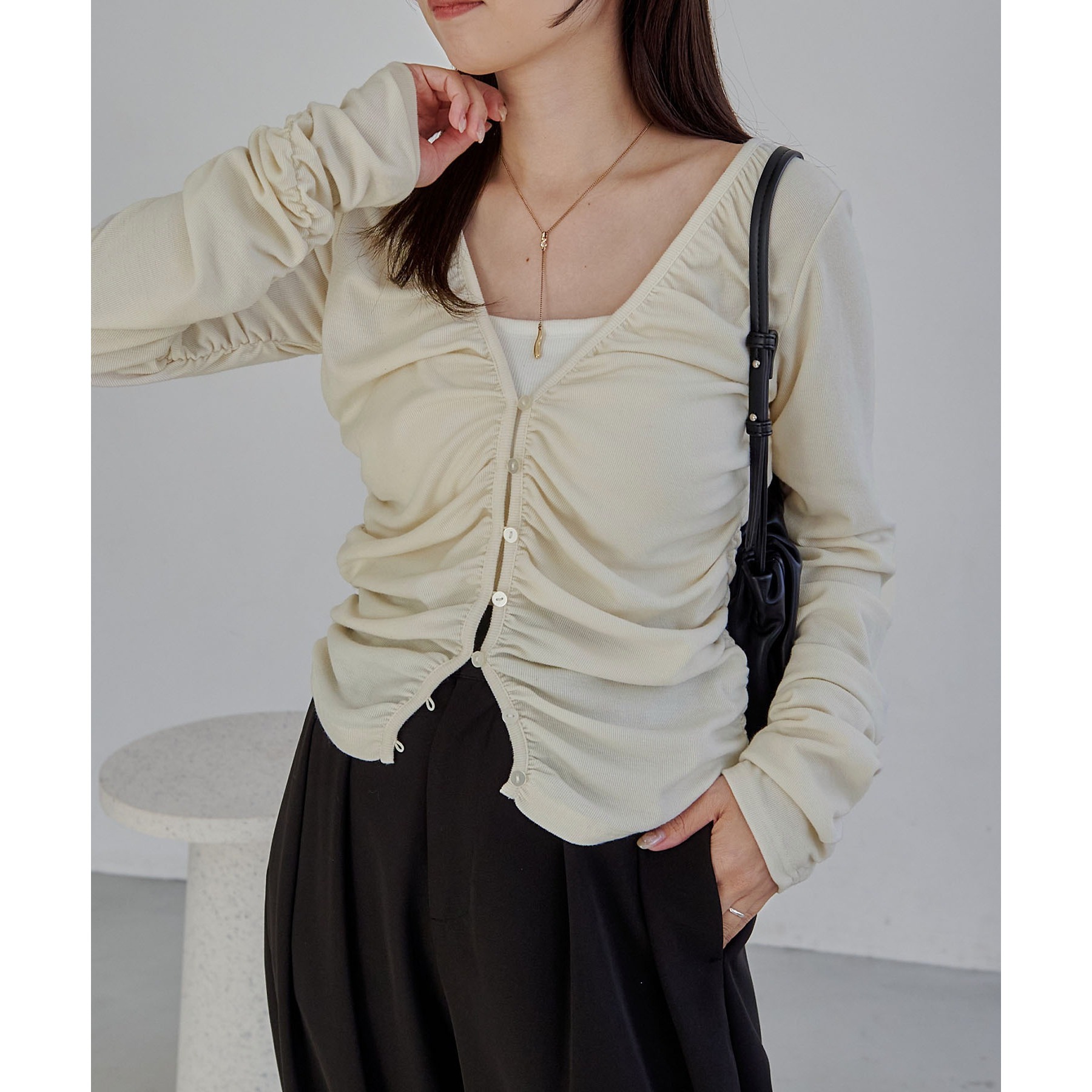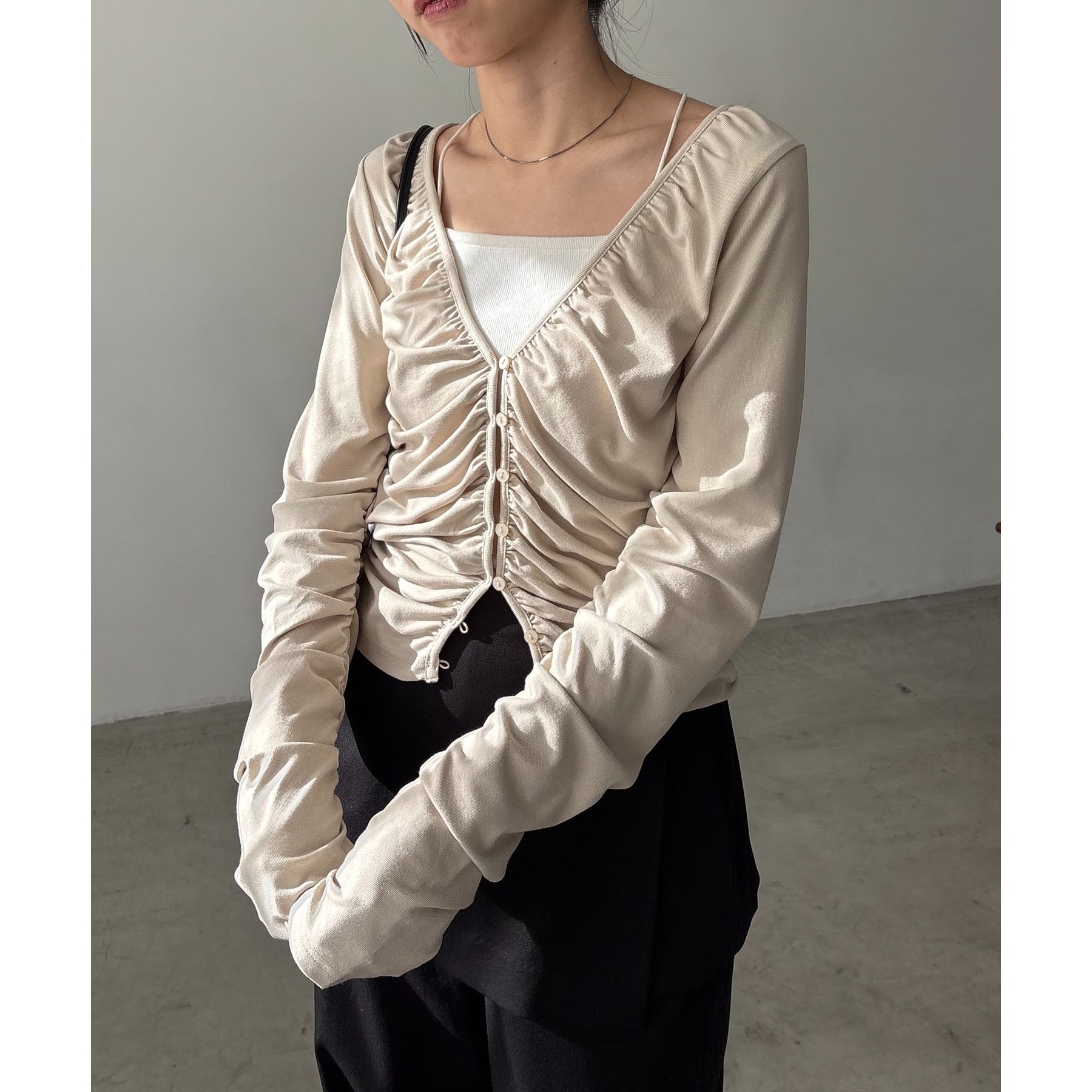 前立てから脇にかけてたっぷりとギャザーを入れた着映えするカーディガン