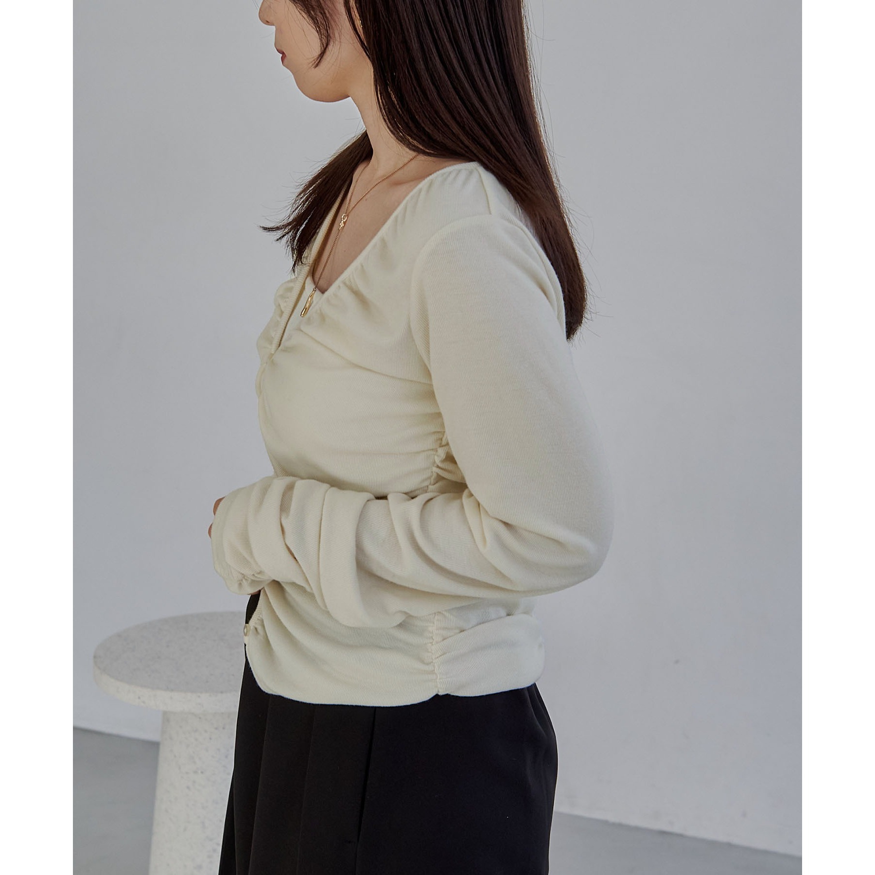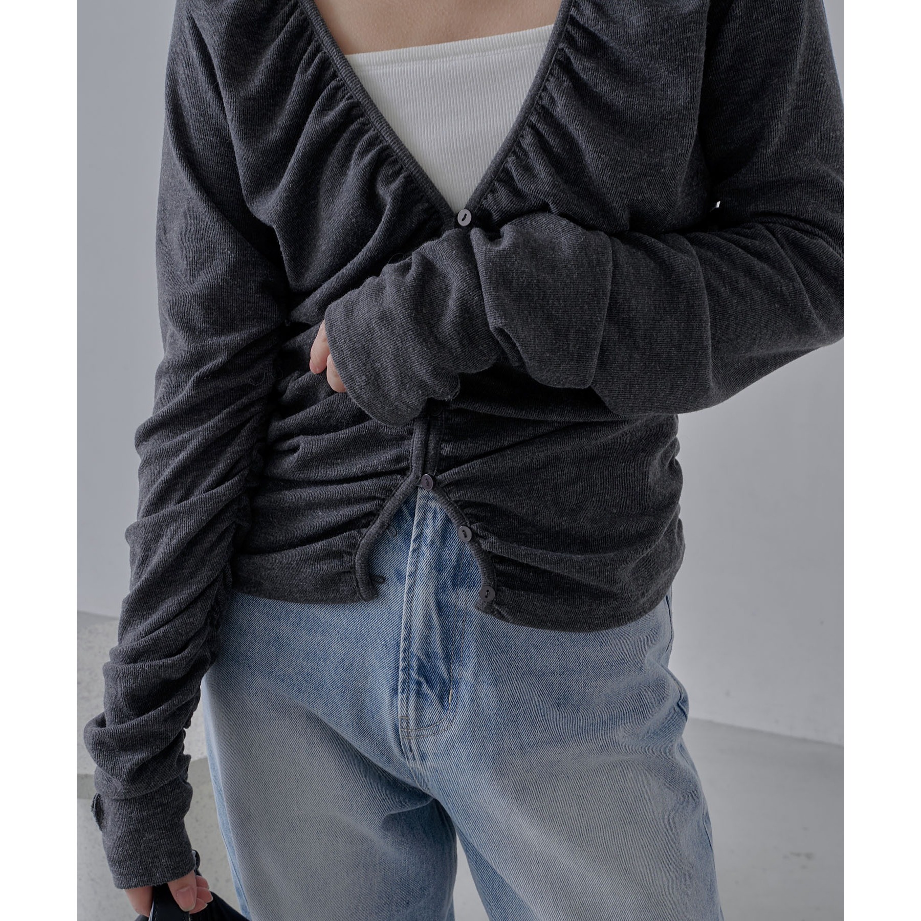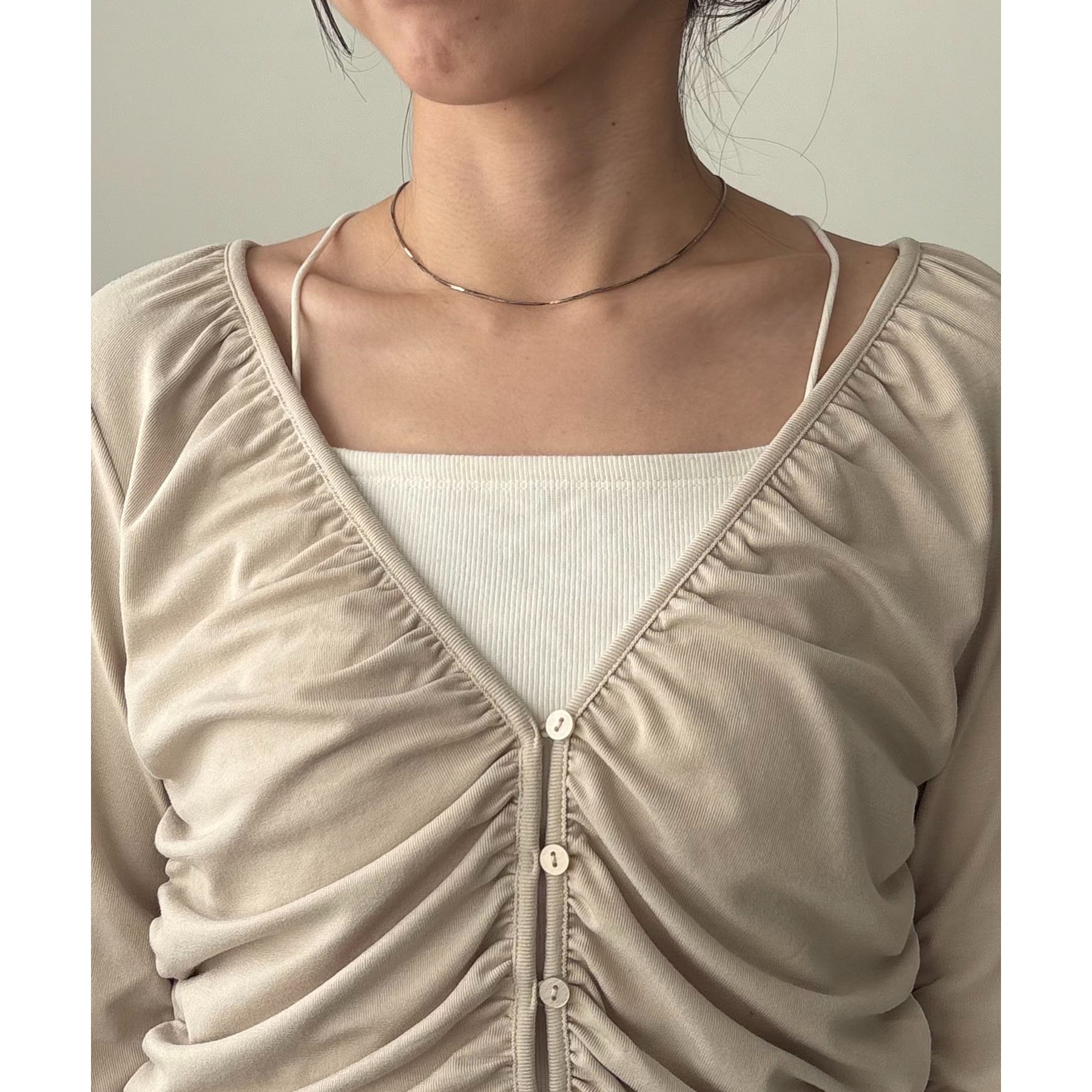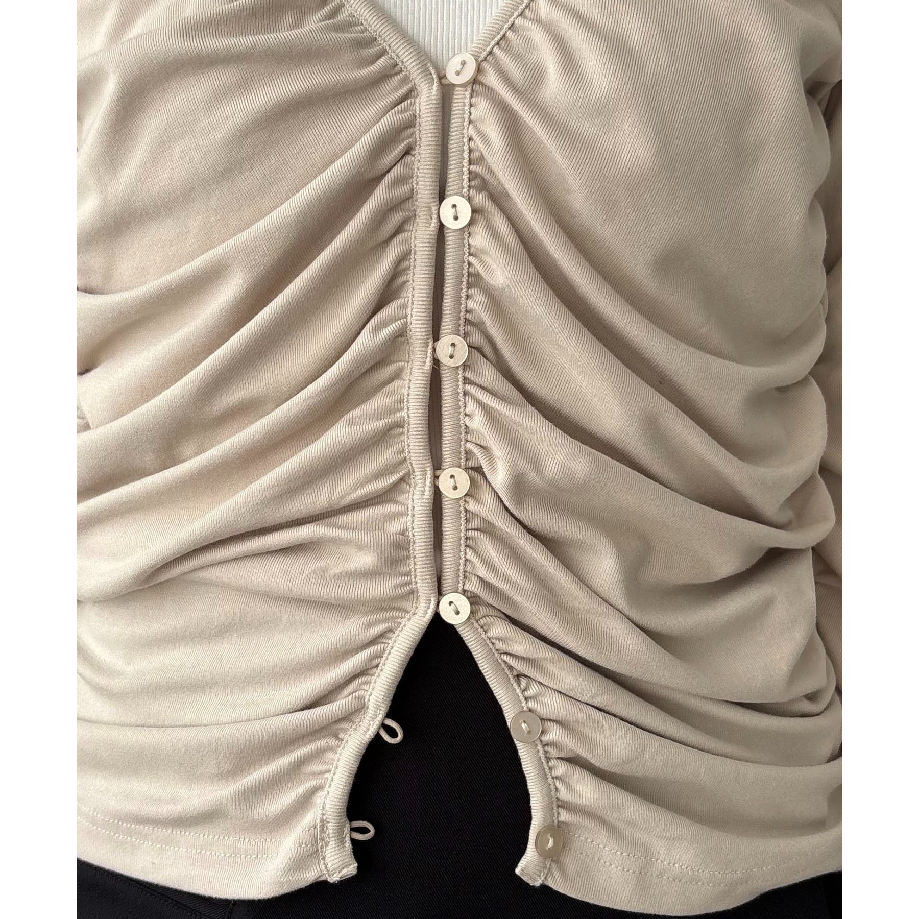 前立てから脇にかけてたっぷりとギャザーを入れた着映えするカーディガン