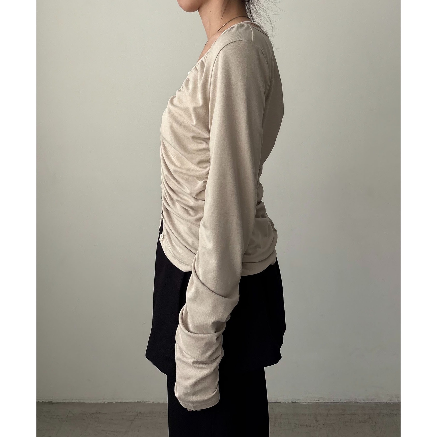 ・肘から袖口にかけてもギャザーでを寄せたデザインで手元も華やかに