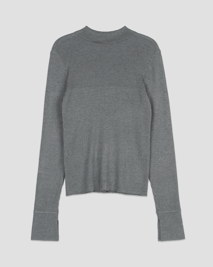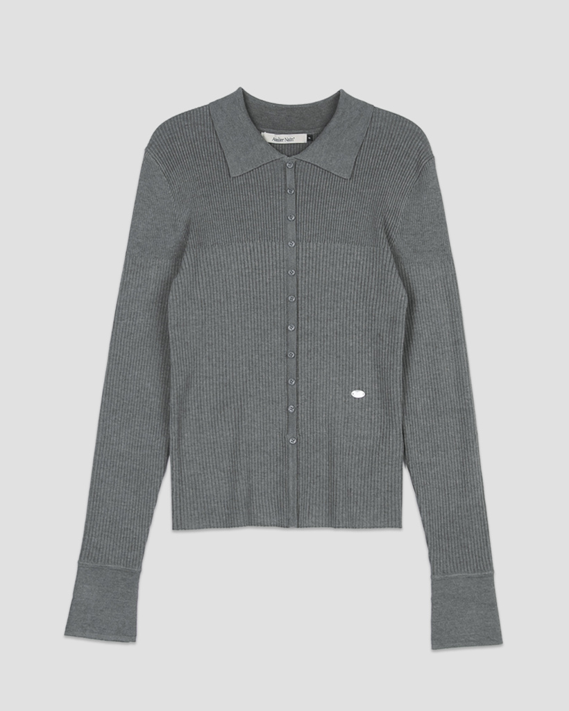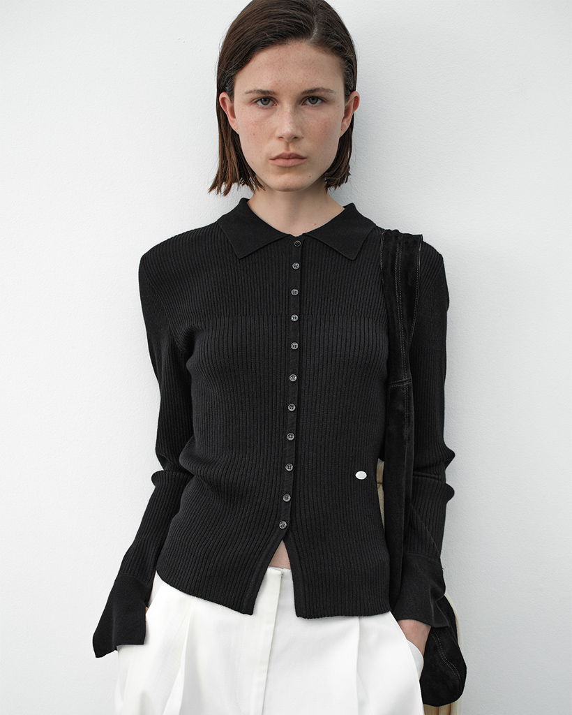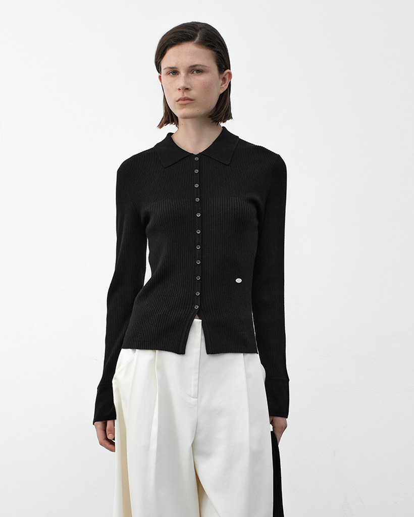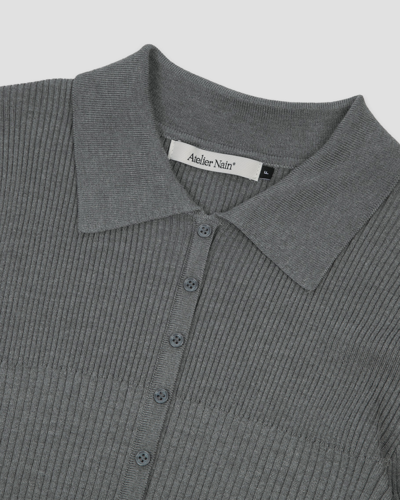 リブ編み組織とボタンポイントがあるカラー付きニットプルオーバーです。