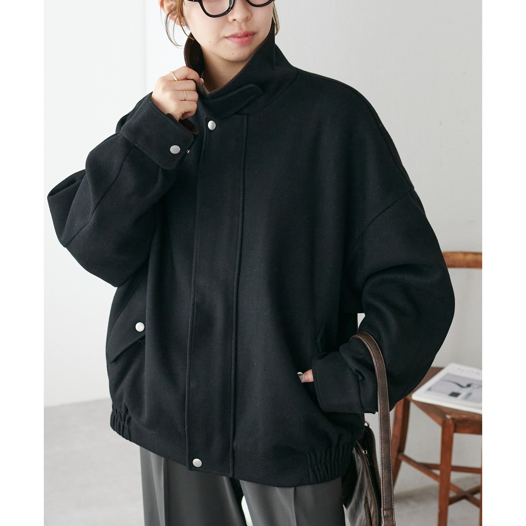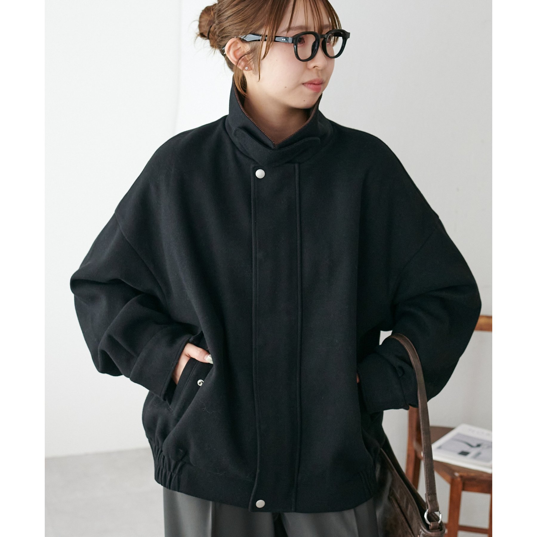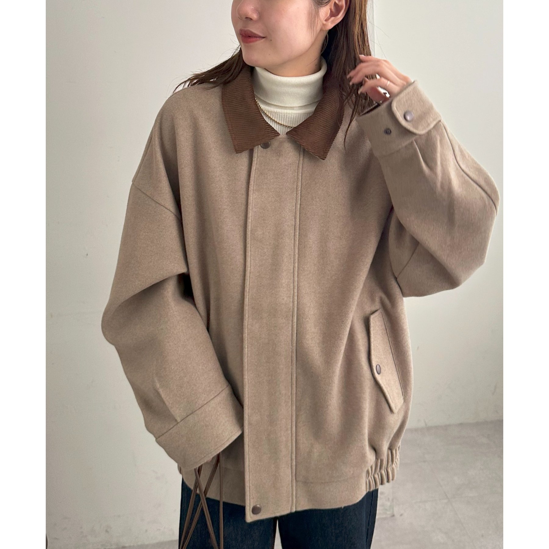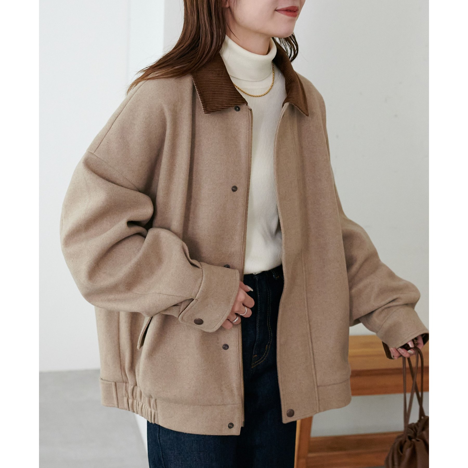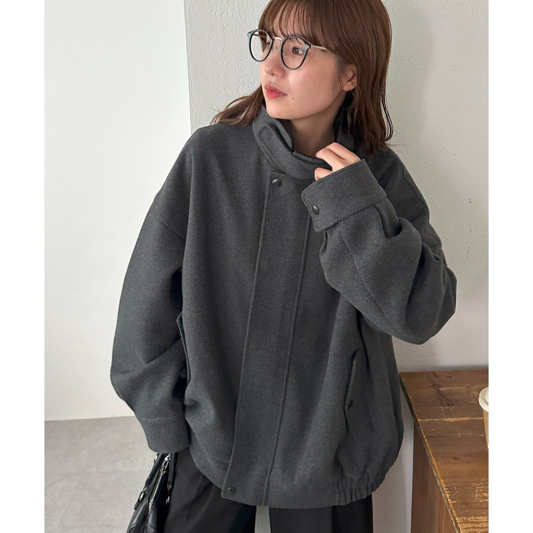 158cmレディーススタッフ(Mサイズ着用):オーバーサイズのニットやスウェットを着ているときに、腕回り部分が合うアウターが見つかりずらいのが悩みでしたが、こちらはアーム部分にもゆとりがありストレスフリーで着ることができます。