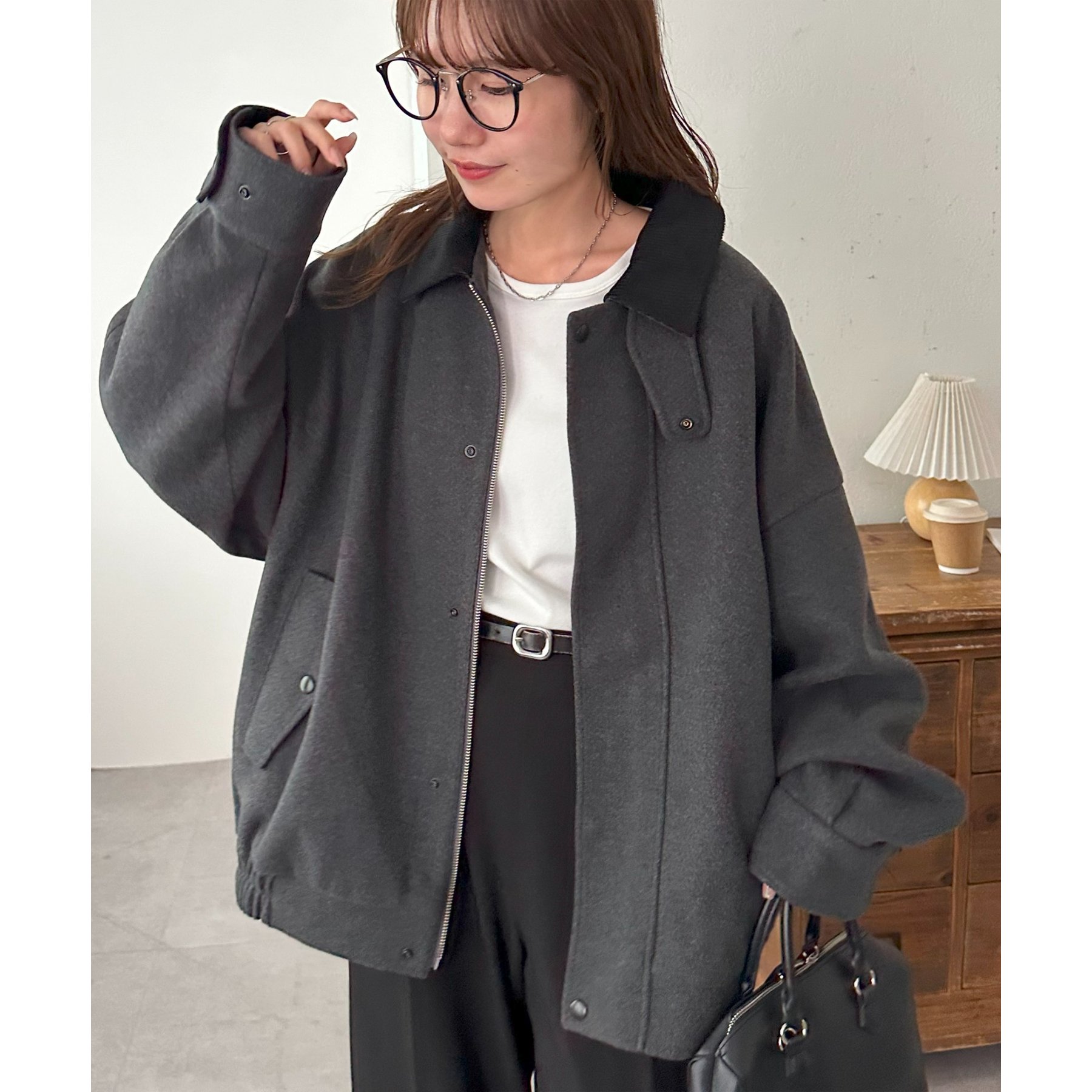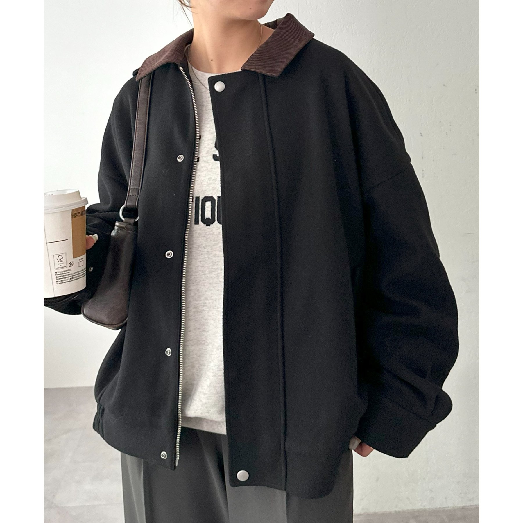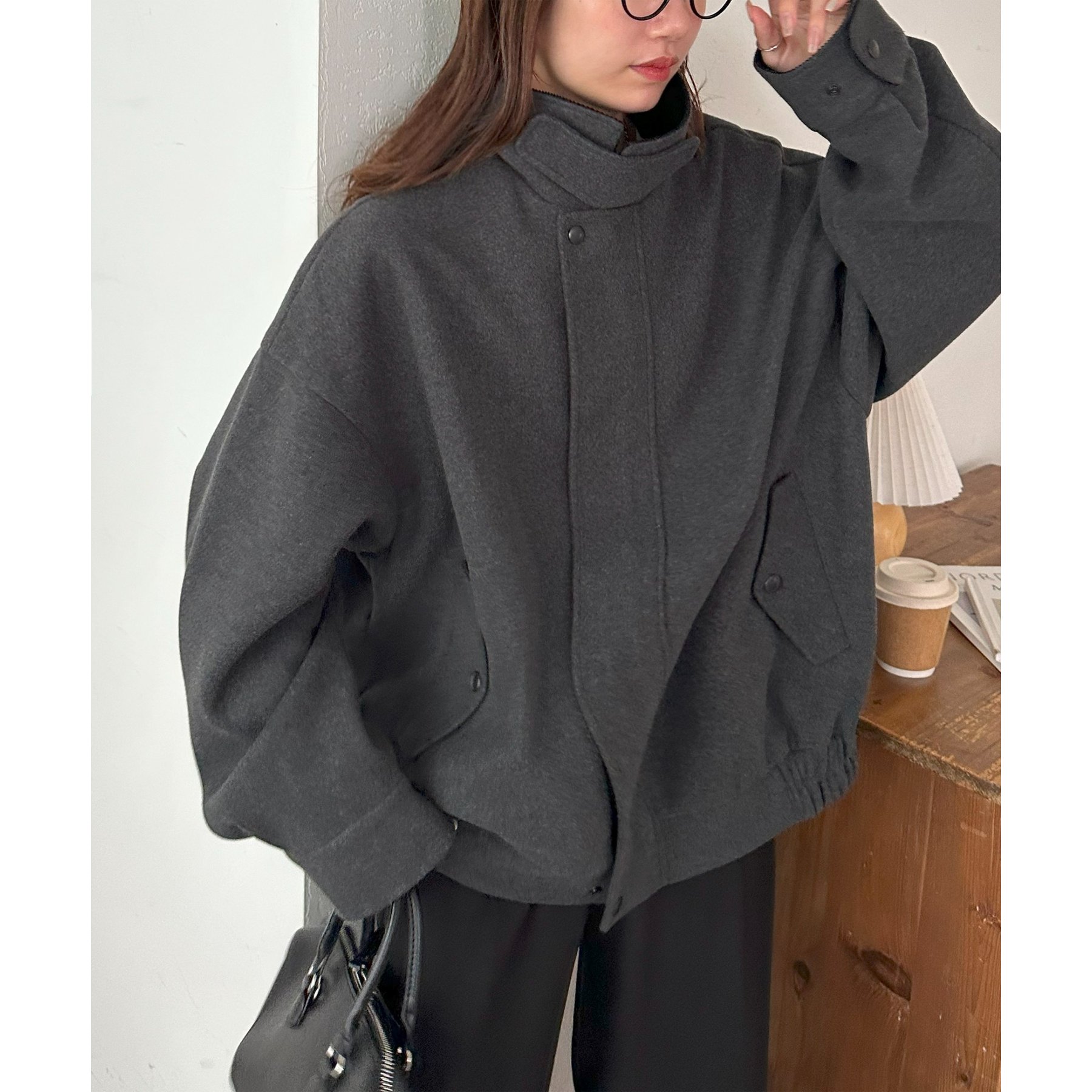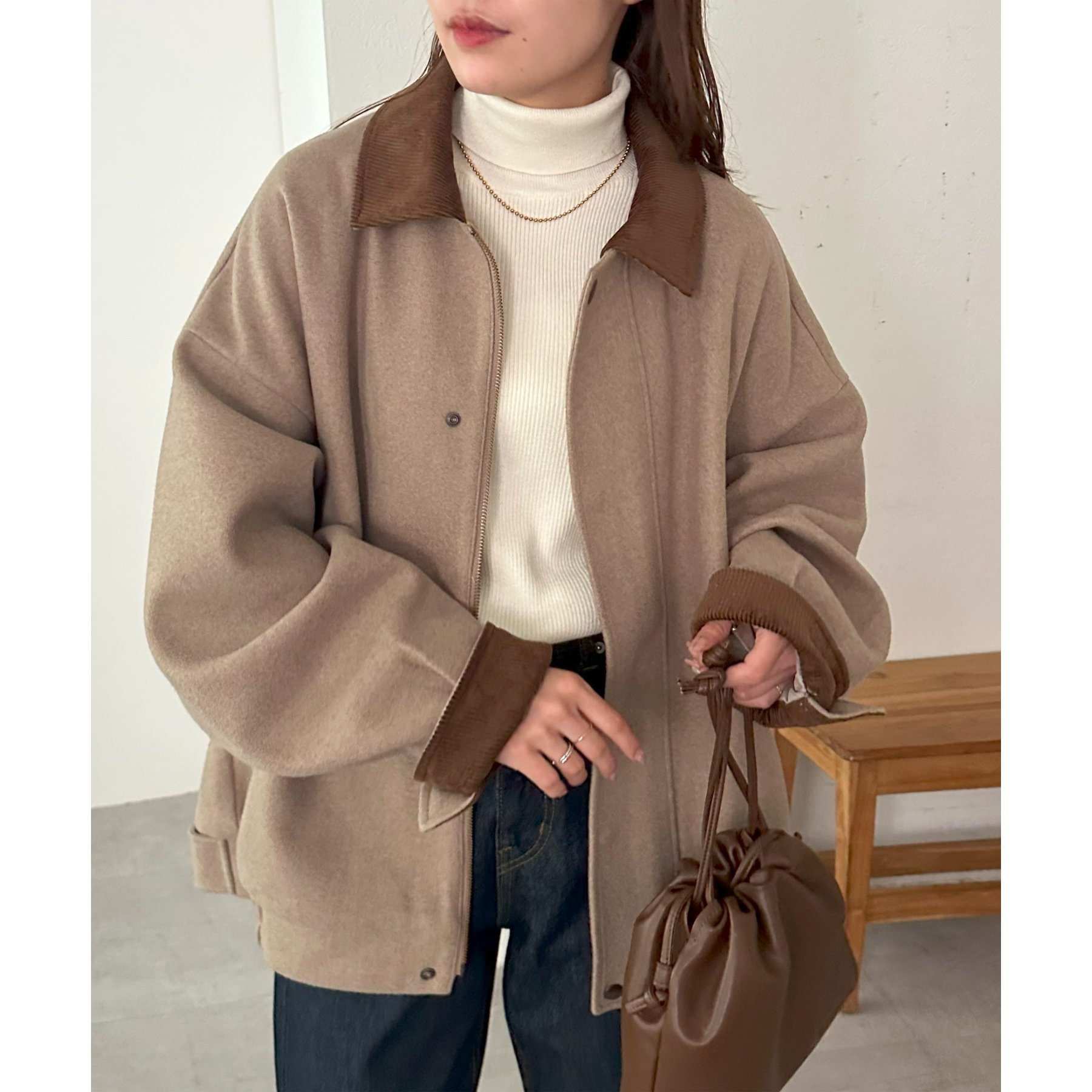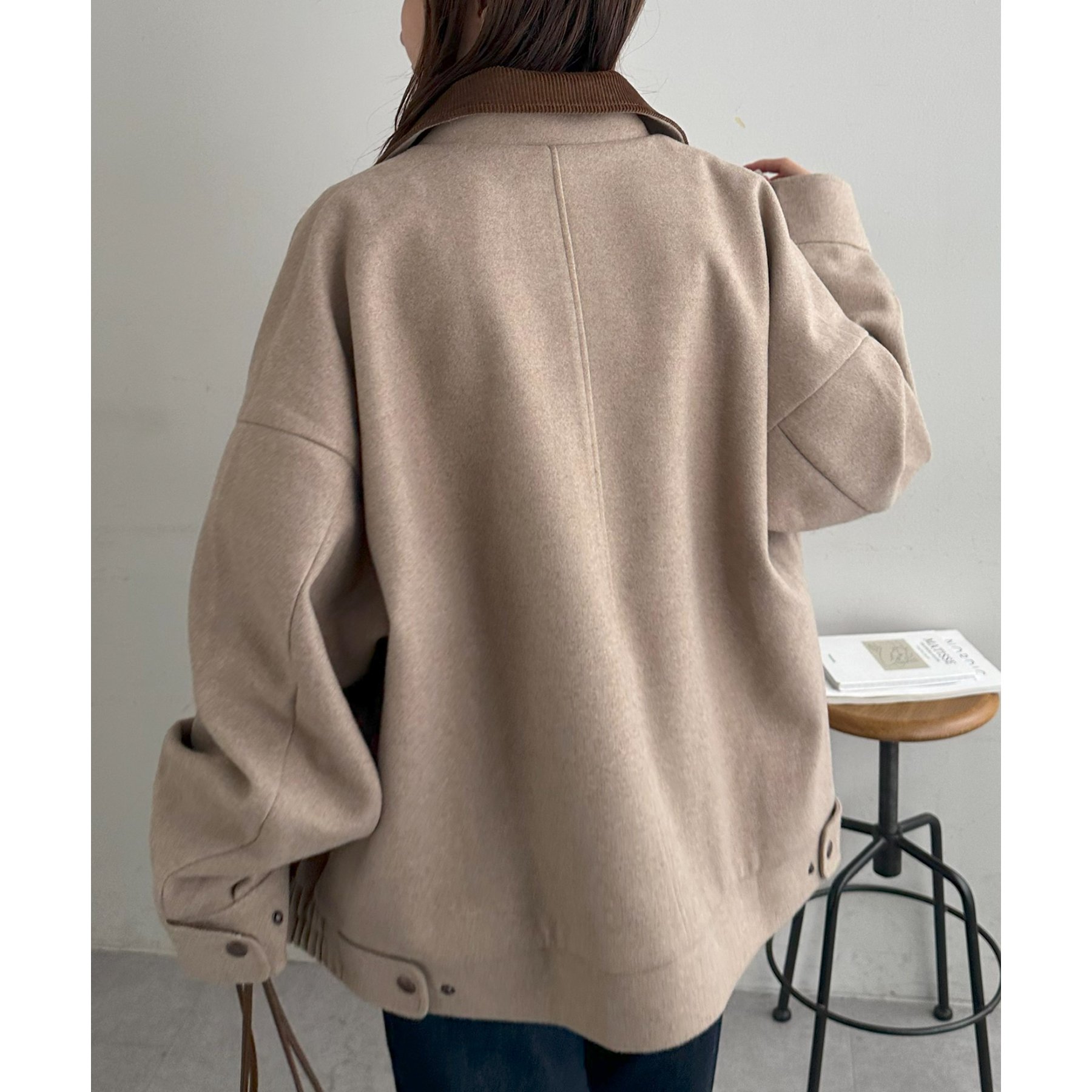 158cmレディーススタッフ(Mサイズ着用):オーバーサイズのニットやスウェットを着ているときに、腕回り部分が合うアウターが見つかりずらいのが悩みでしたが、こちらはアーム部分にもゆとりがありストレスフリーで着ることができます。