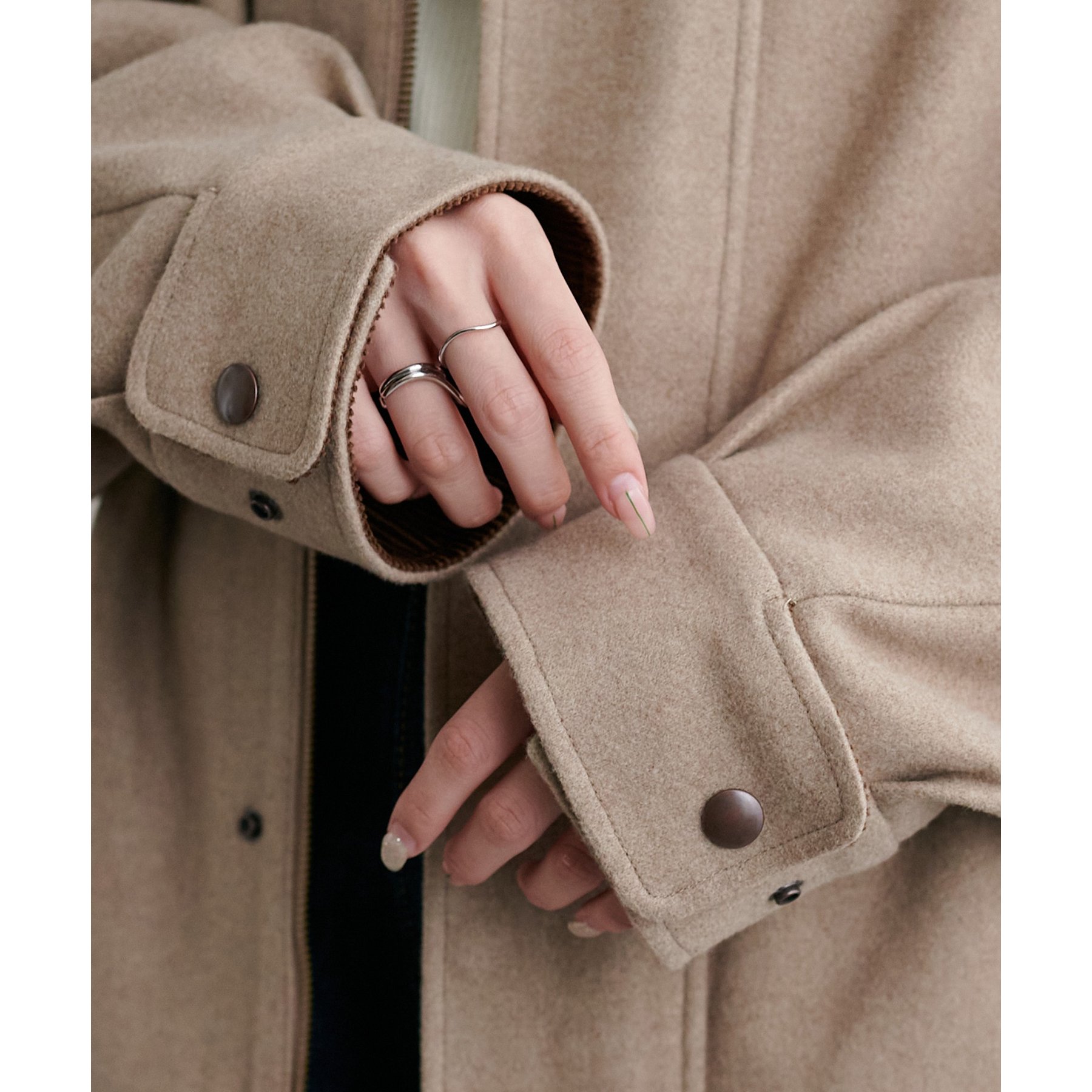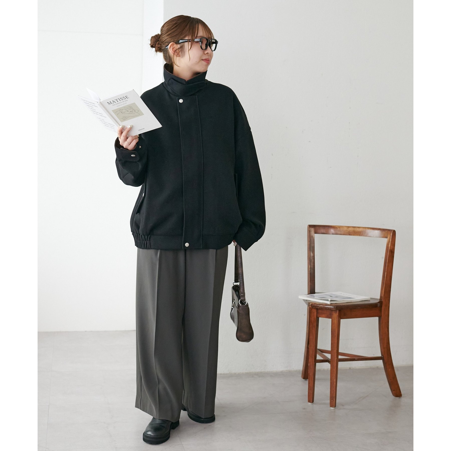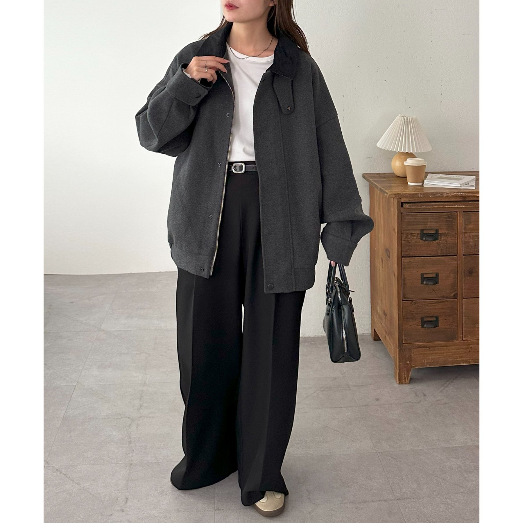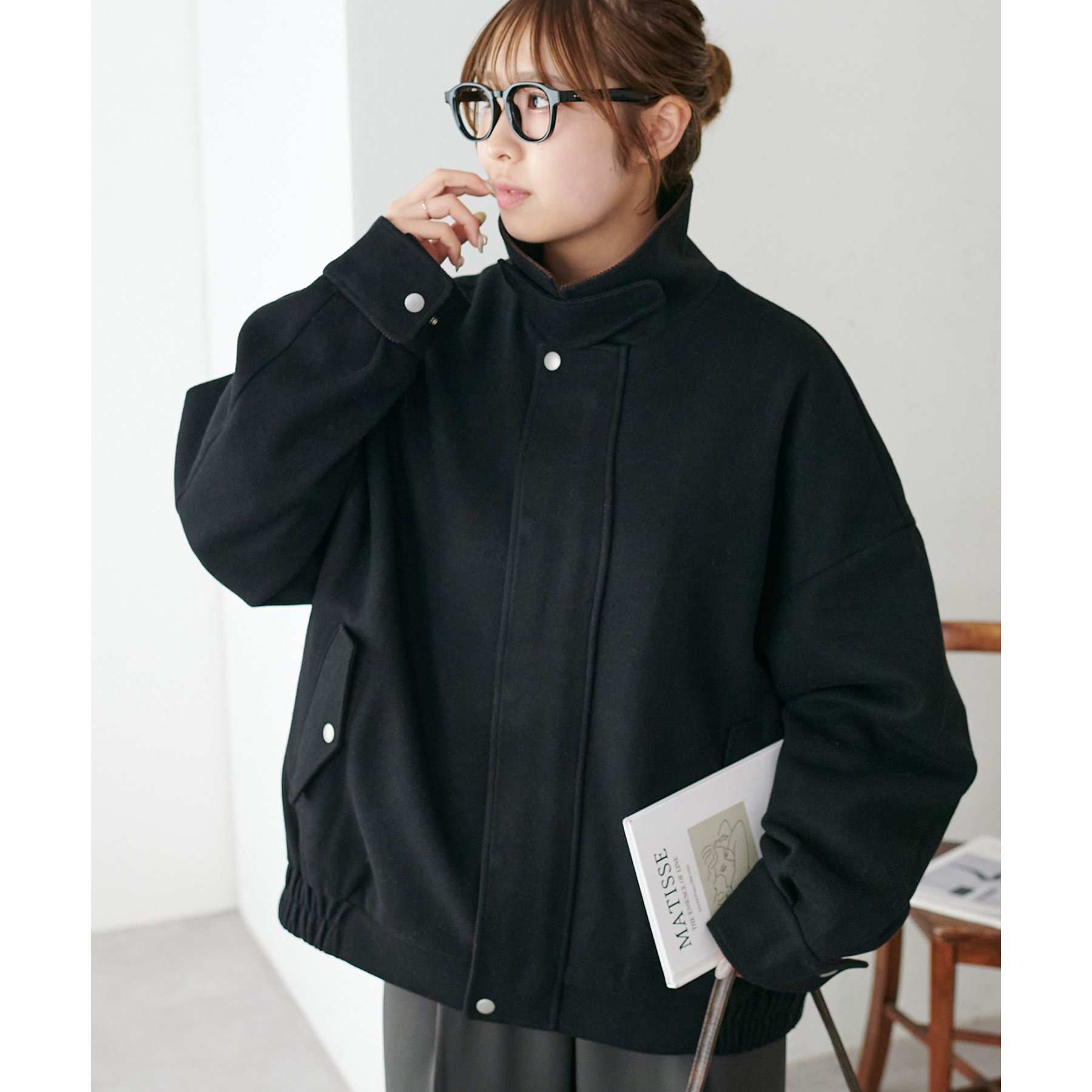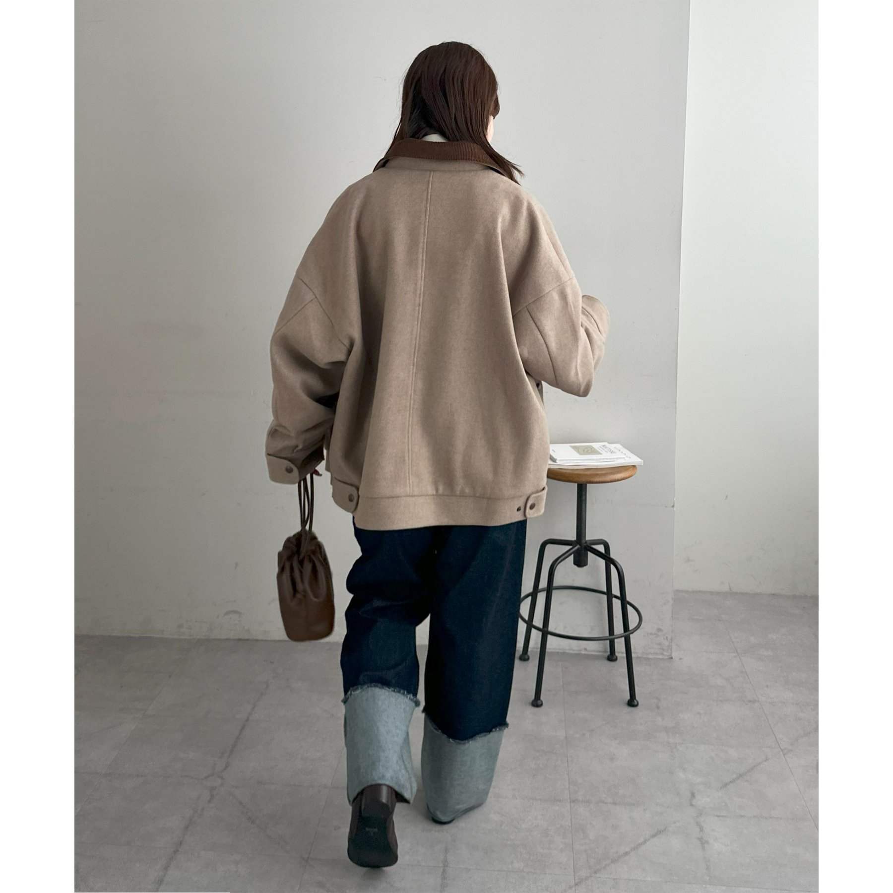 158cmレディーススタッフ(Mサイズ着用):オーバーサイズのニットやスウェットを着ているときに、腕回り部分が合うアウターが見つかりずらいのが悩みでしたが、こちらはアーム部分にもゆとりがありストレスフリーで着ることができます。