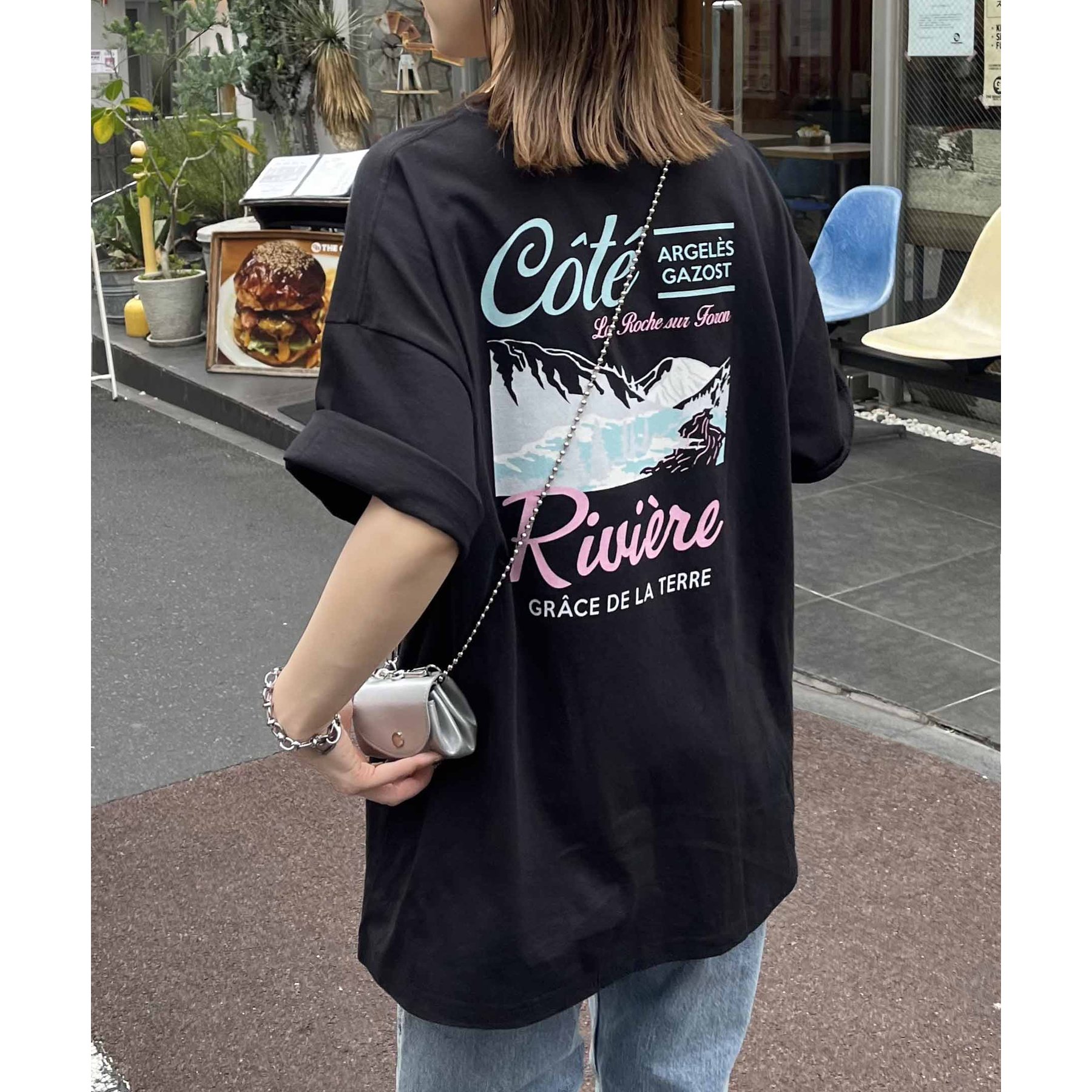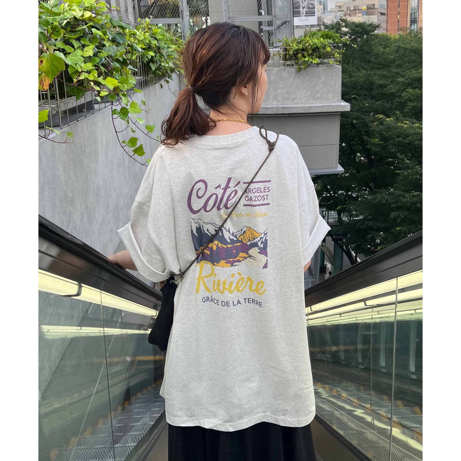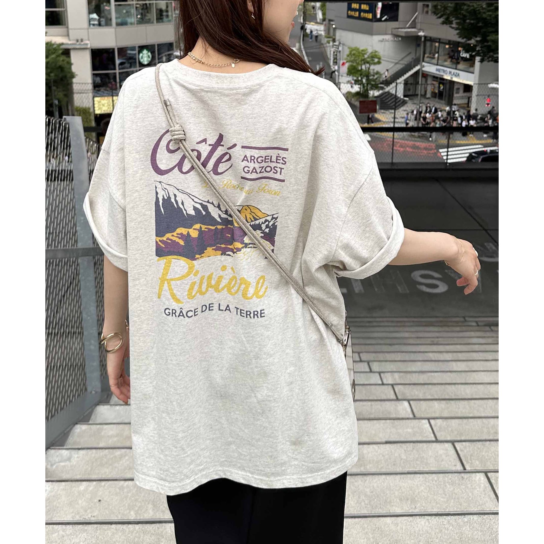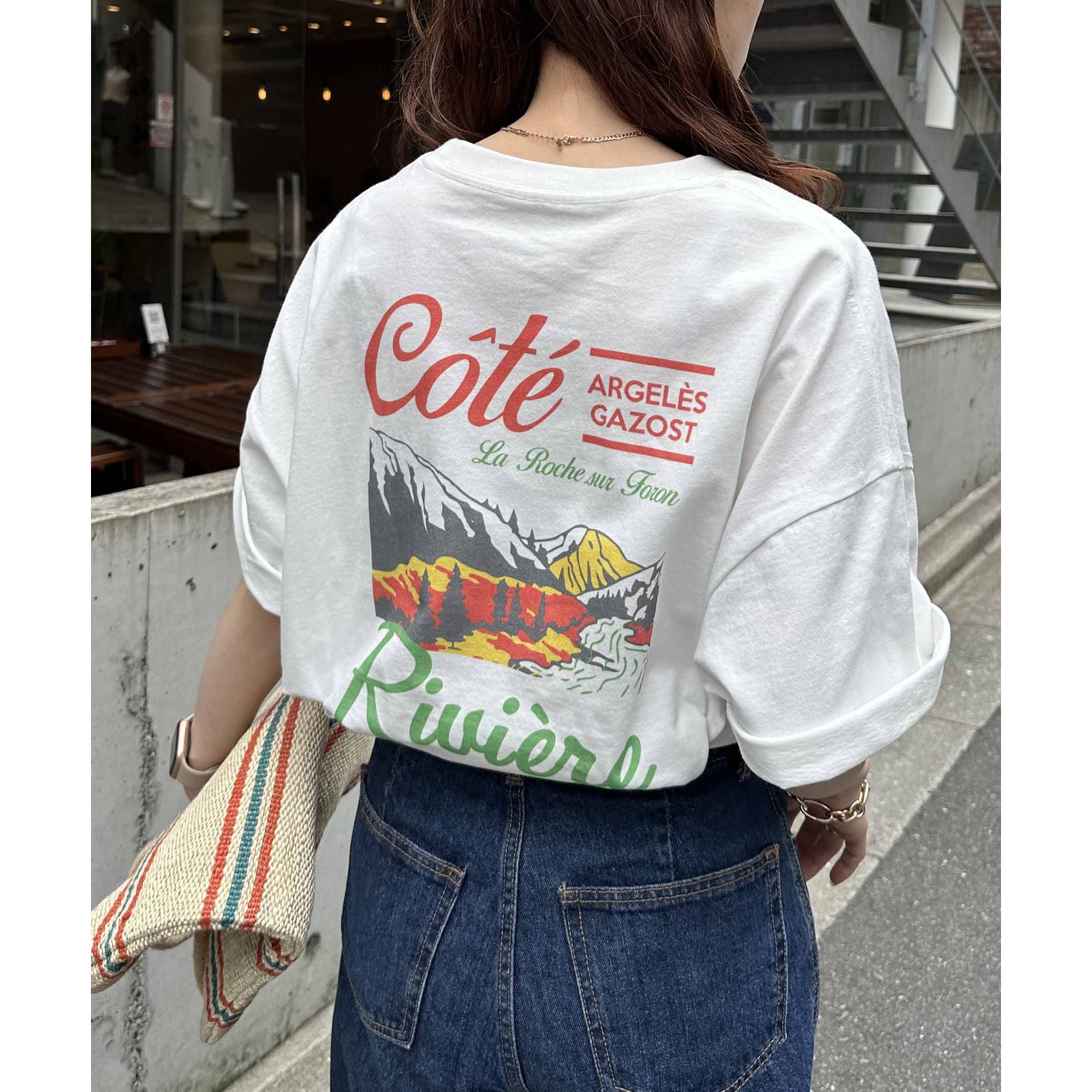 159cmレディーススタッフ:自然と目を惹くバックプリントで着るだけでこなれ感アップ!ヒップまですっぽり隠れる丈感で体型カバーも◎