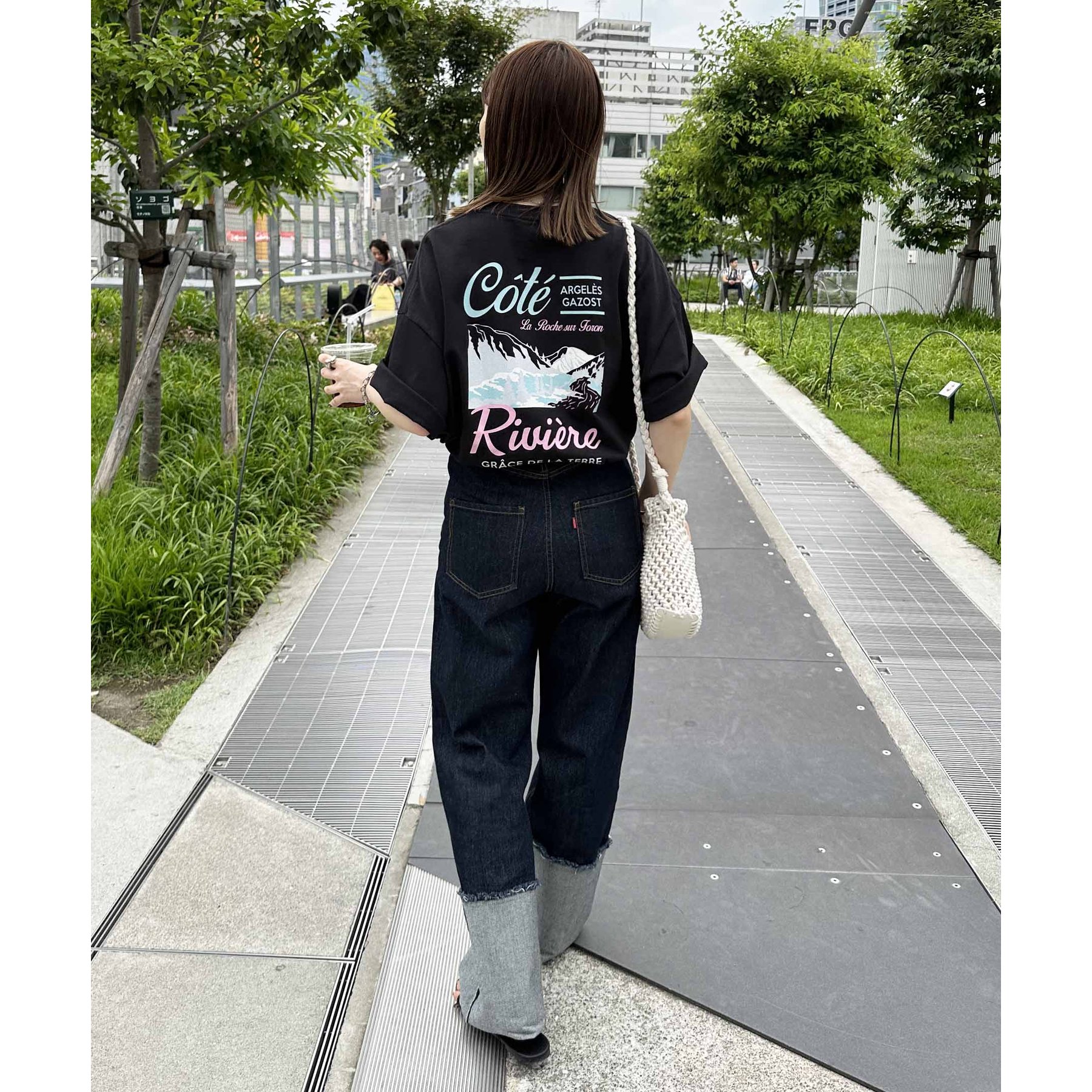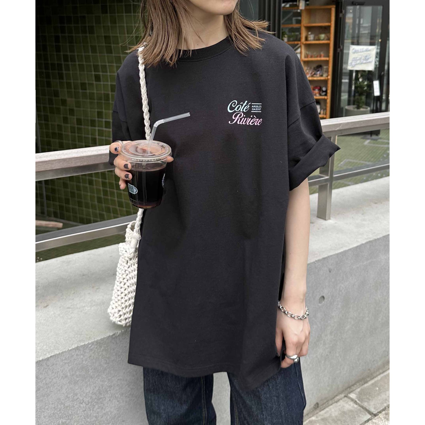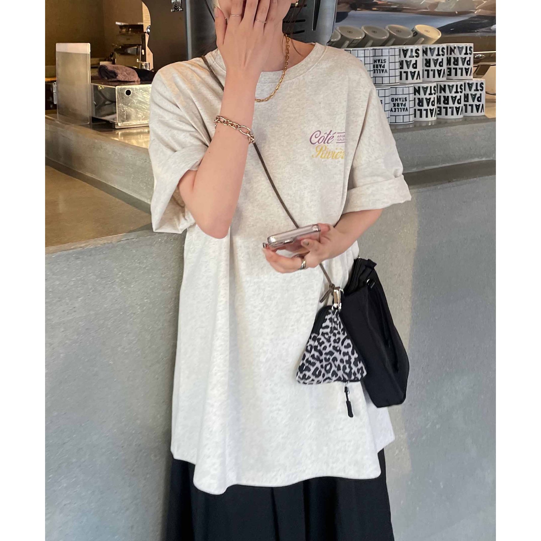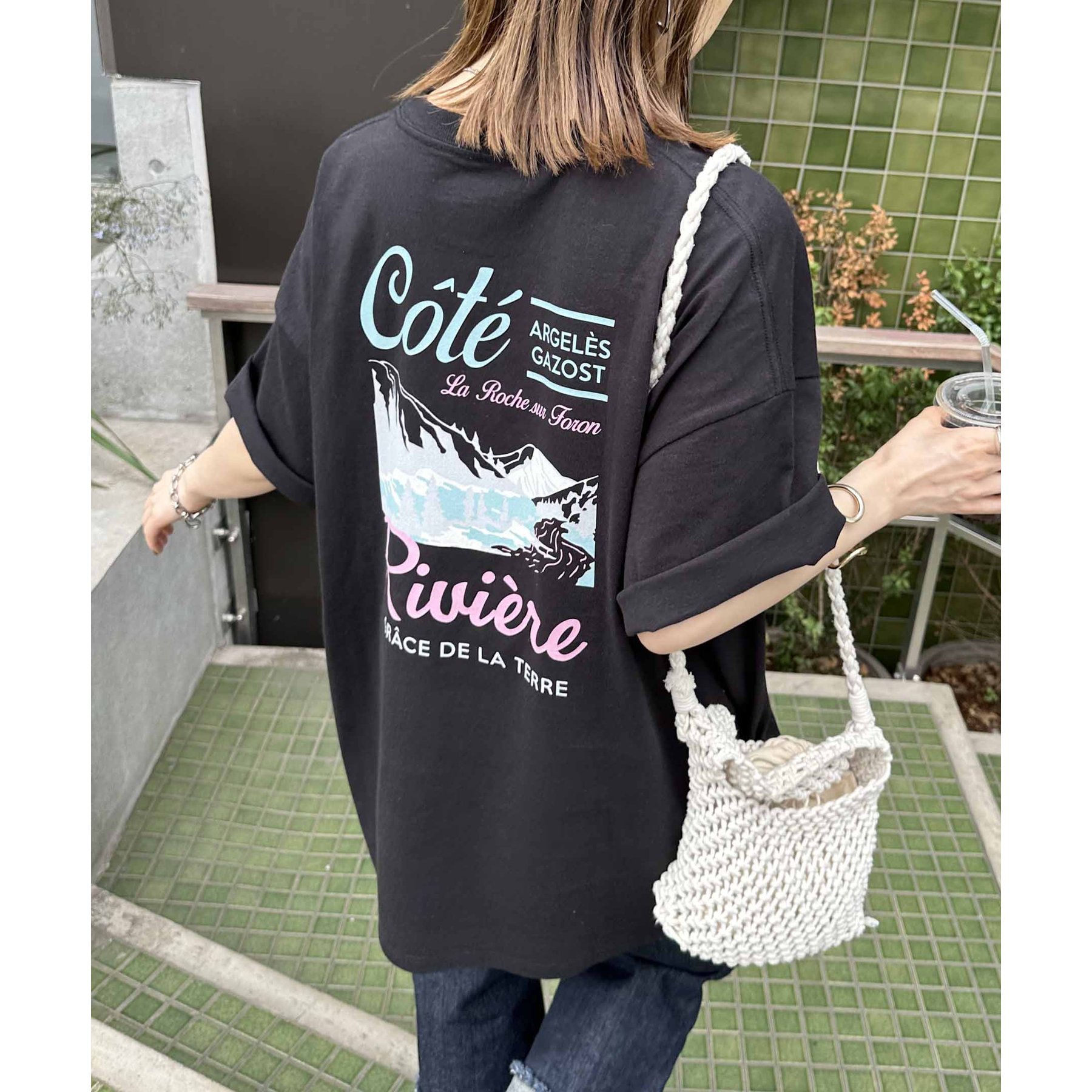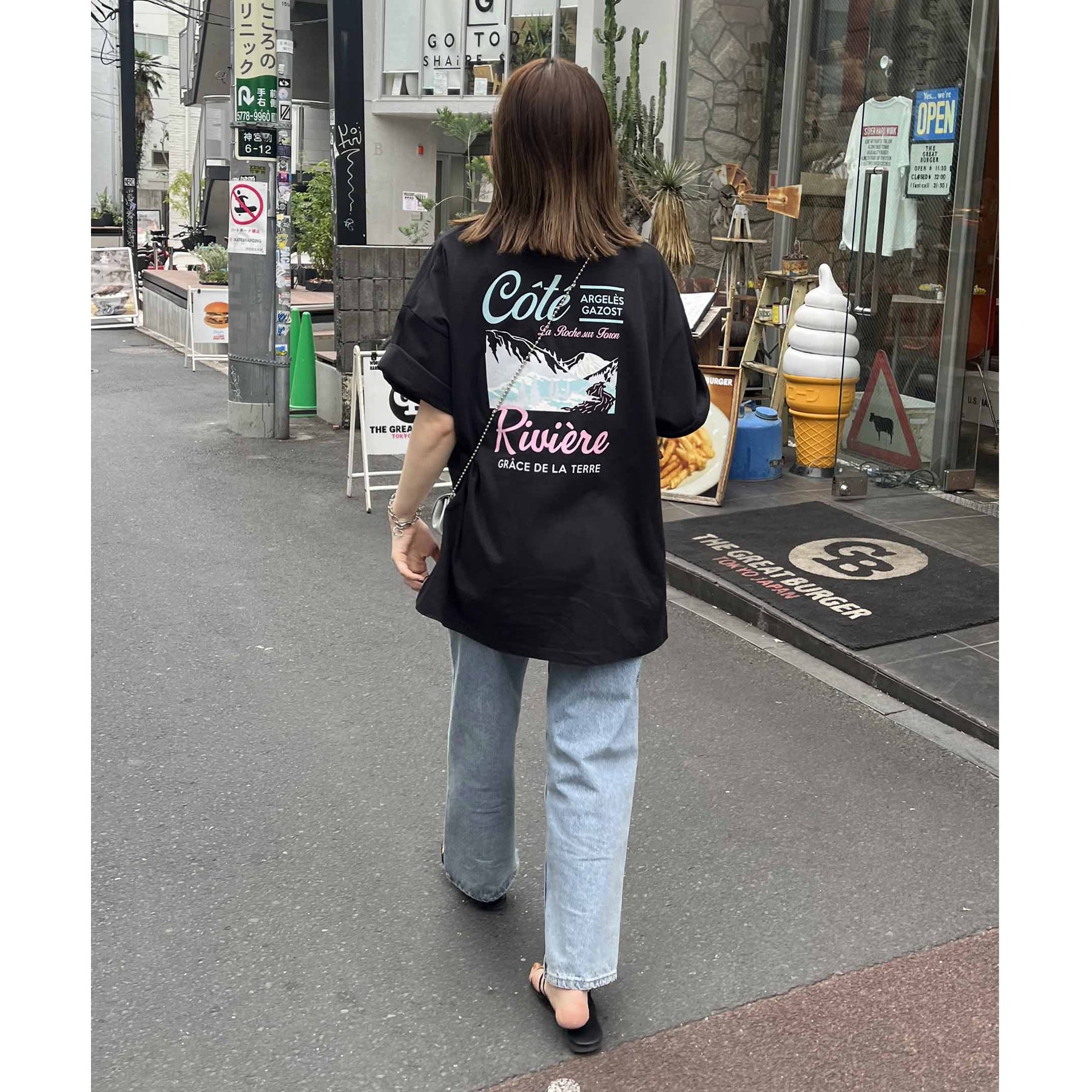 159cmレディーススタッフ:自然と目を惹くバックプリントで着るだけでこなれ感アップ!ヒップまですっぽり隠れる丈感で体型カバーも◎
