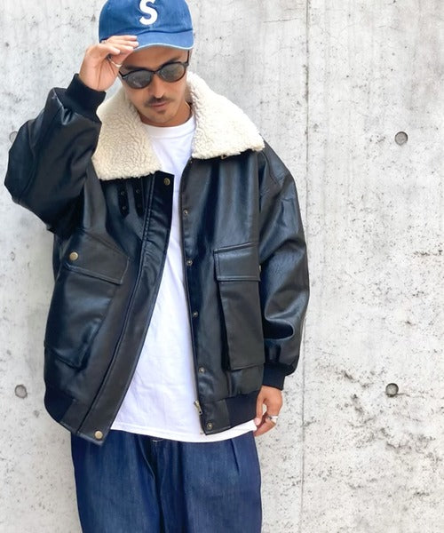 《メンズもお揃いで着れちゃう、襟ボアレザージャケット》