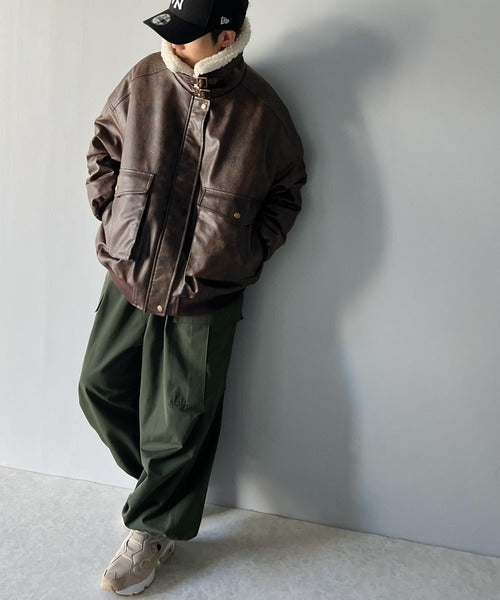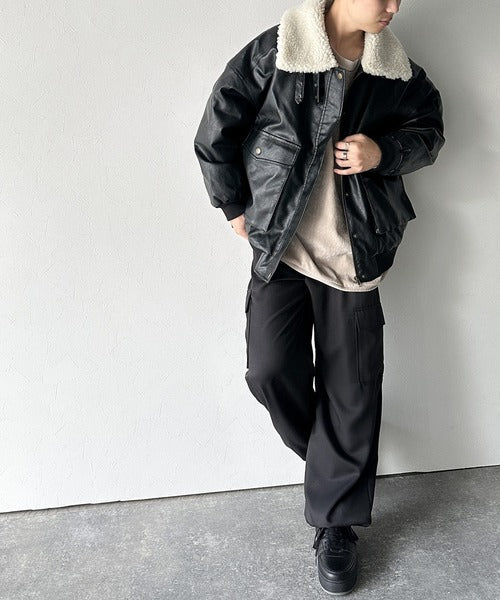 一癖効かせた衿ボアフェイクレザージャケット。