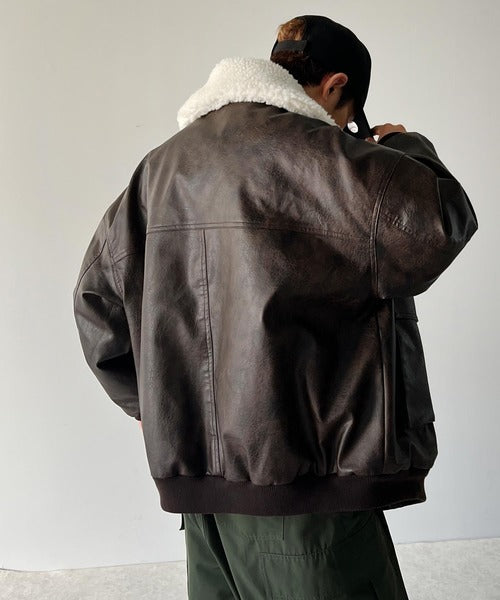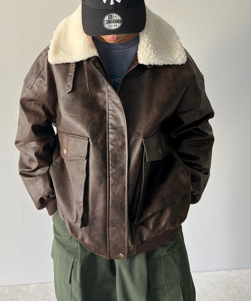 衿ボア配色がポイントのヴィンテージライクなフェイクレザージャケット。