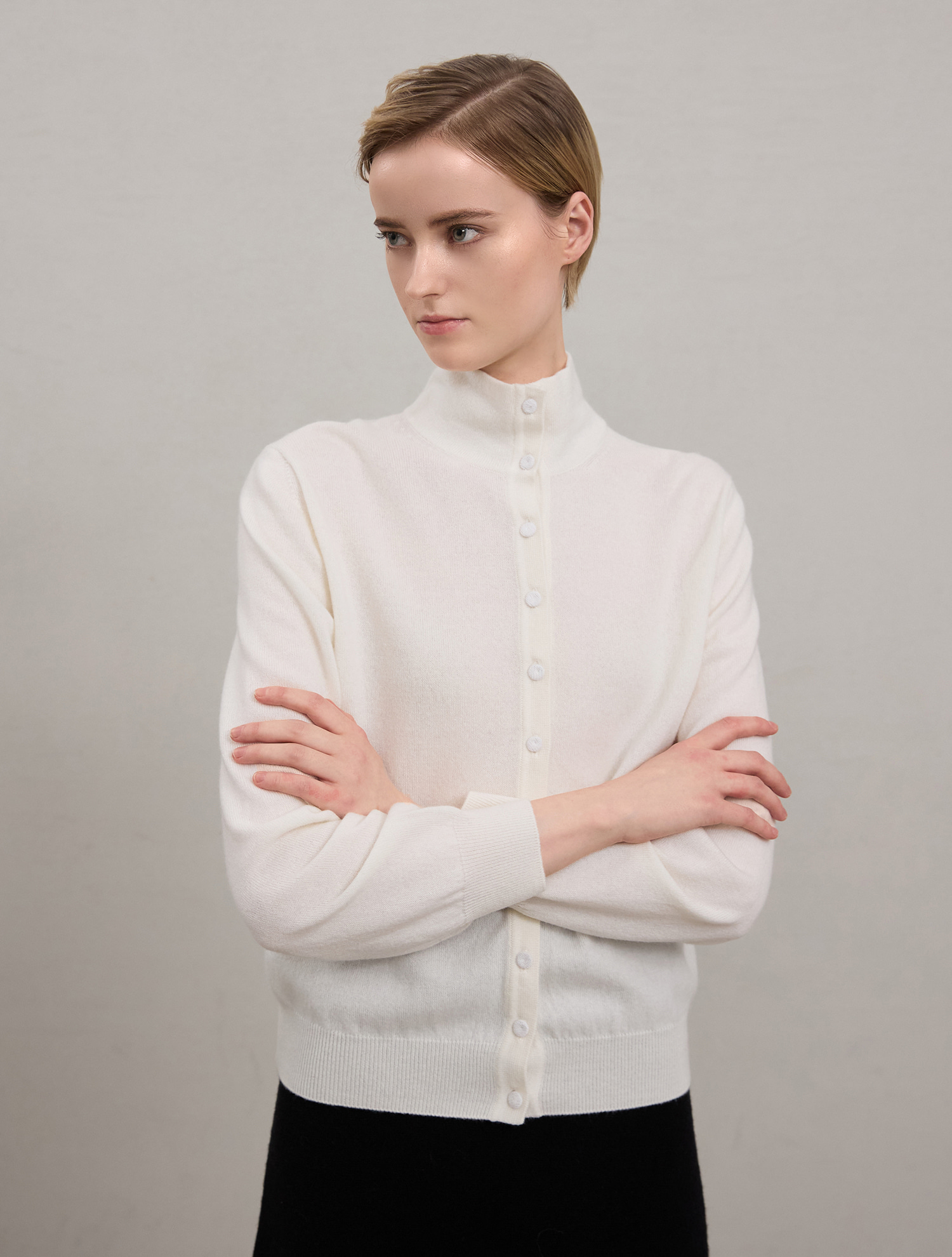 [Cashmere 100%] Half-Neck Soft Knit Cardigan - Ivory