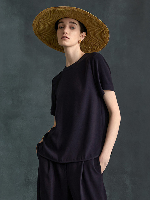 뒤트임 포인트의 블라우스 라운드 넥으로 간결하고 베이직하게 착용가능한 아이템