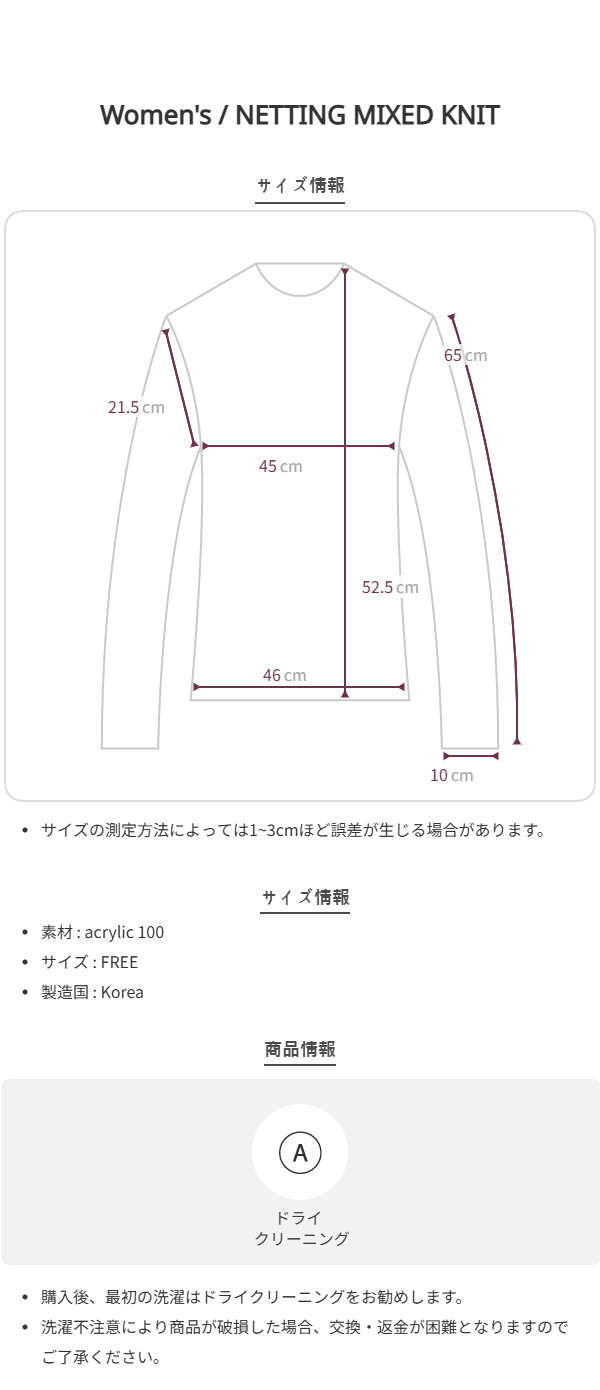total length 52.5 Chest 45 Hem46 Armhole 21.5 sleeves 65 sleeves Opening 10