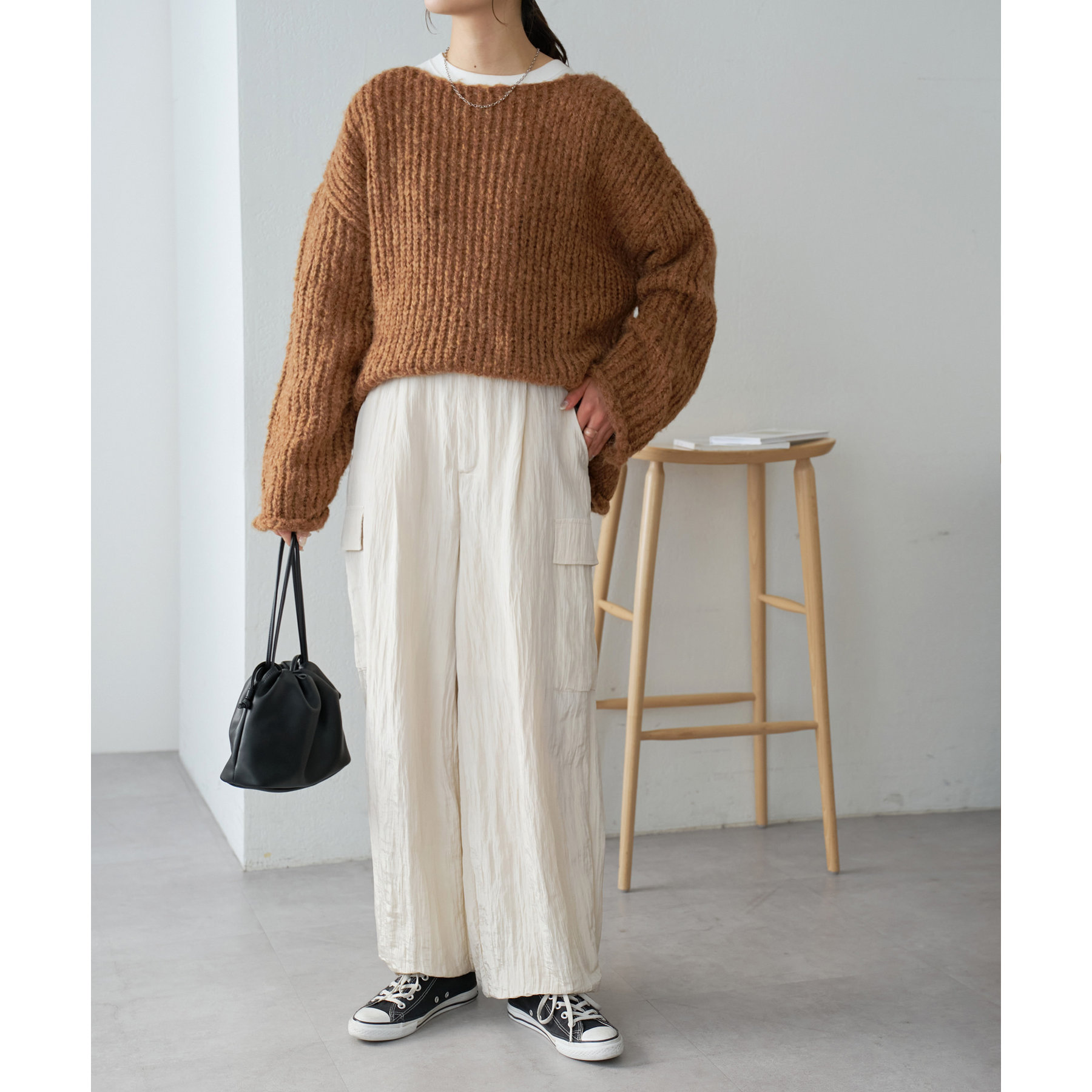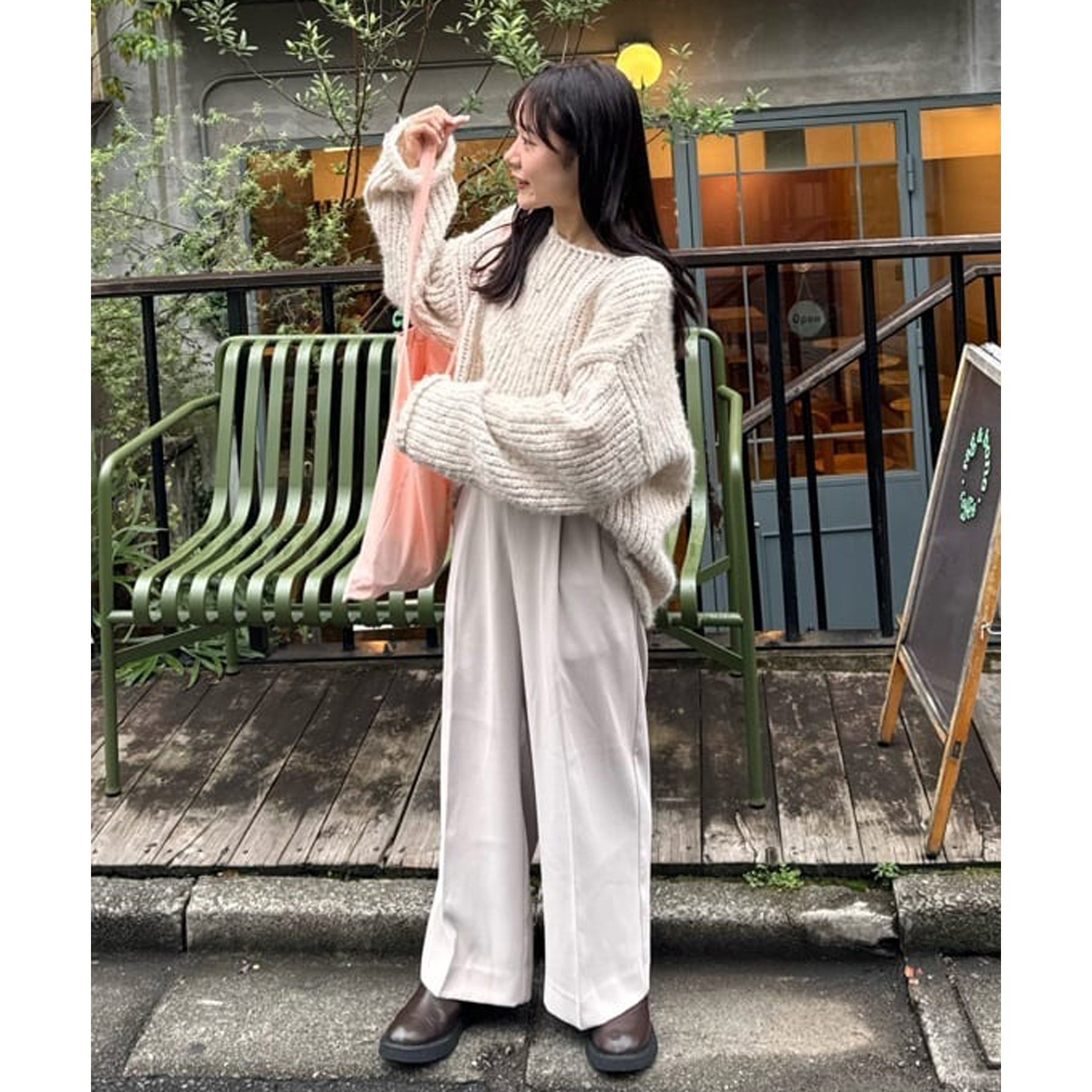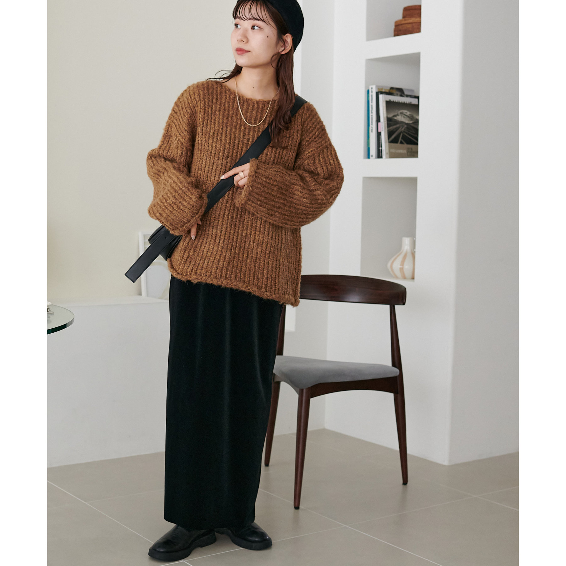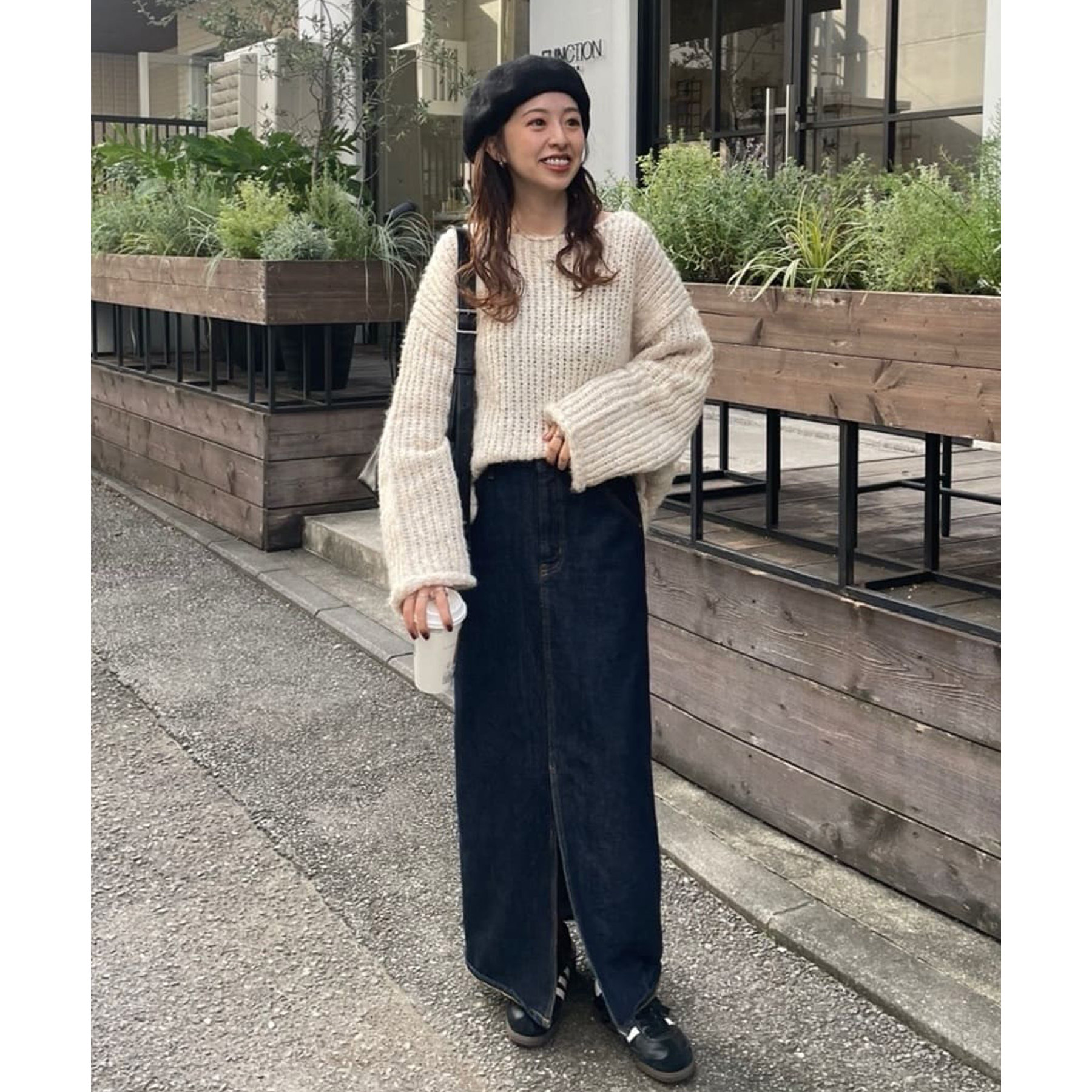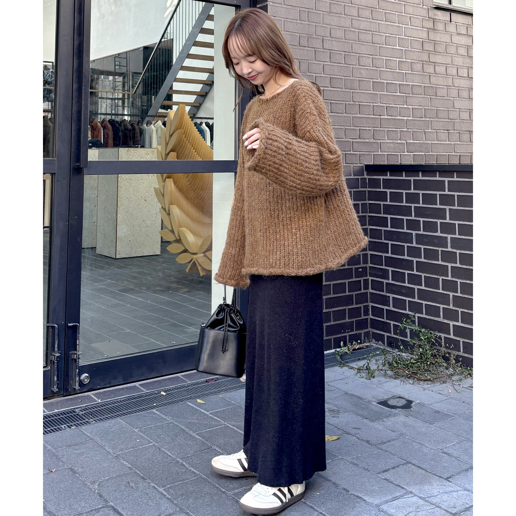 着丈は長めなので、腰回りをカバー。ボリューム感のあるニットが女性らしい雰囲気に〇