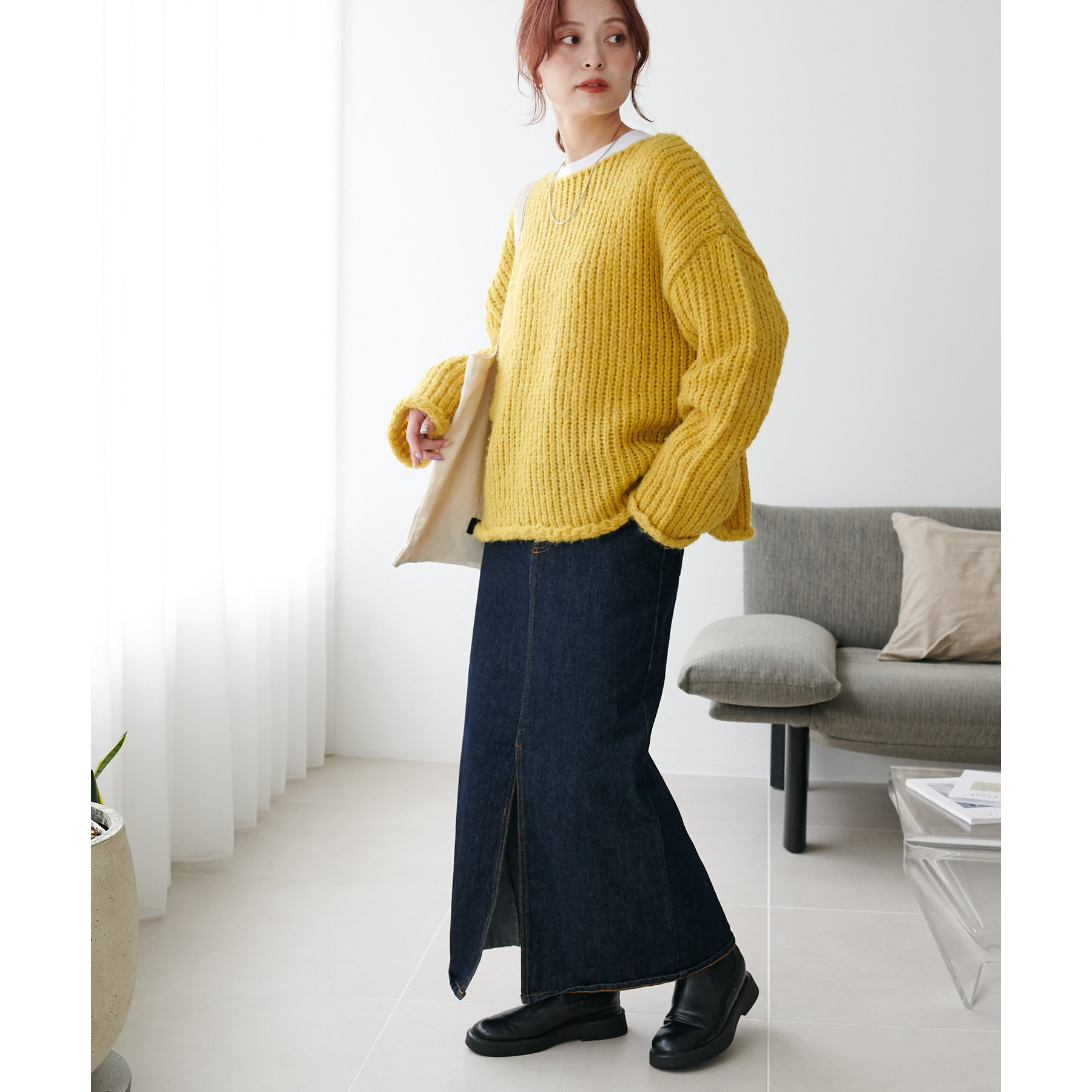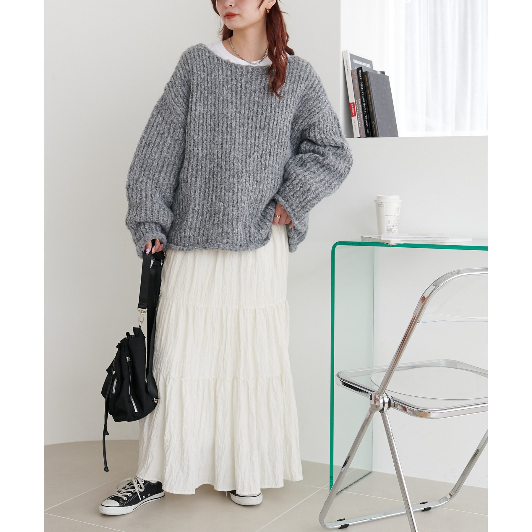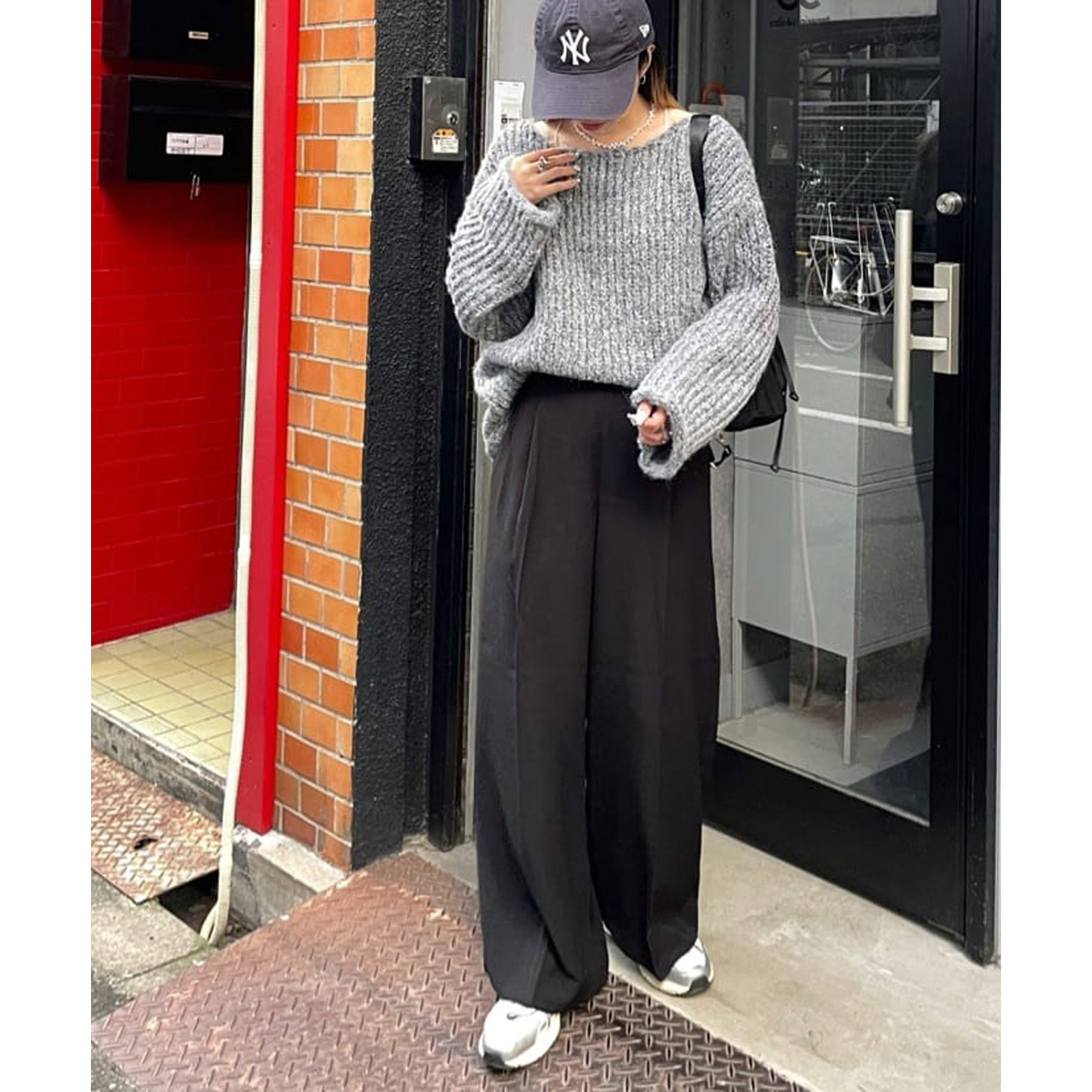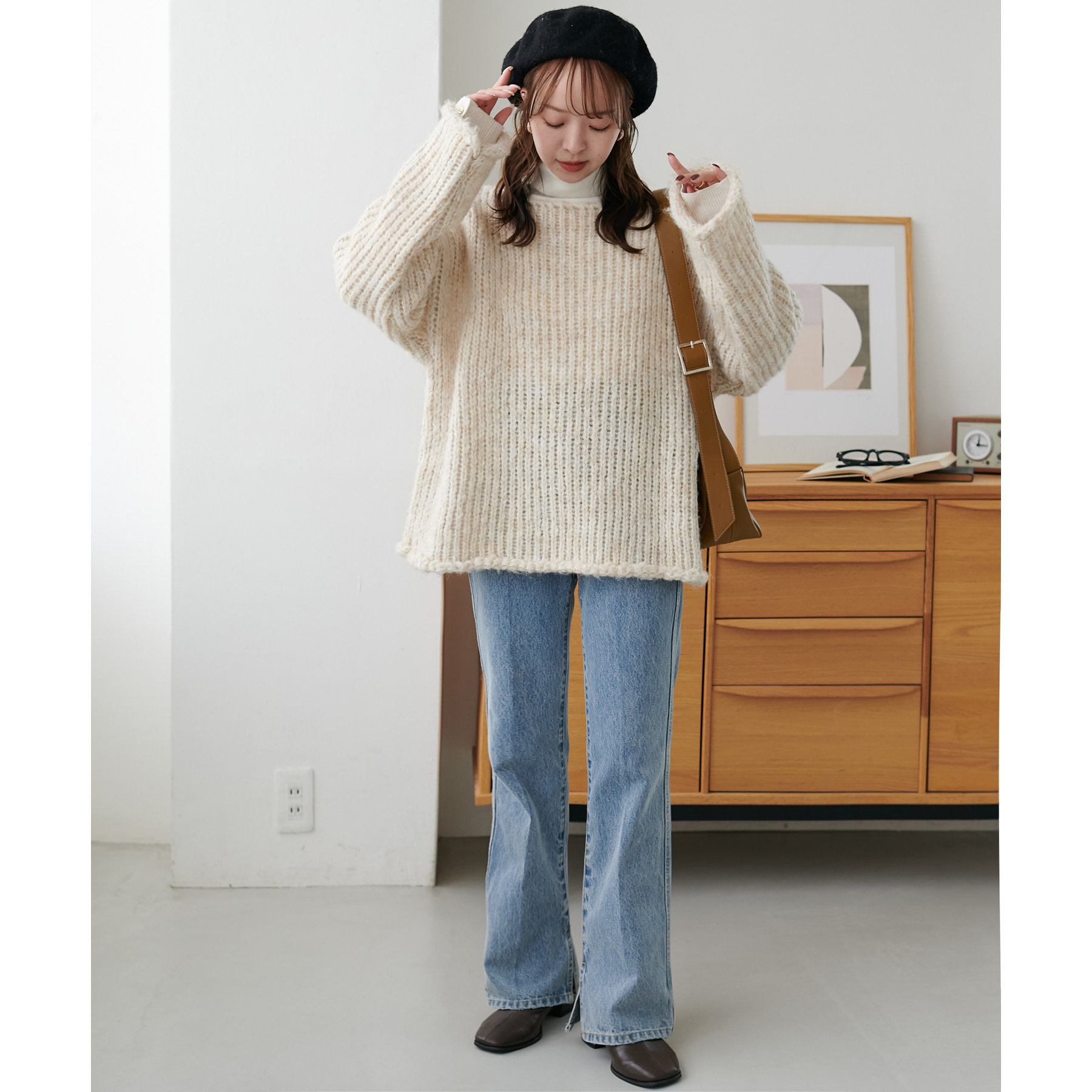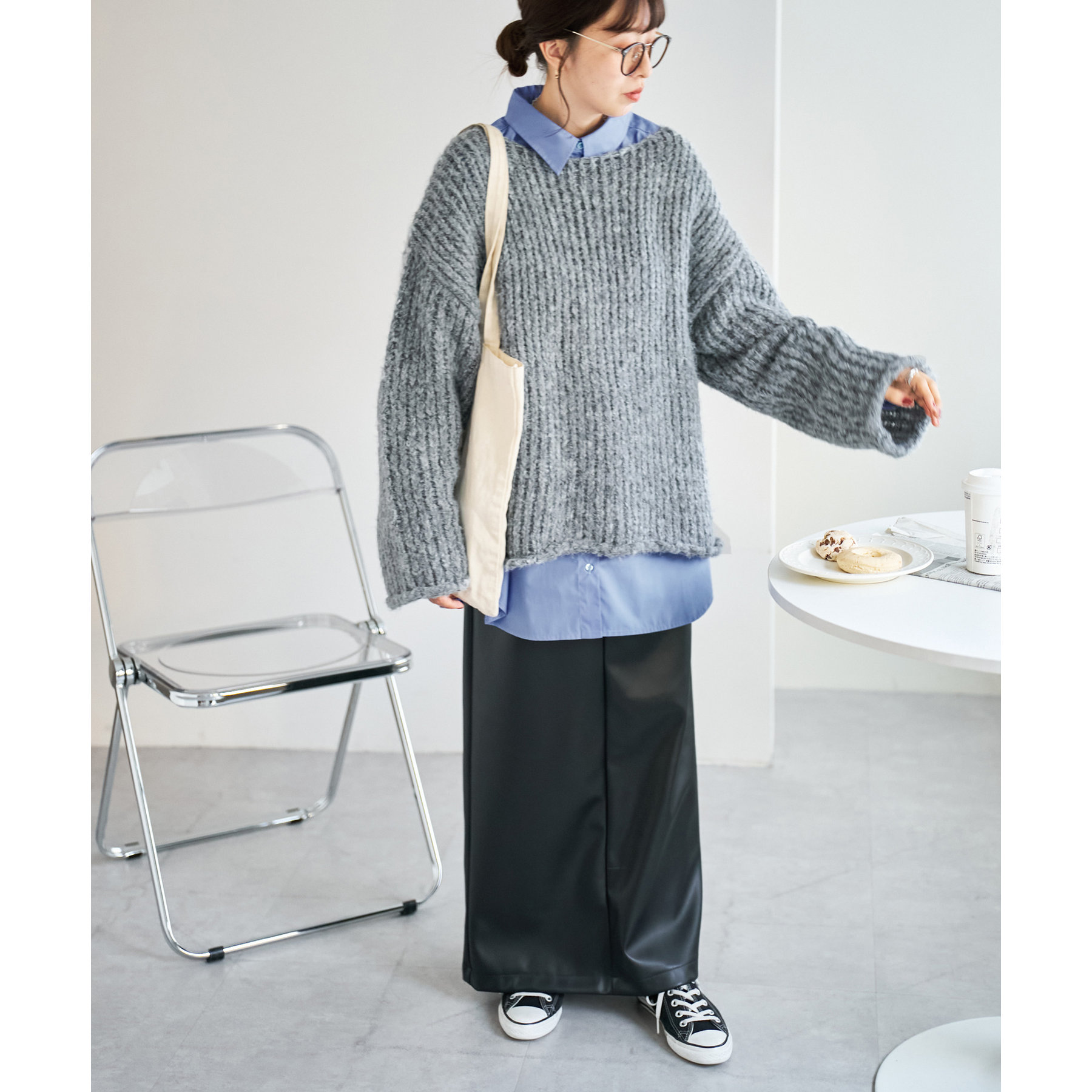 着丈は長めなので、腰回りをカバー。ボリューム感のあるニットが女性らしい雰囲気に〇