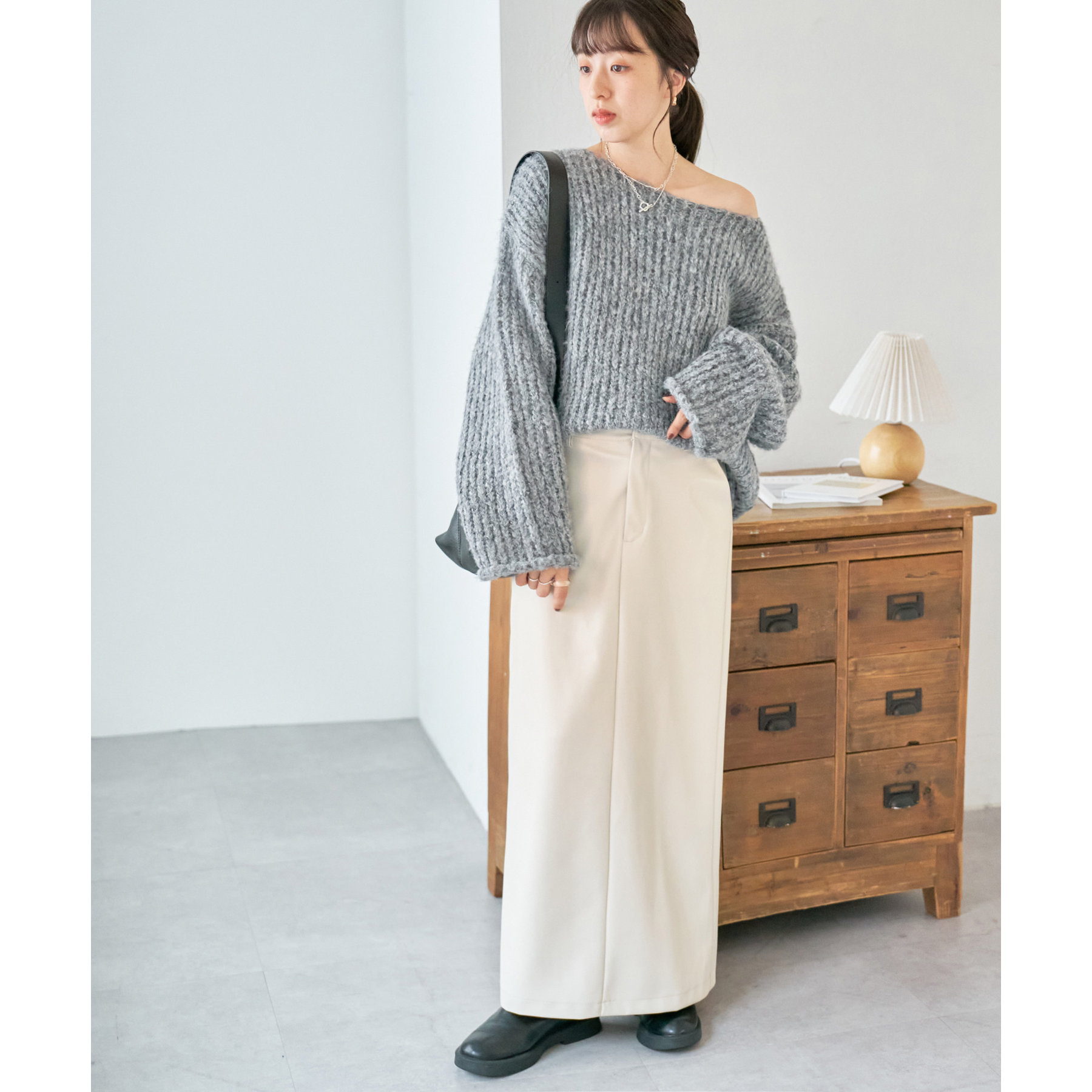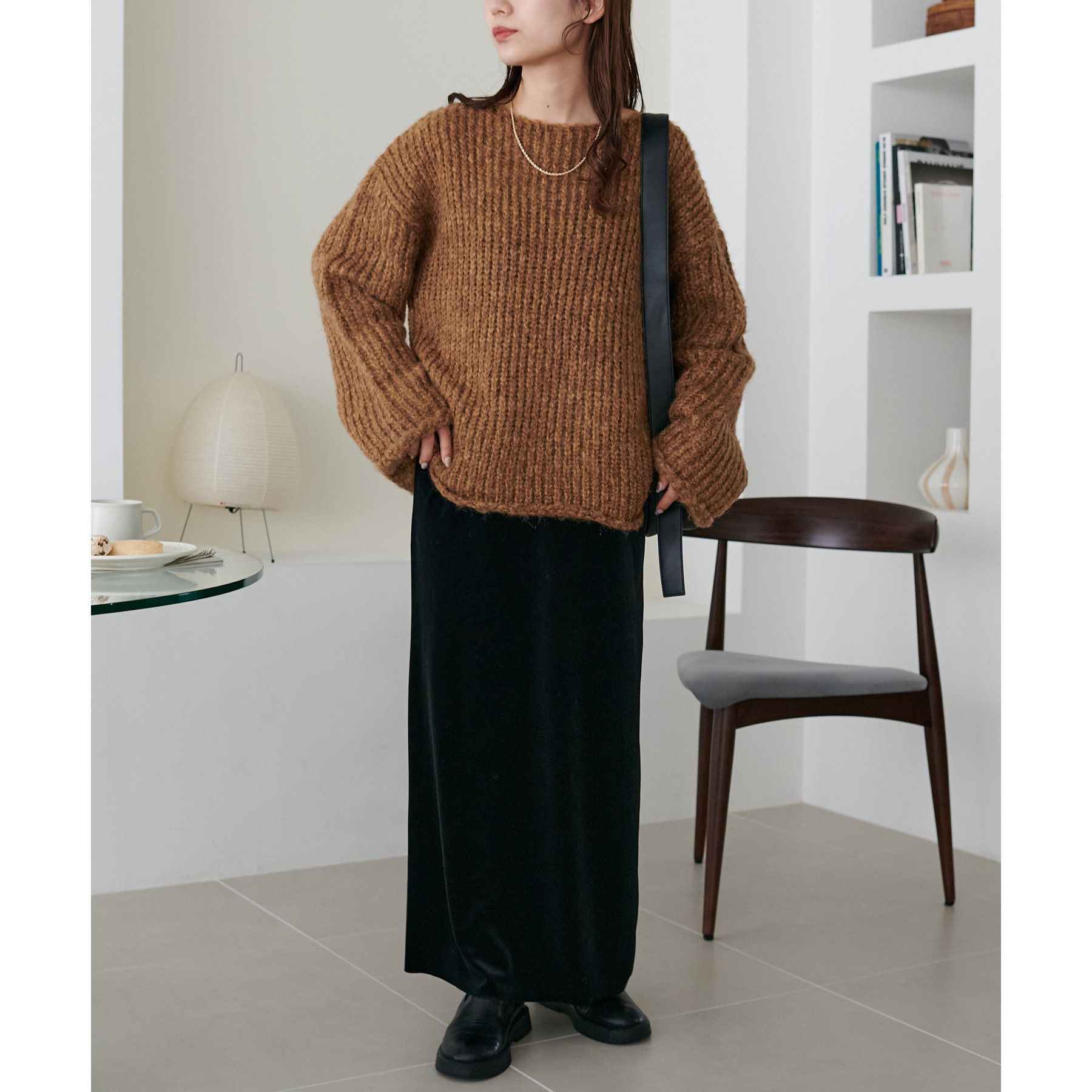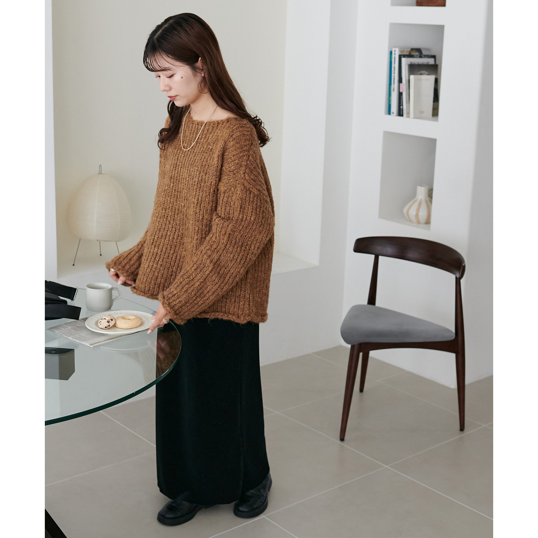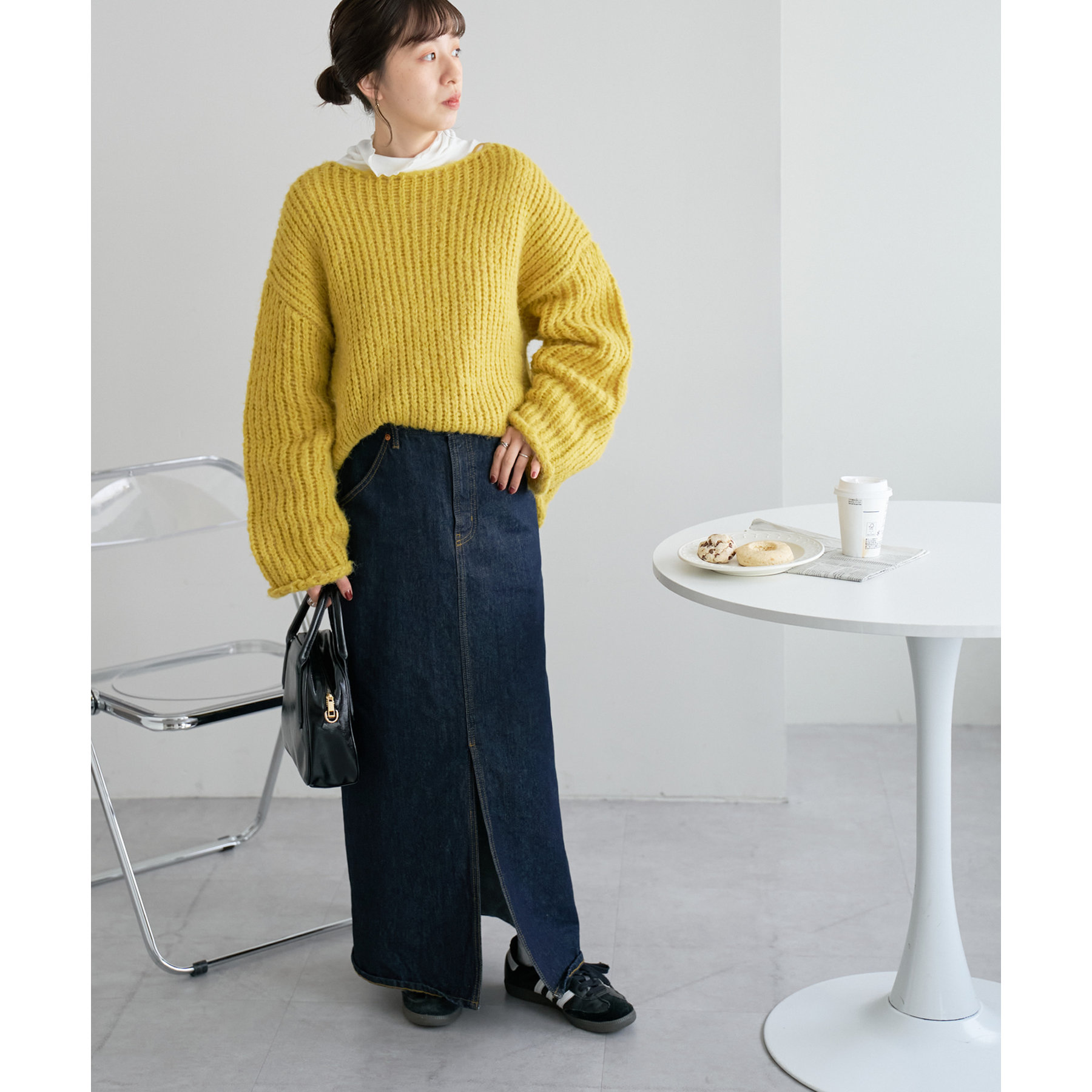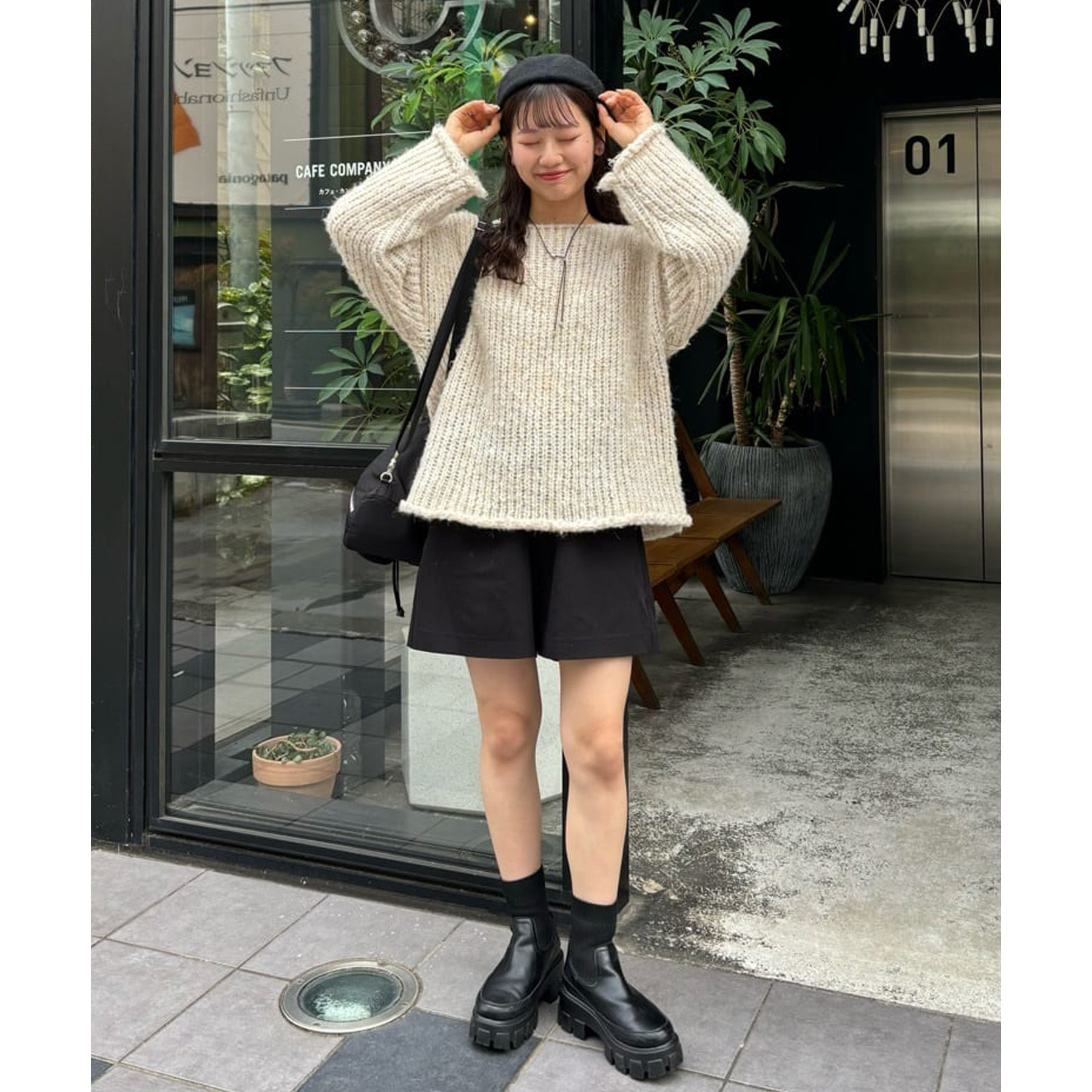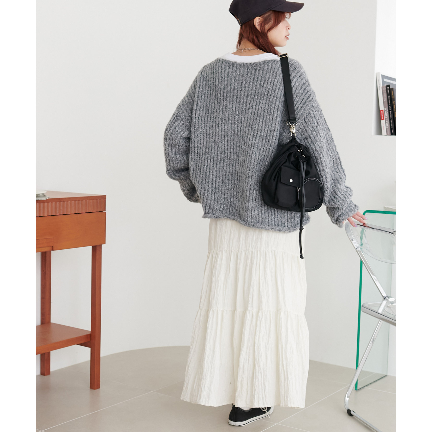 着丈は長めなので、腰回りをカバー。ボリューム感のあるニットが女性らしい雰囲気に〇