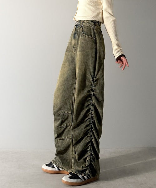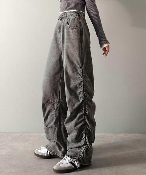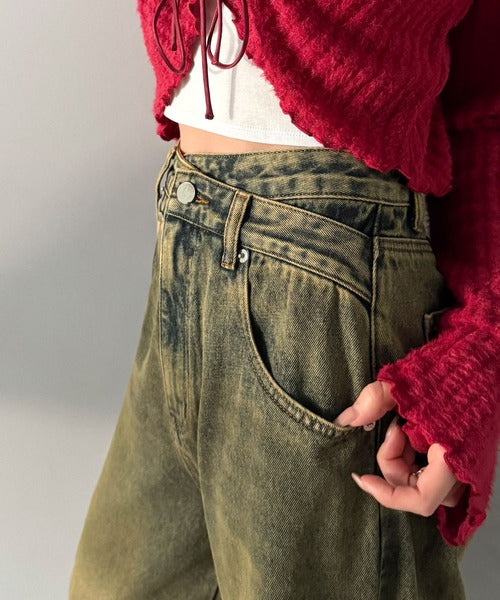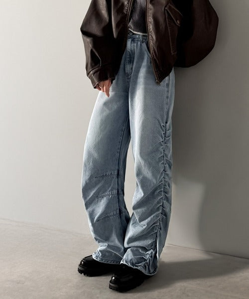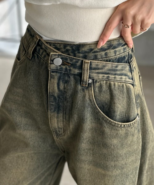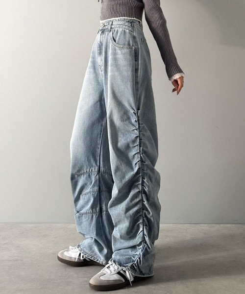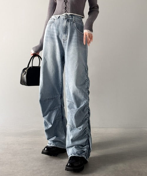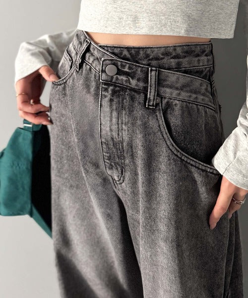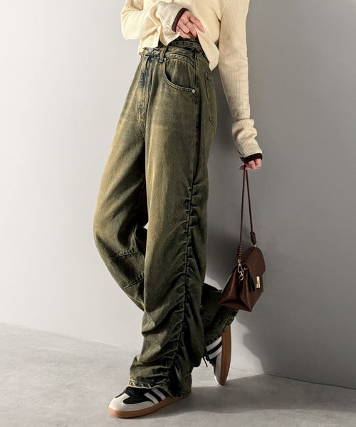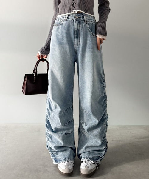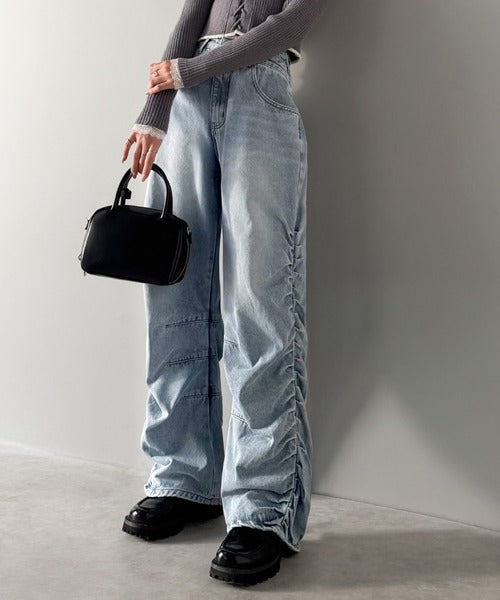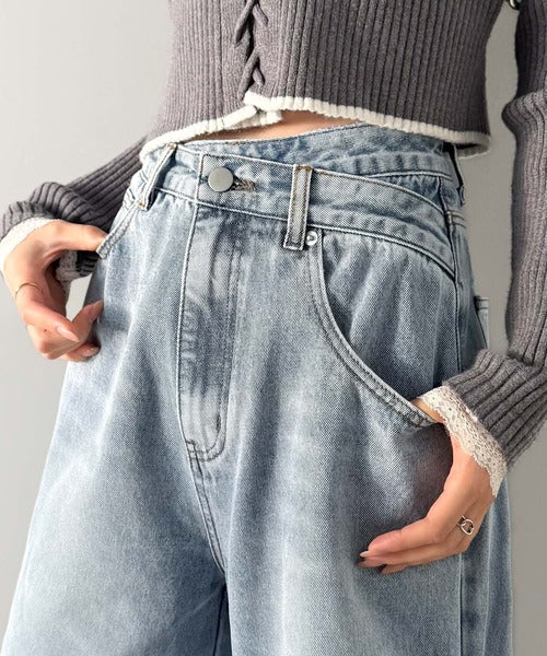 【mily bilet】「あのデニム、超かわいい…!」街で振り返られるトレンドデザイン。サイドギャザーウエストアシメデザインデニムパンツ mi0909021
