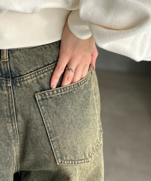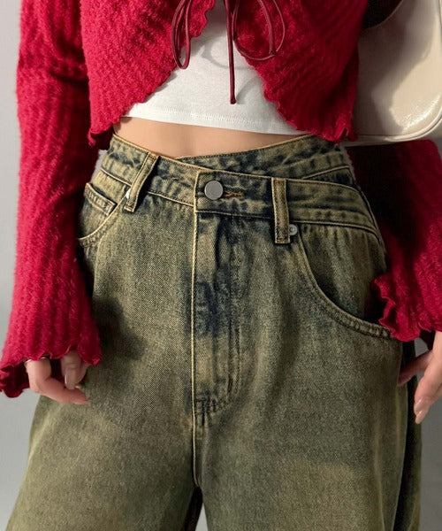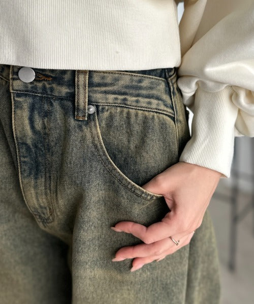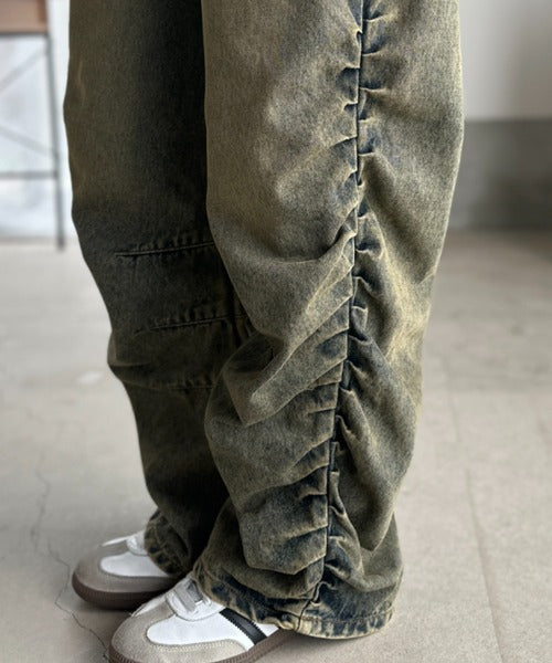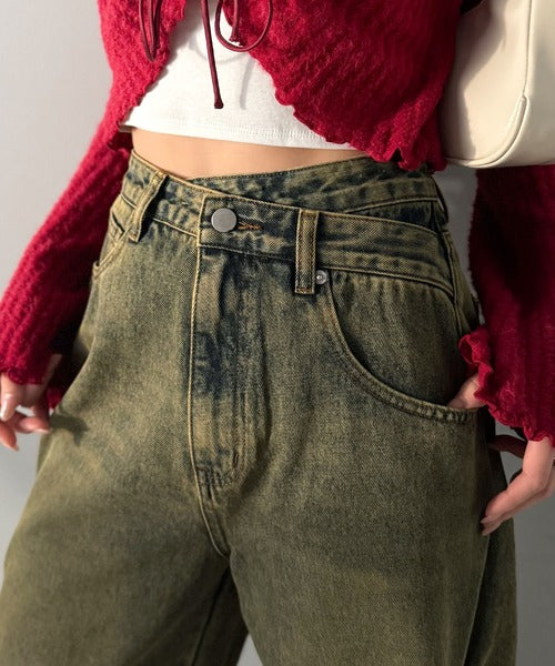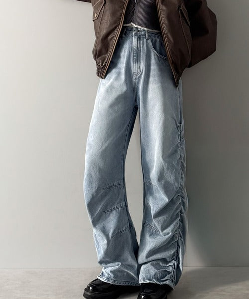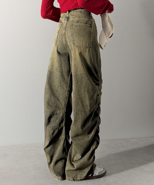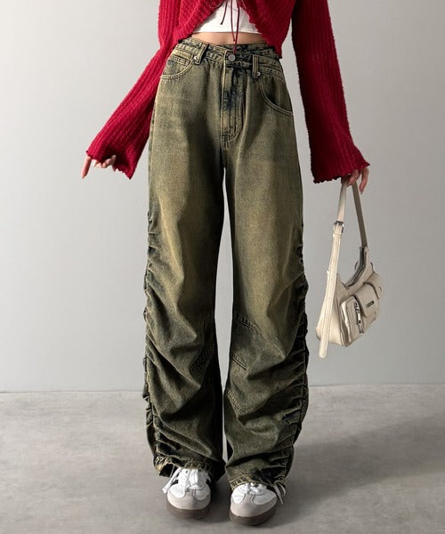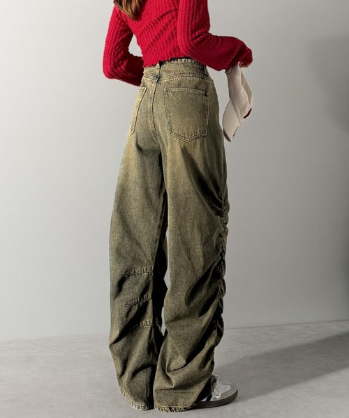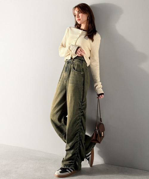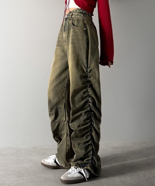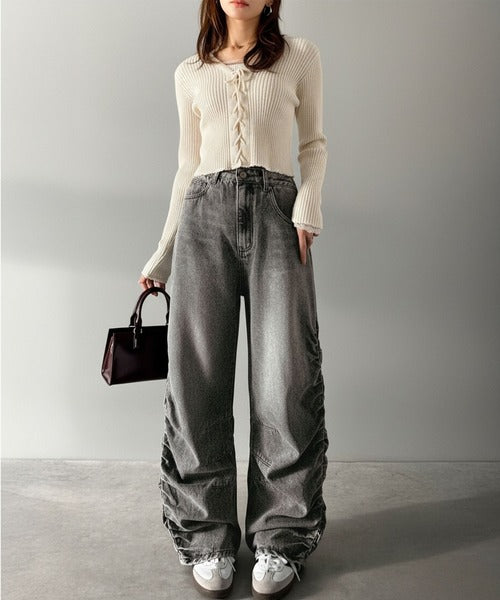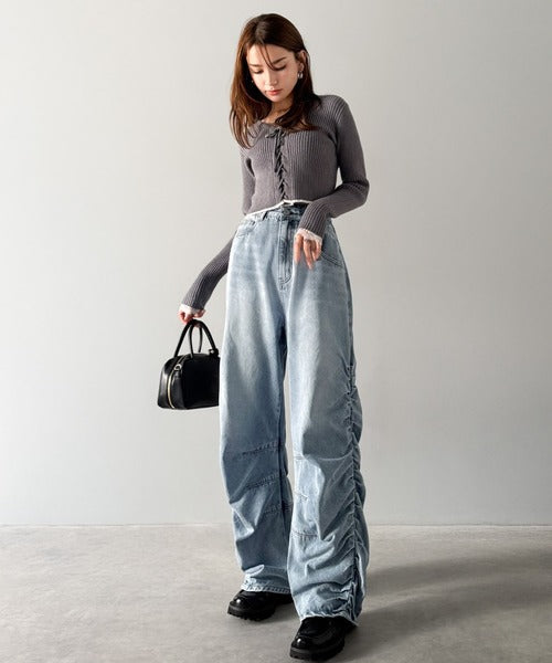 【mily bilet】「あのデニム、超かわいい…!」街で振り返られるトレンドデザイン。サイドギャザーウエストアシメデザインデニムパンツ mi0909021