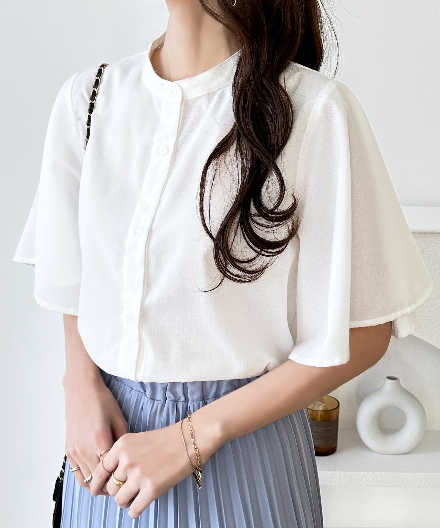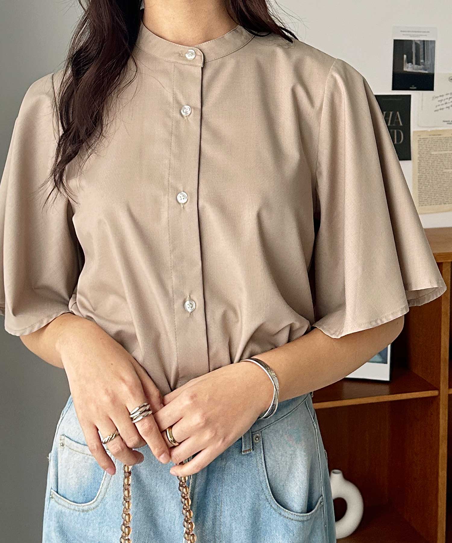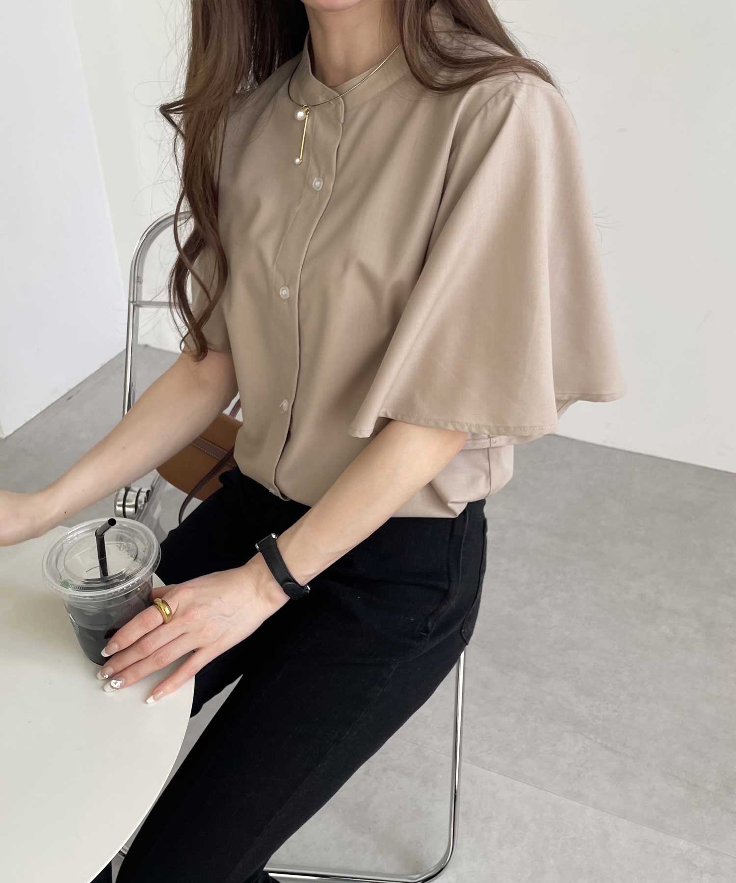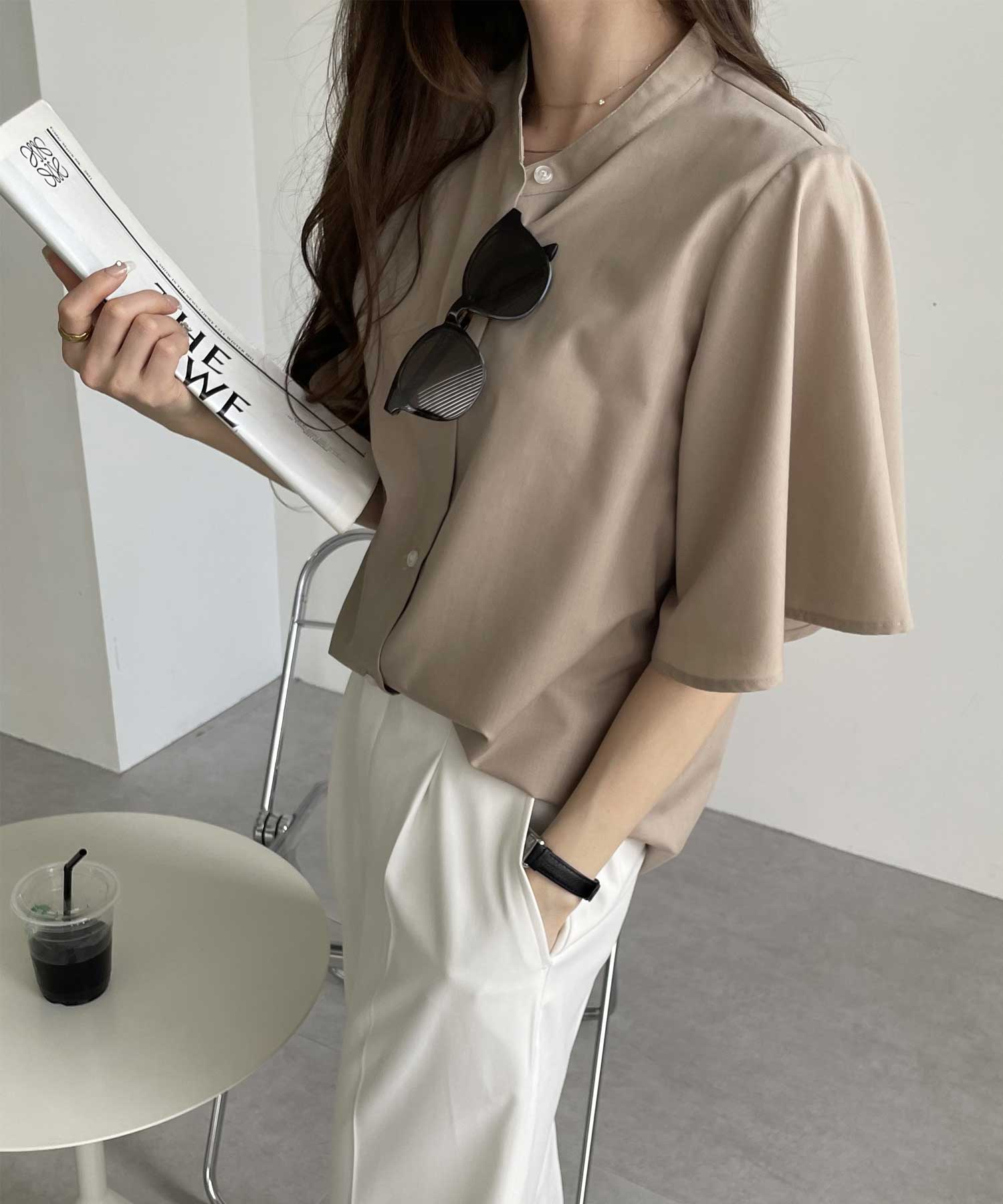 きちんと感のあるバンドカラーと、ふんわりと上品に広がるフレアースリーブが